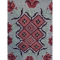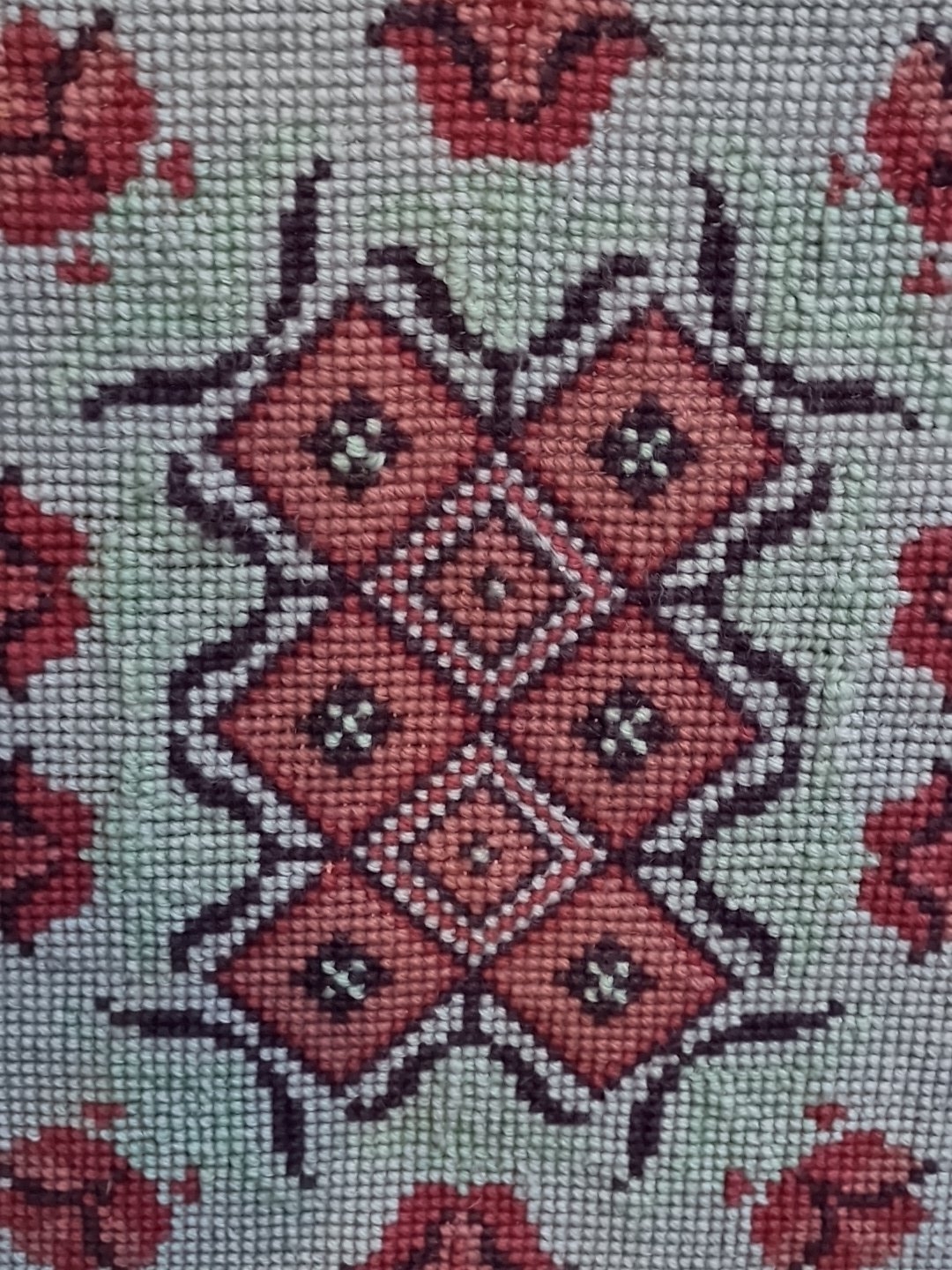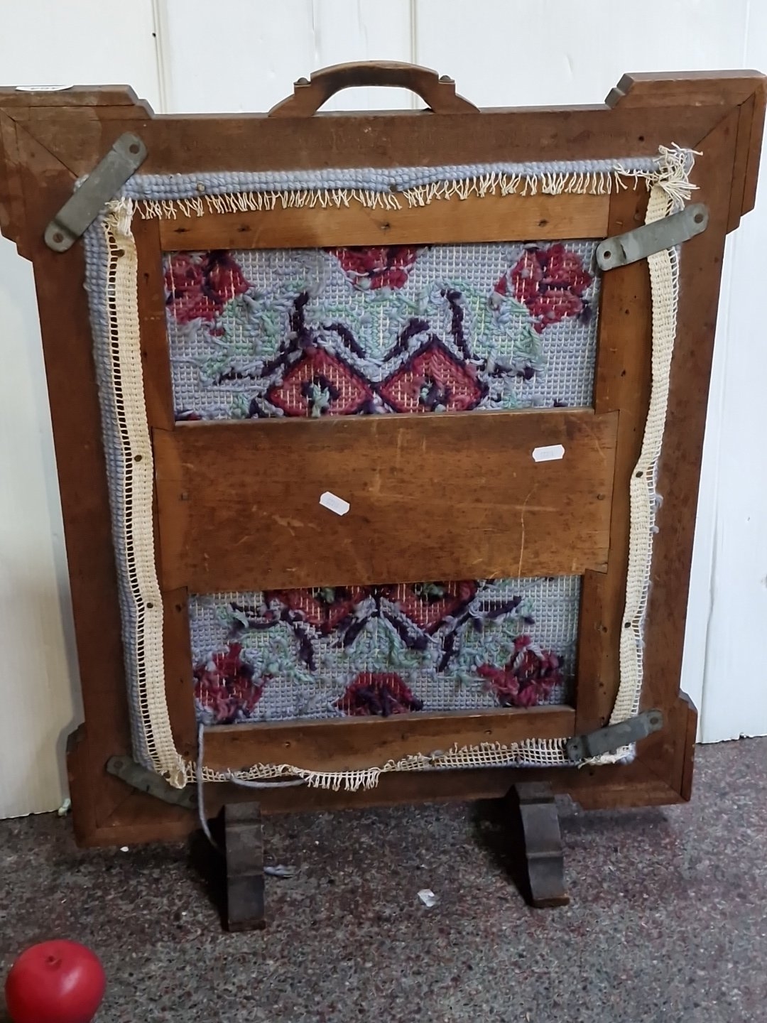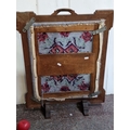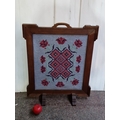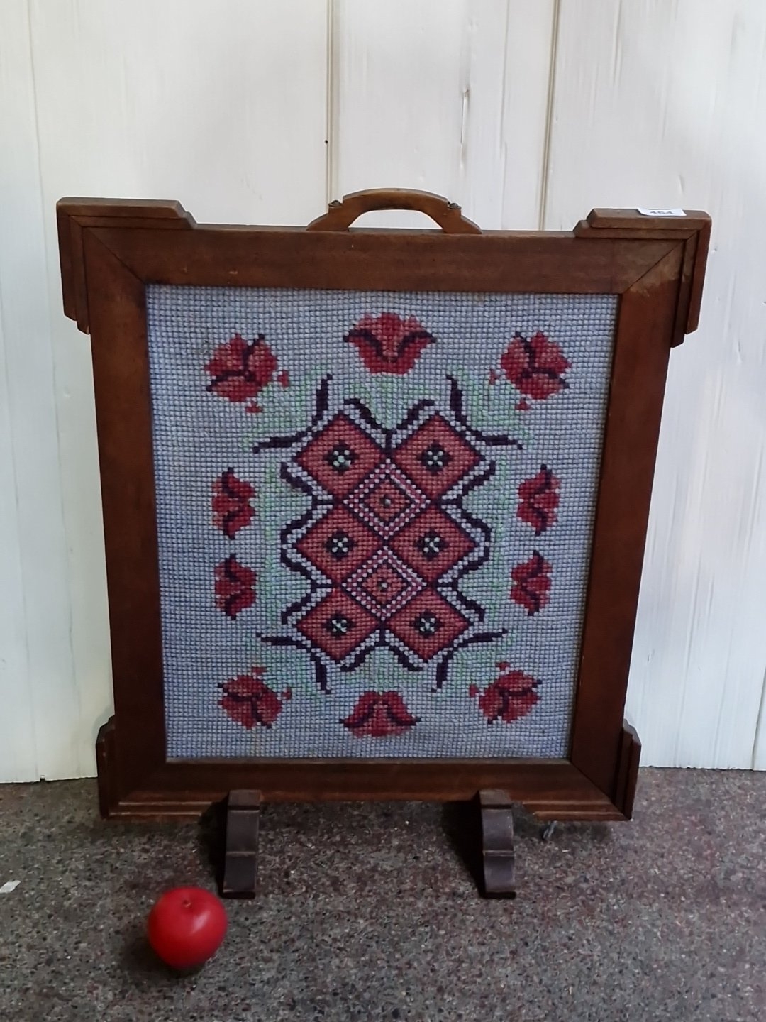 A Handsome oak firescreen, the panel inset with a needlepoint floral and geometric textile in red, black and green on grey ground, with carrying handle and block feet.