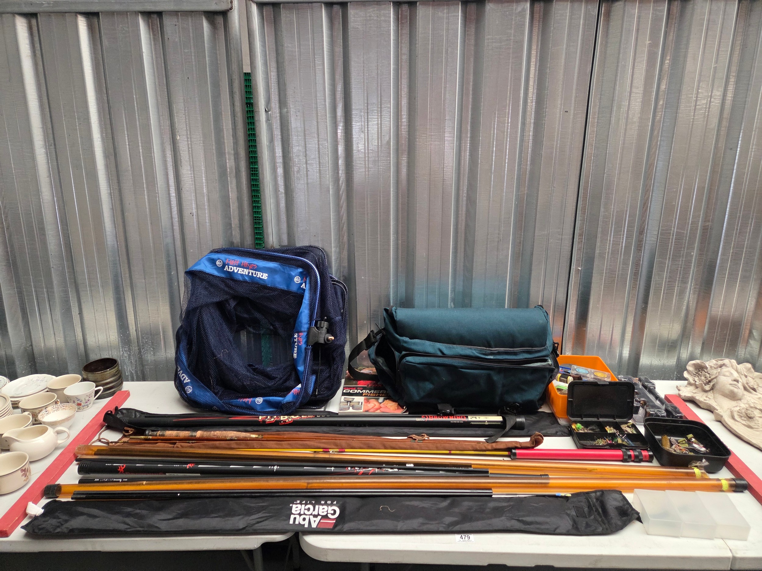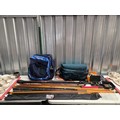 A quantity of fishing items - rods, lures, net bag etc; and a vintage split cane rod
