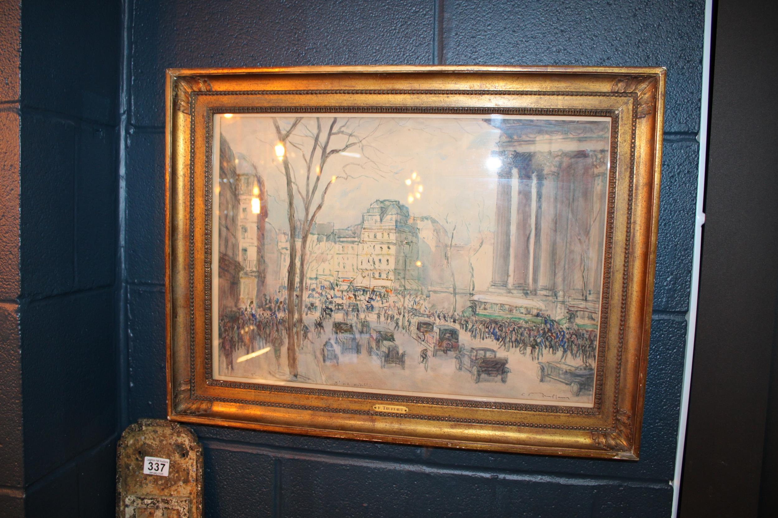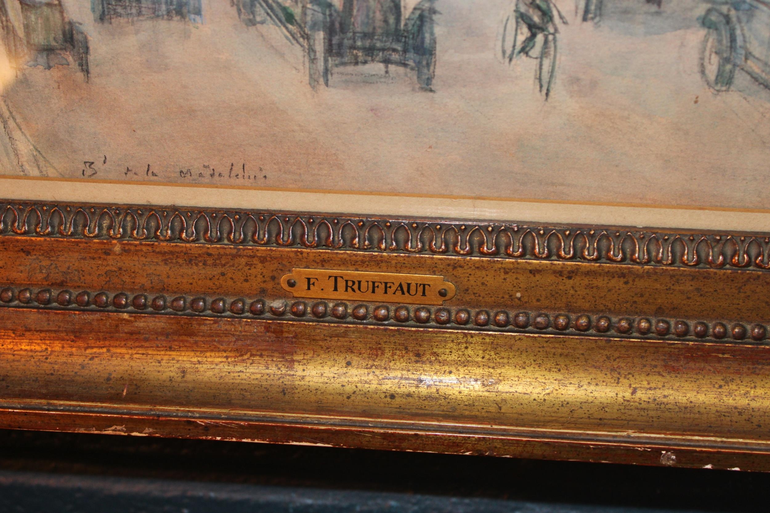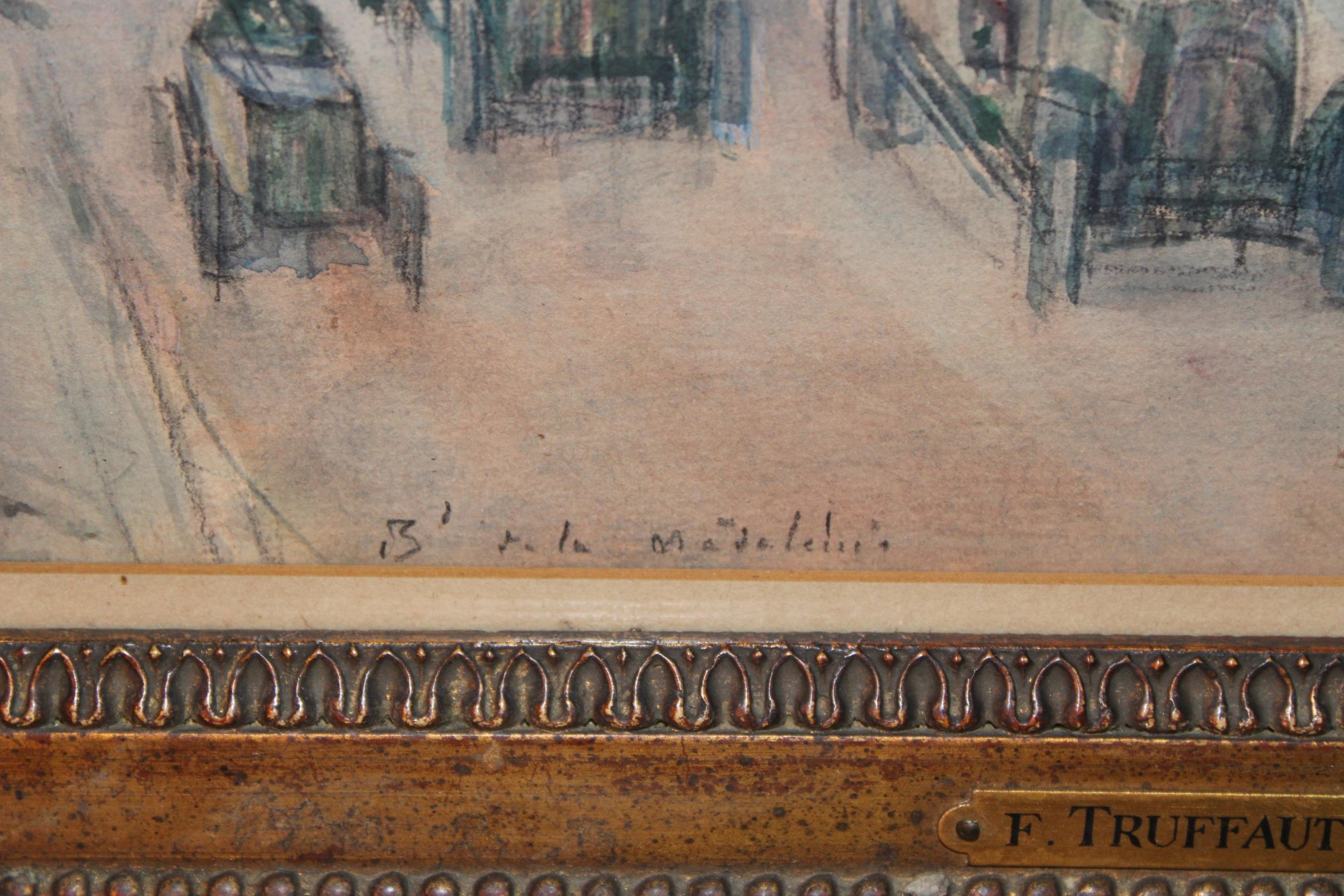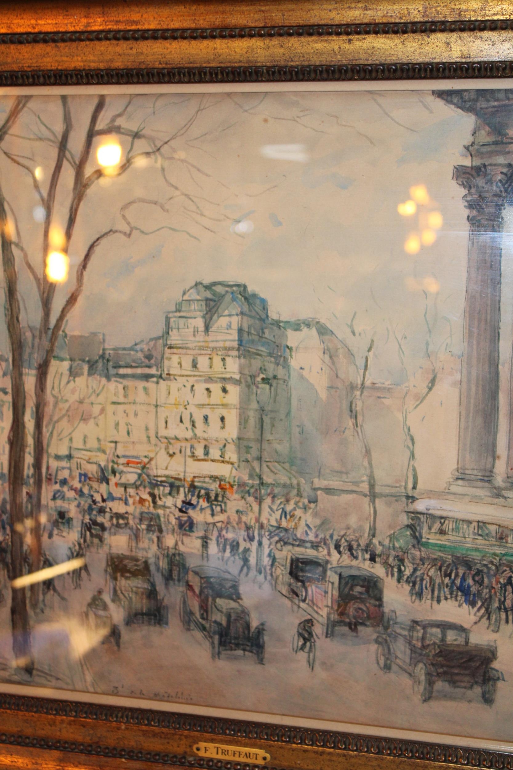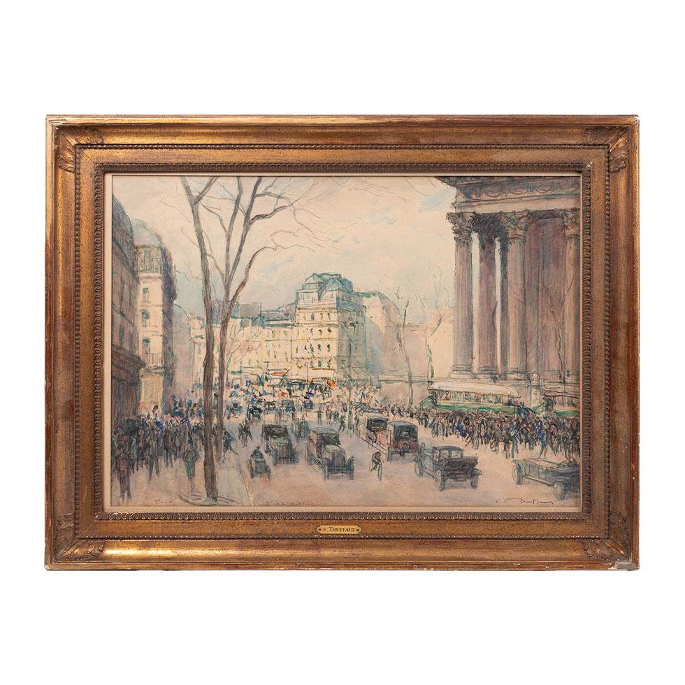 Fernand-Fortuné TRUFFAUT (1866-1955) Watercolour on paper, signed, titled 'Boulevard de la Madeleine' Paris, early 20th century study depicting motorcars and people in the city. In original exhibition frame with plaque 'F. TRUFFAUT'. 37cm x 52cm.