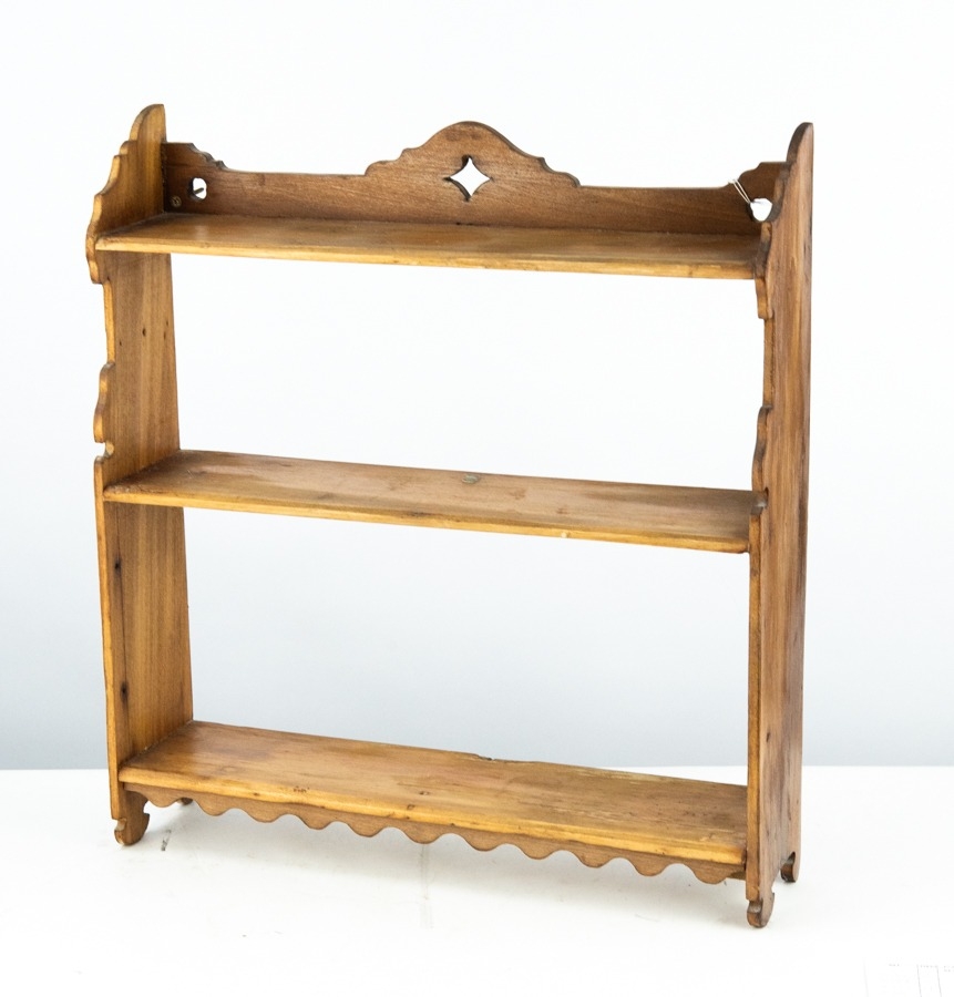 PINE THREE TIER OPEN WALL SHELVES, 21 ½” (54.5cm) high, 19 ½” x 5” (49.5cm x 12.7cm)