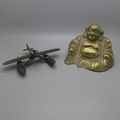 A bronze model schneider trophy seaplane aircraft and a brass model of Buddha