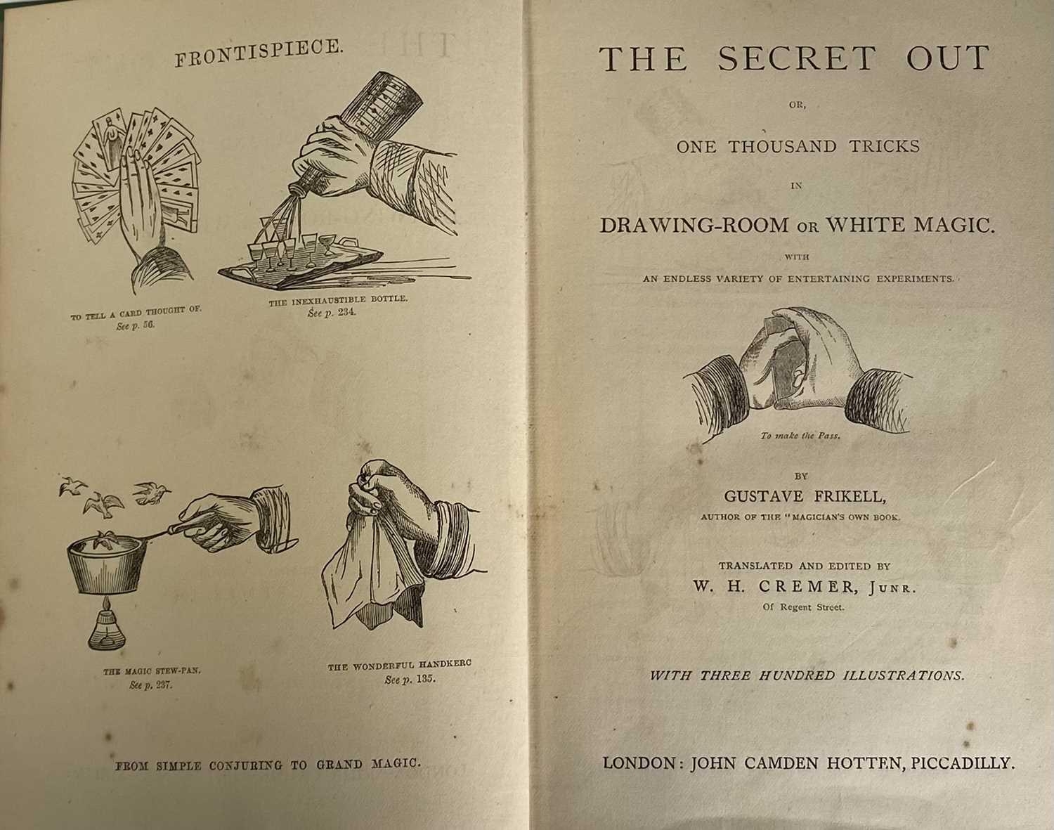 GUSTAVE FRIKELL & W. H. CREMER. 'The Secret Out or, One Thousand Tricks in Drawing-Room or White Magic,' original decorative cloth, vg, advertisements, illustrations throughout, John Camden, London.