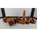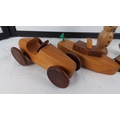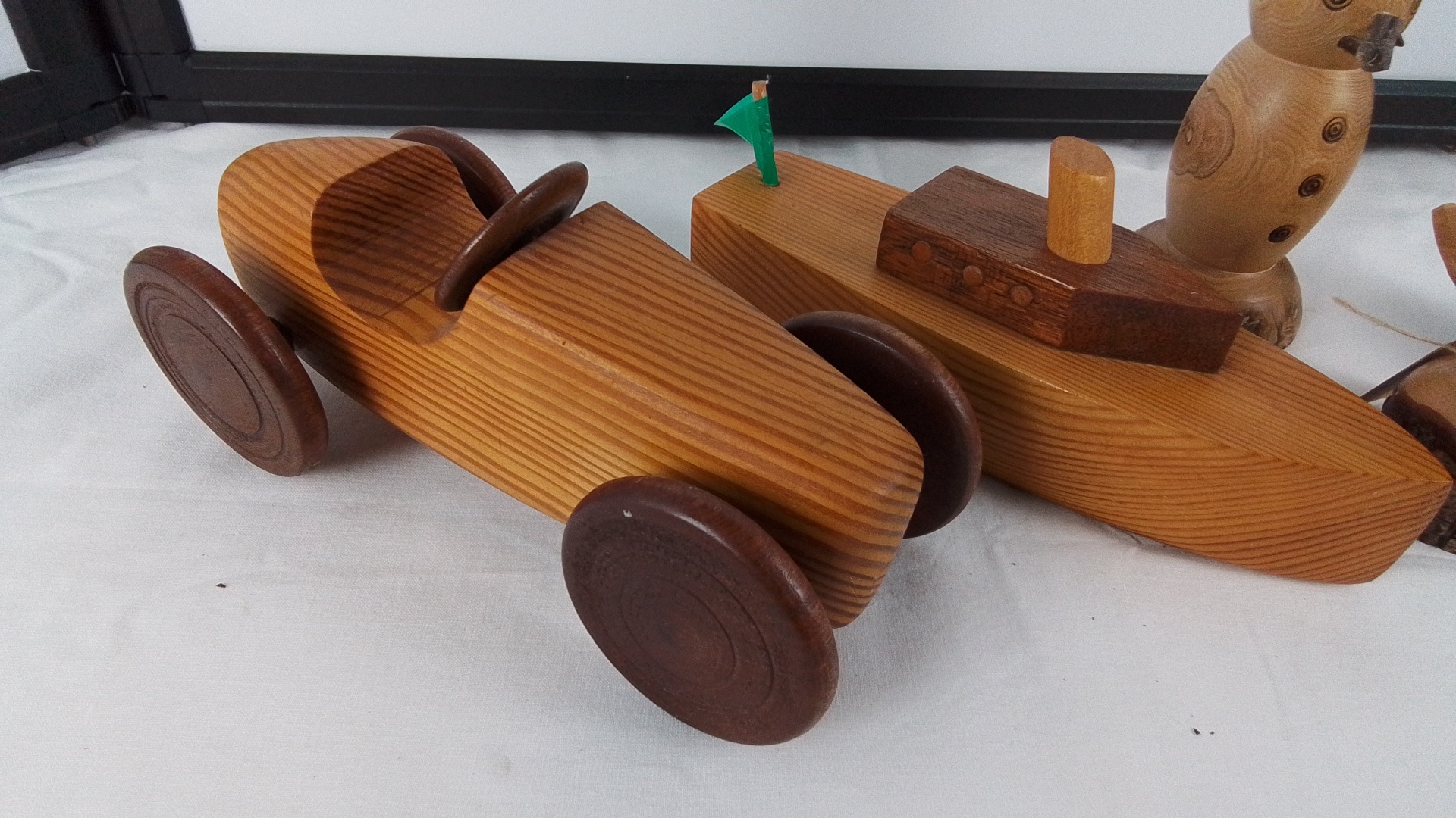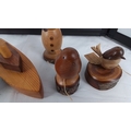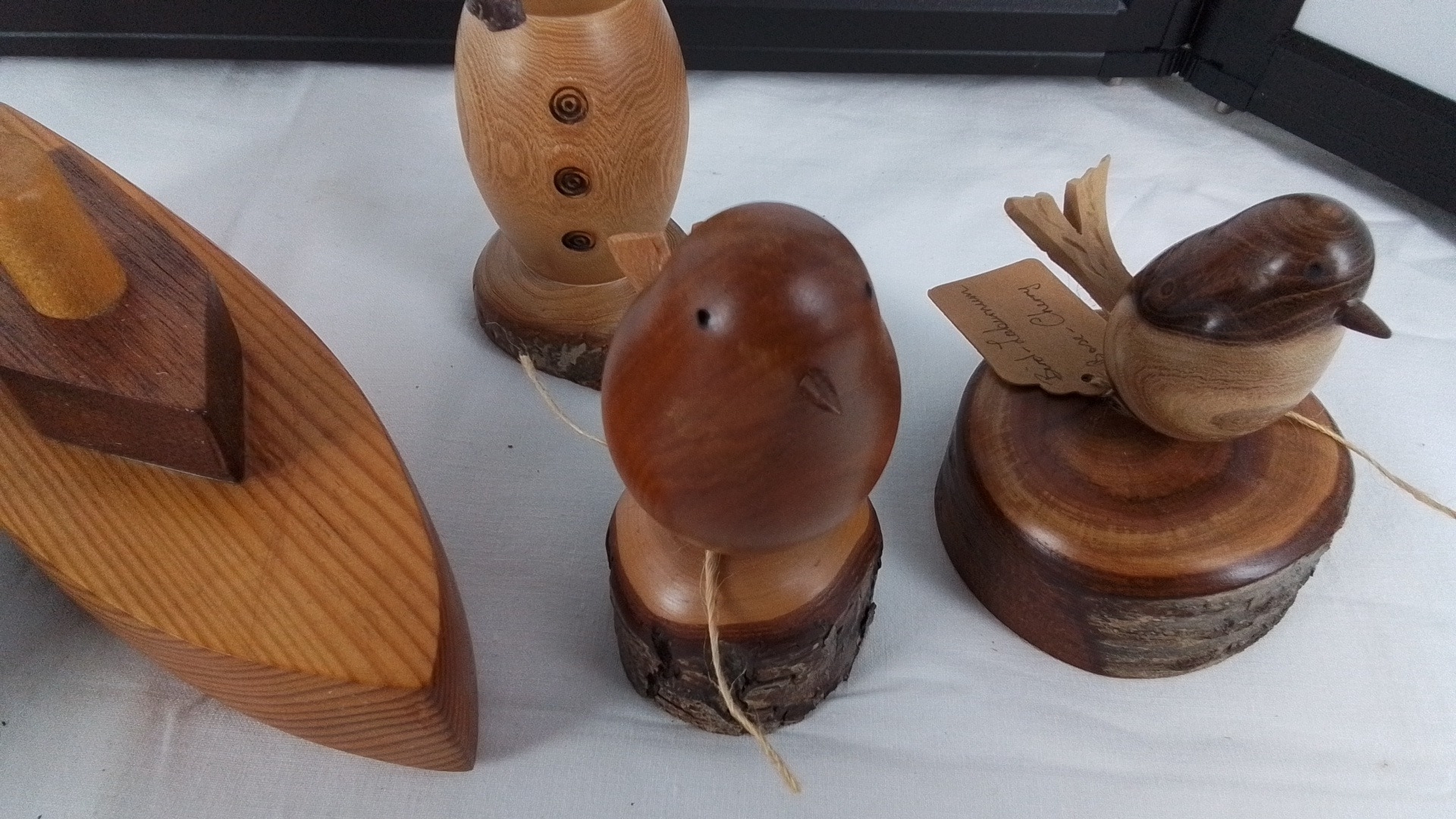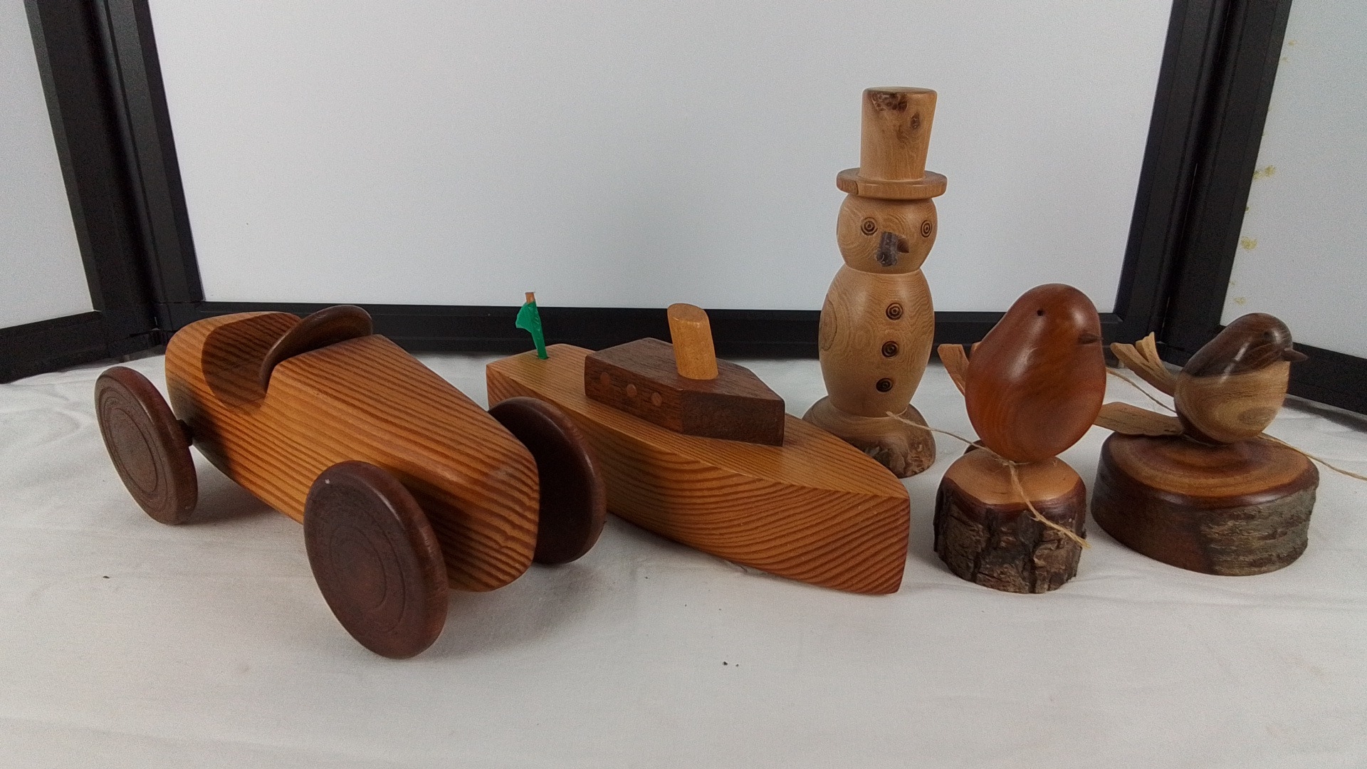 Set of five hand-turned wooden ornaments comprising a toy racing car, toy boat, snowman figure, and two bird studies on naturalistic stump bases.