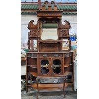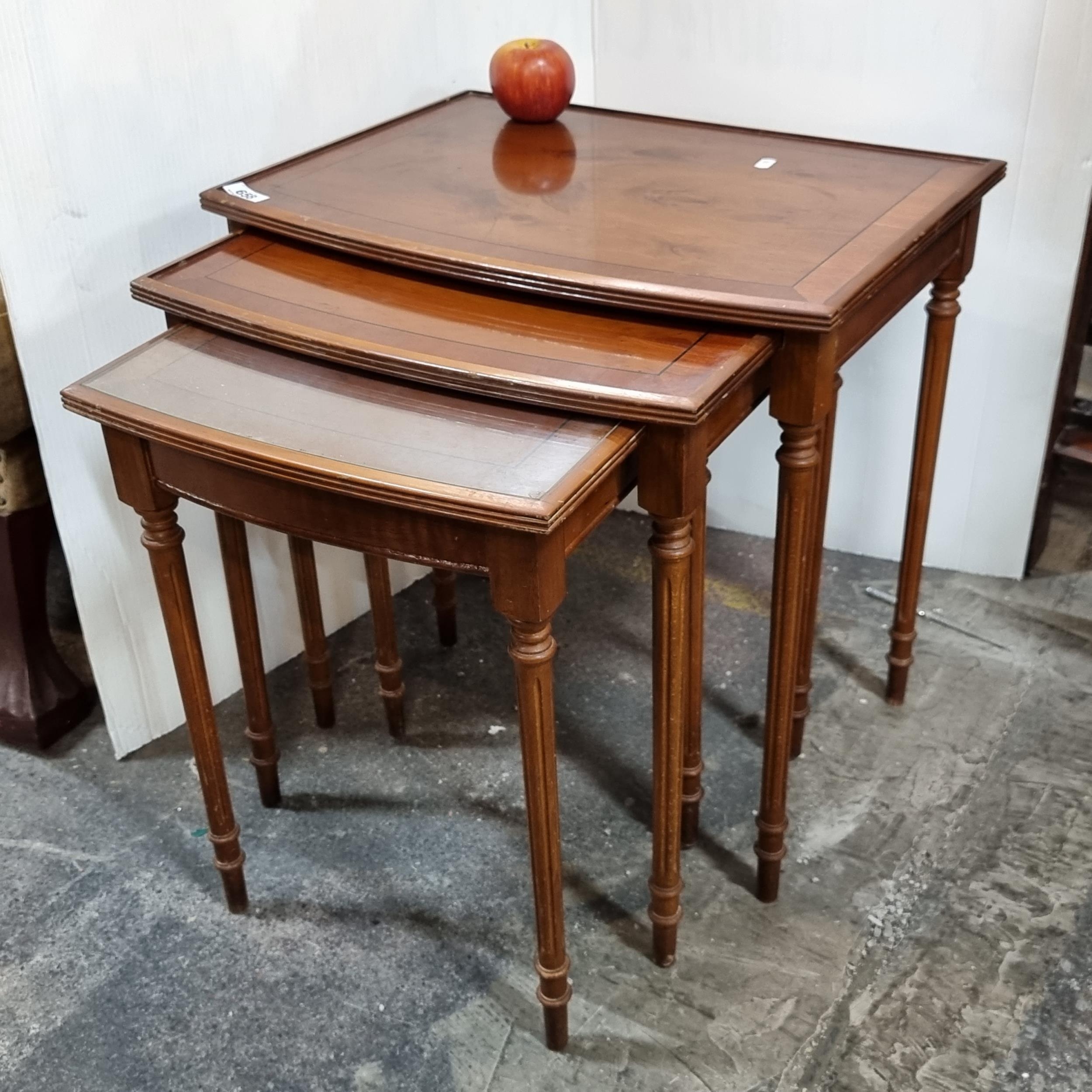 A set of 3 highly polished walnut nesting tables with bow front, black string inlay and elegant fluted column legs. The smallest is fitted with a glass top.