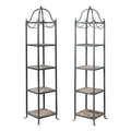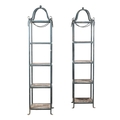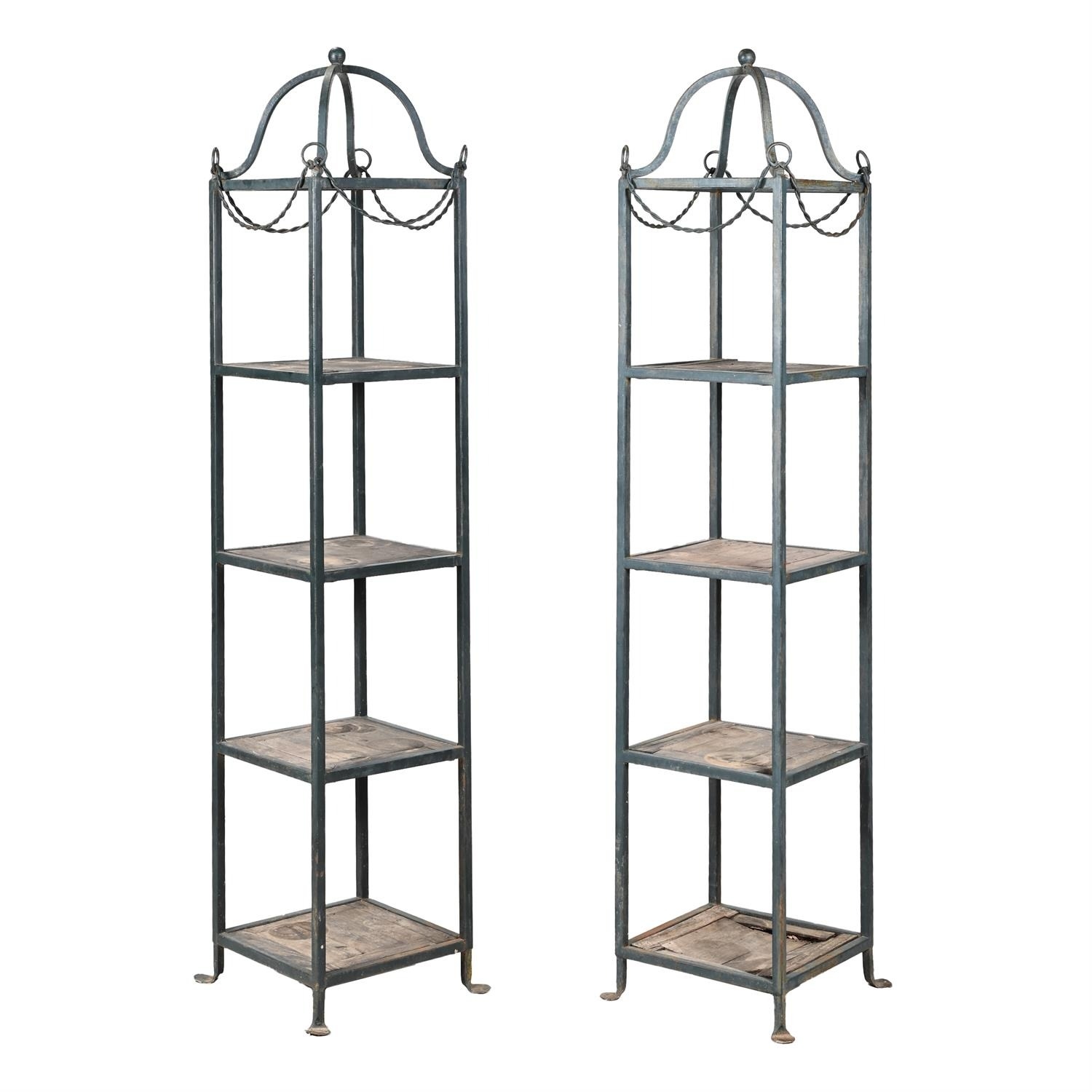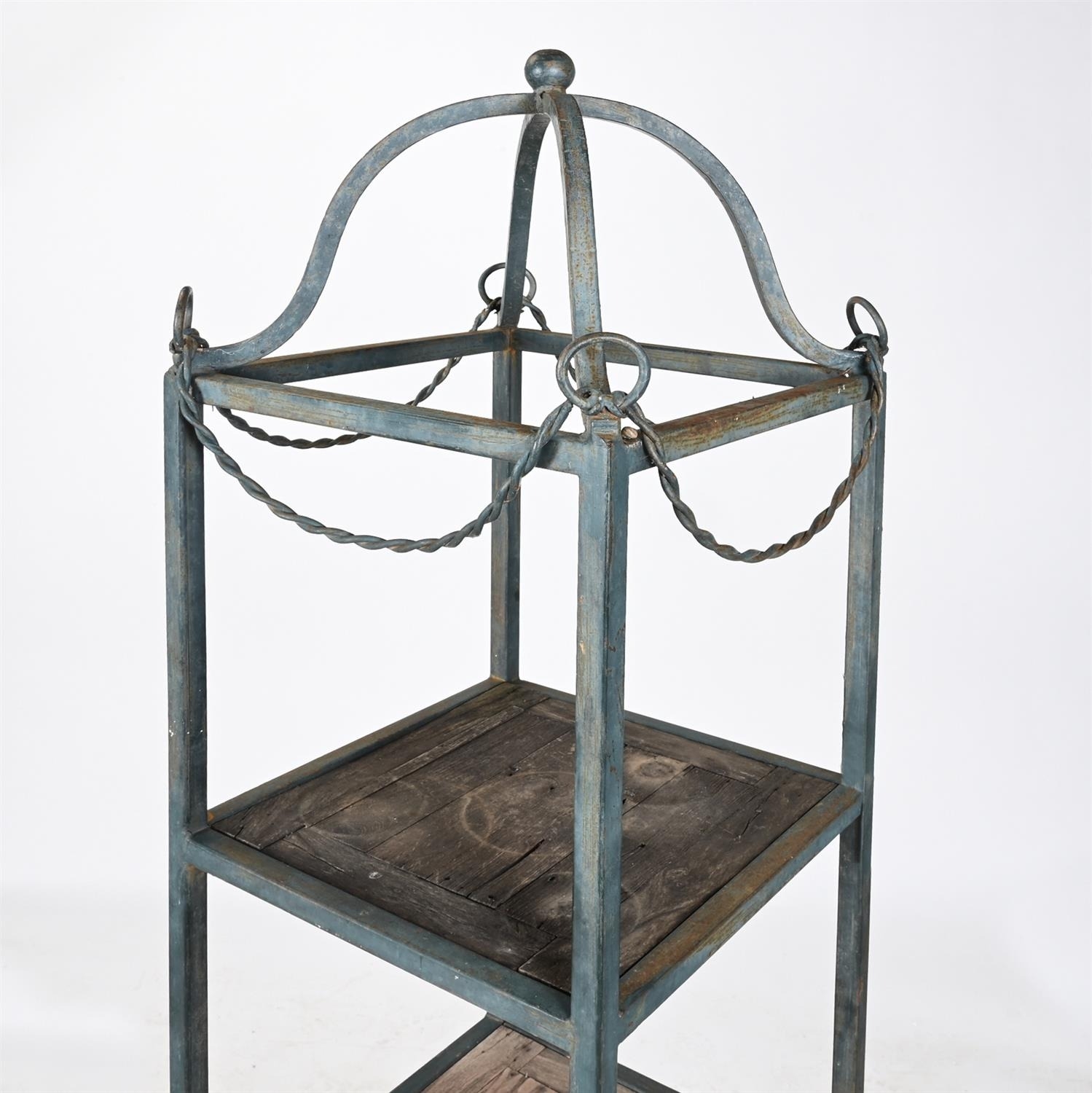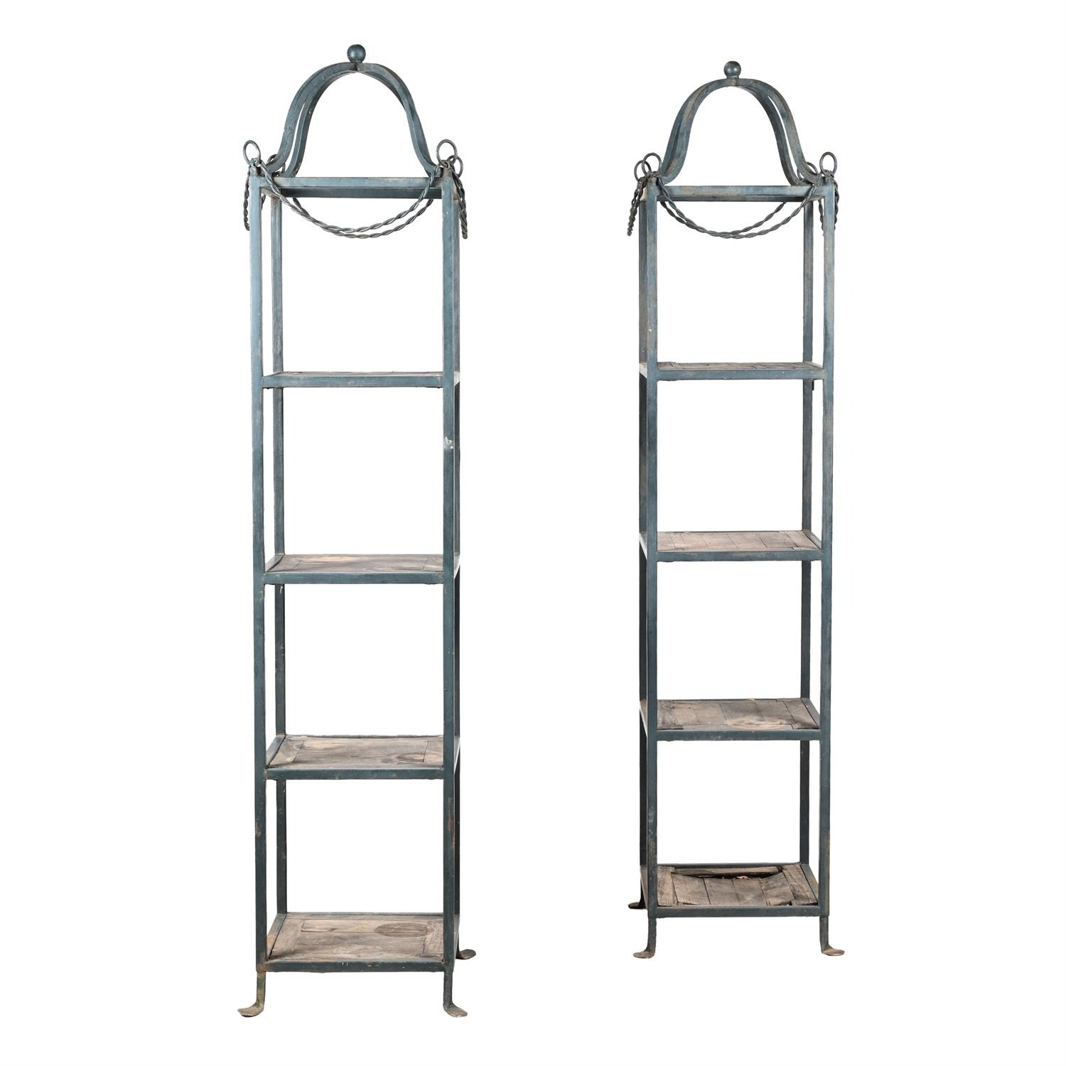 A PAIR OF FOUR-TIERED METAL AND WOODEN PLANT STANDS IN VICTORIAN TASTE, 20TH CENTURY the metal frames painted blue220cm high, 46cm x 46cm
