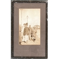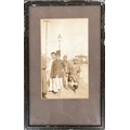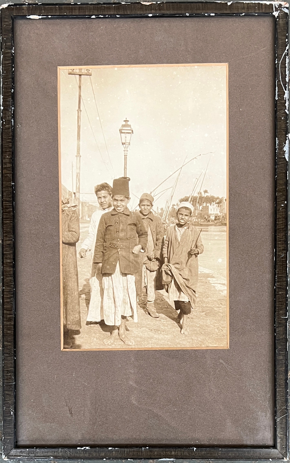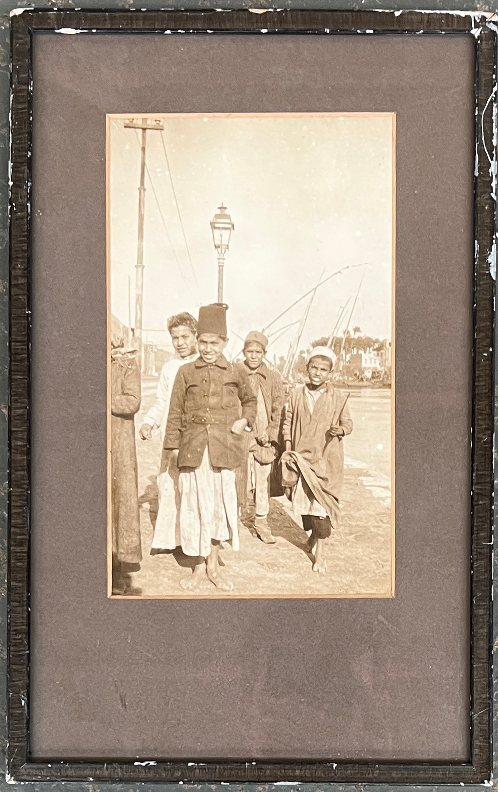 An early 20th century black and white photograph of young boys in a street, 21.5x12.5cm