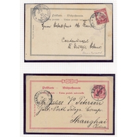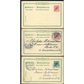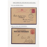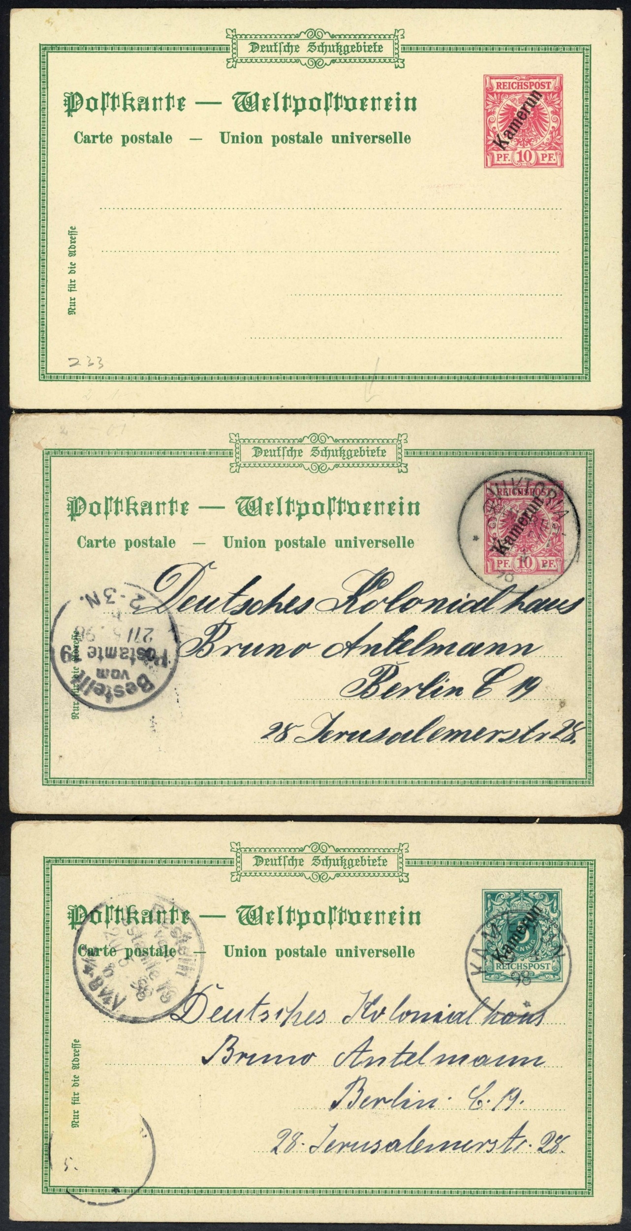 PRIVATELY PRINTED "GRUSS AUS" CARDS: Trio inc. unused 10pf card, 10pf card used 1898 from Viktoria to Berlin, and 16 Apr. 1898 5pf card used from Kamerun (Douala) to Berlin. All three cards are of the same design and feature govt. buildings and a portrait of Governor von Puttkamer (1895-1907), an example of whose 'business' card is included in the lot. (4 items)