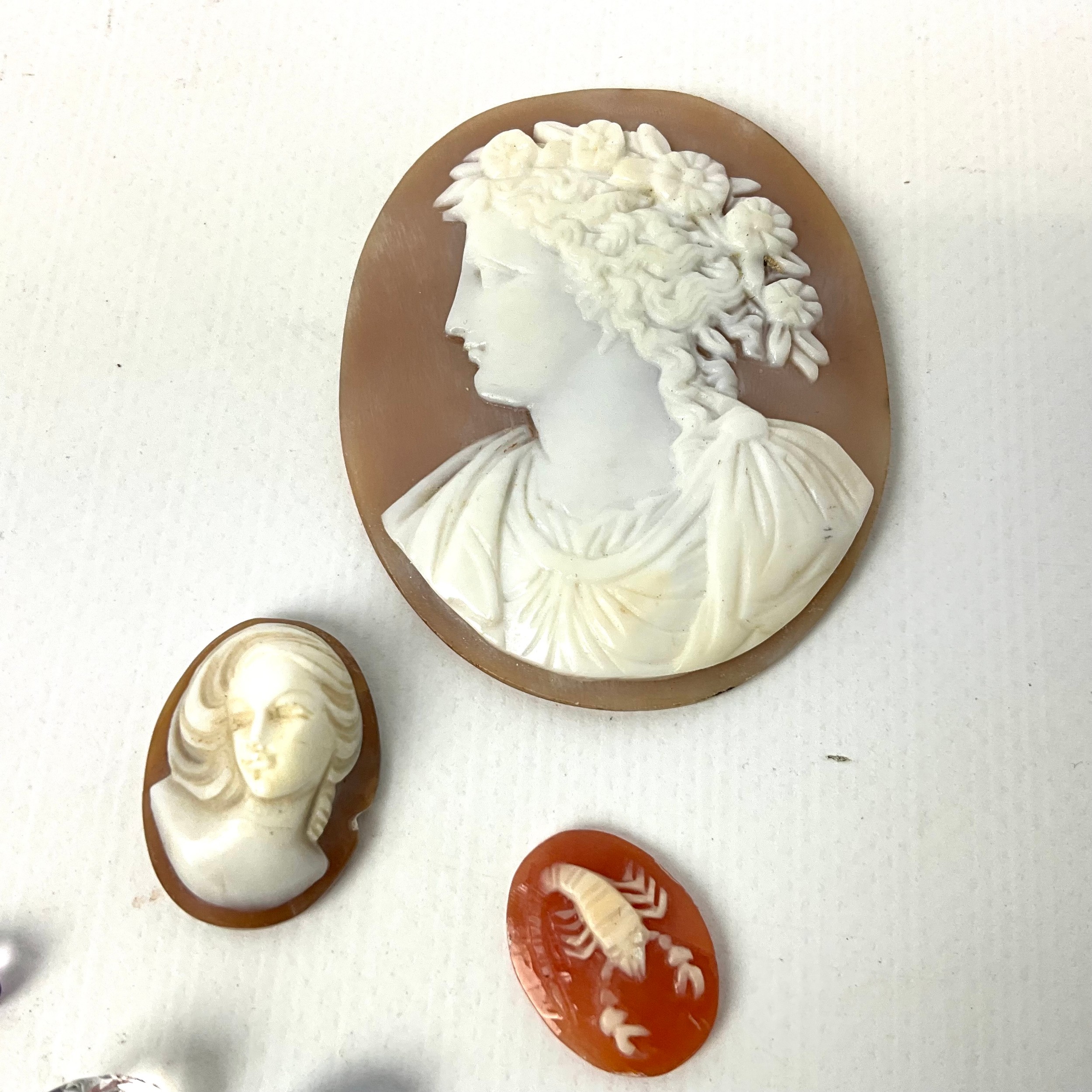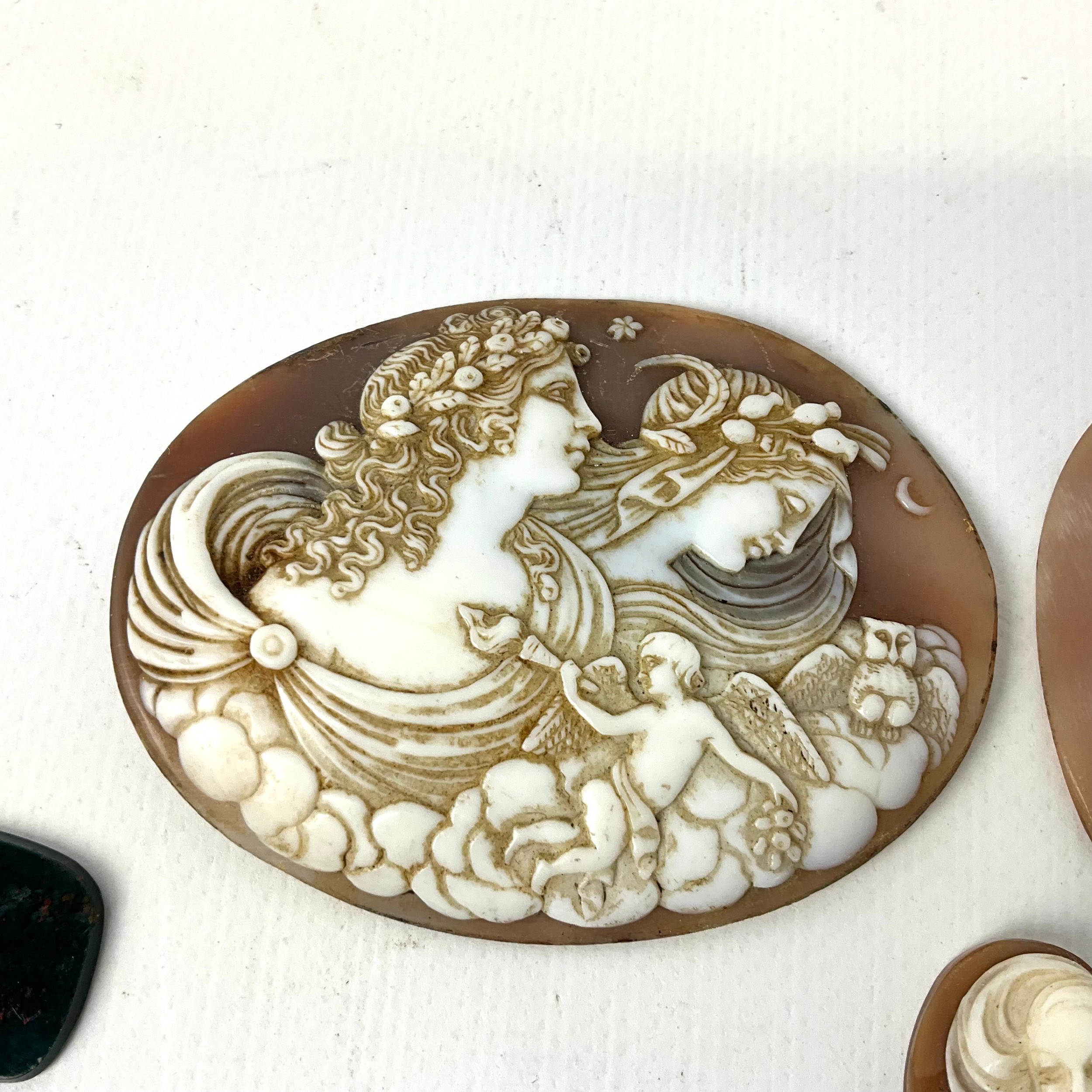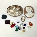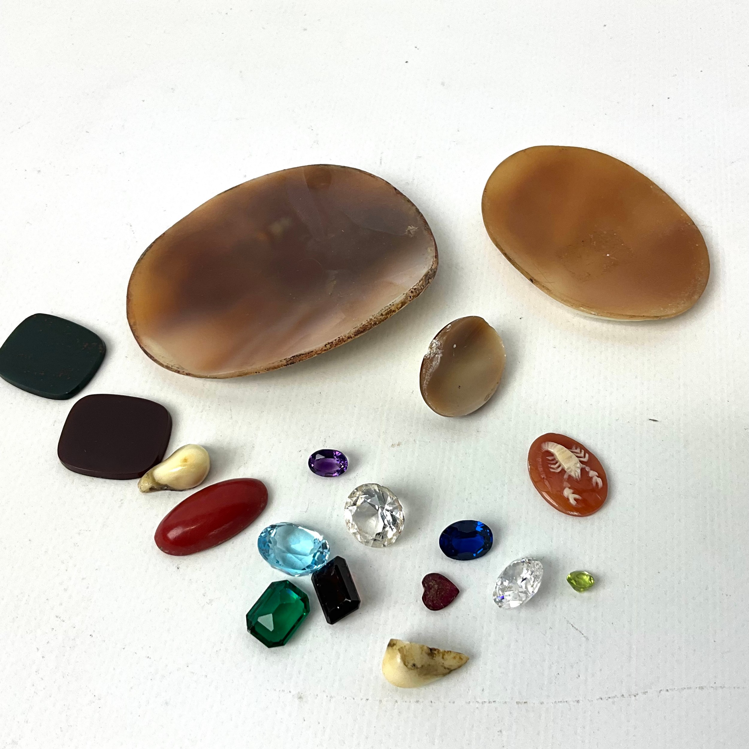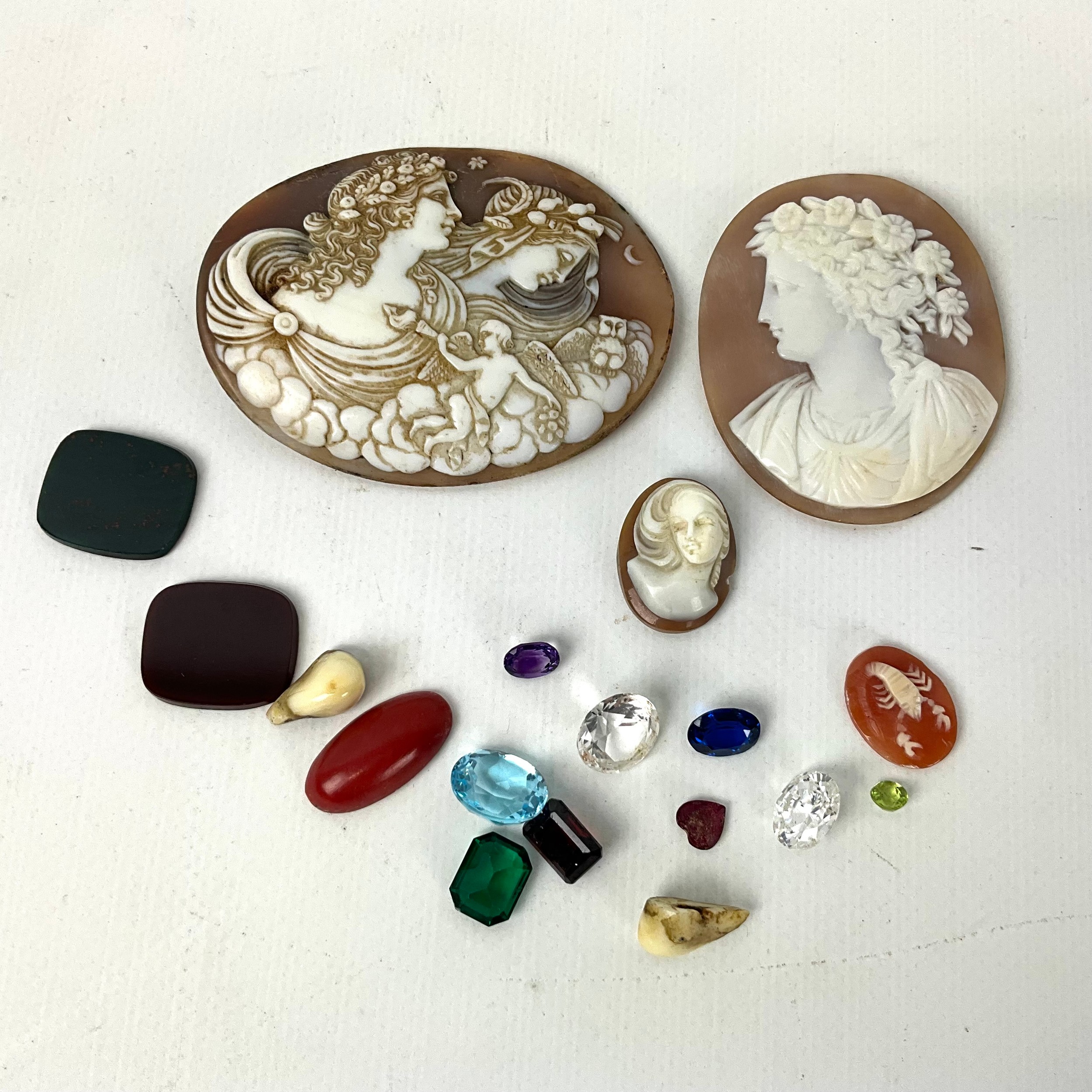 A collection of loose gemstones and cameos, including bloodstone, agate, paste and other gemstones.