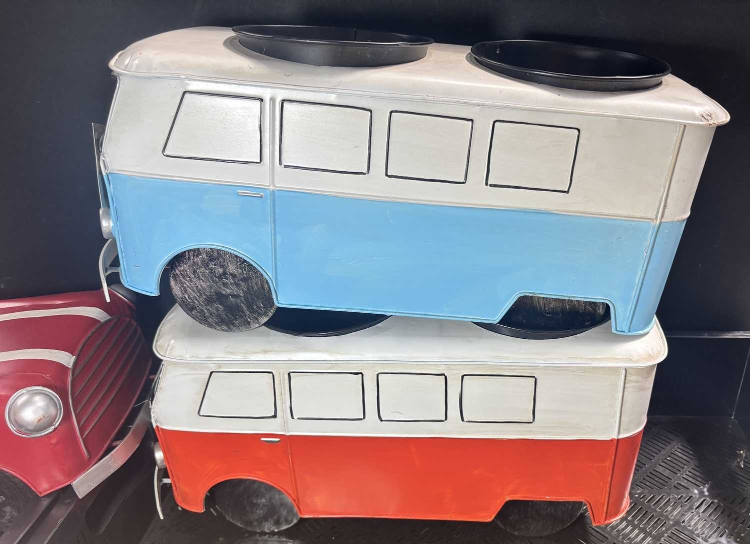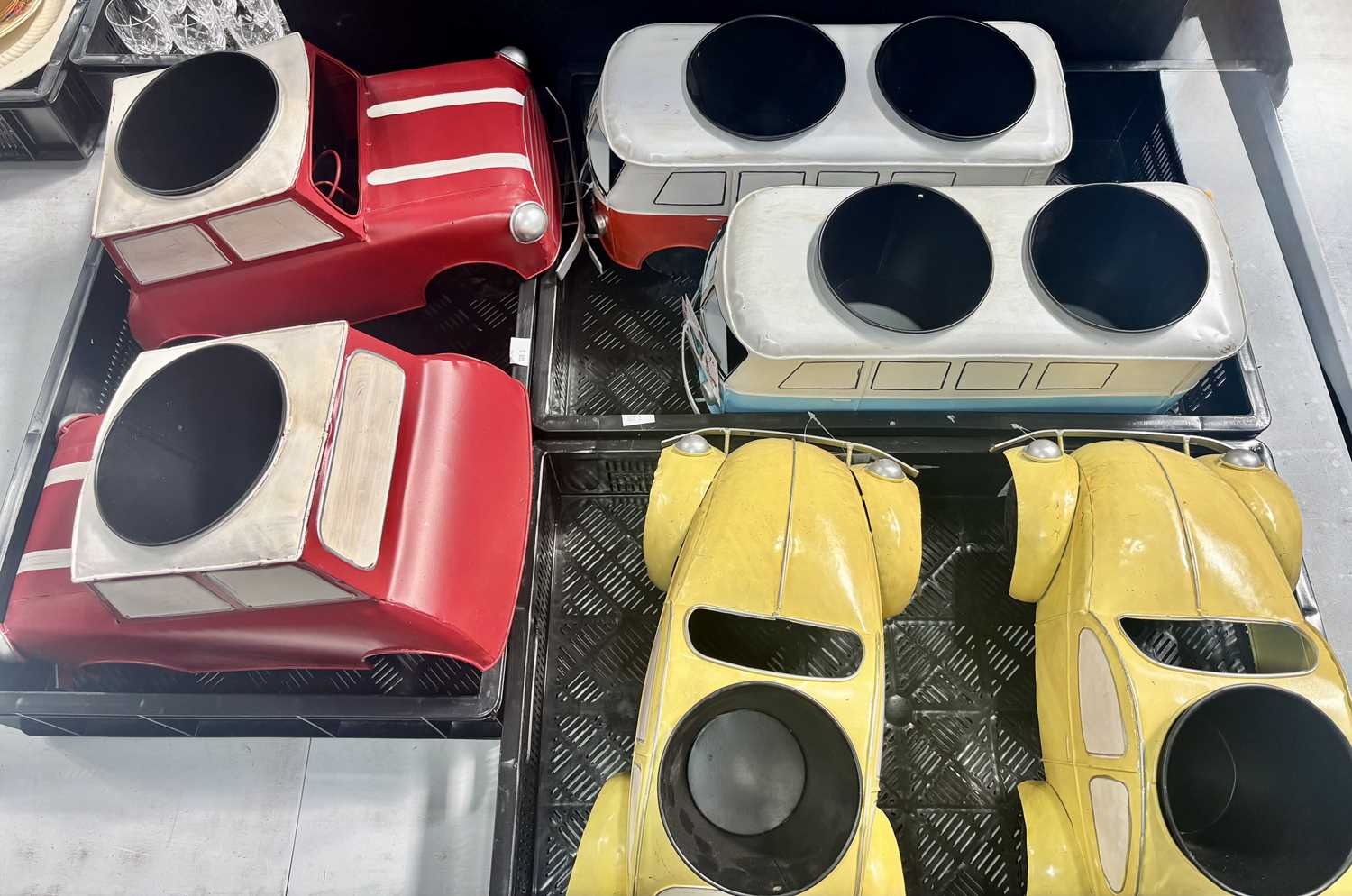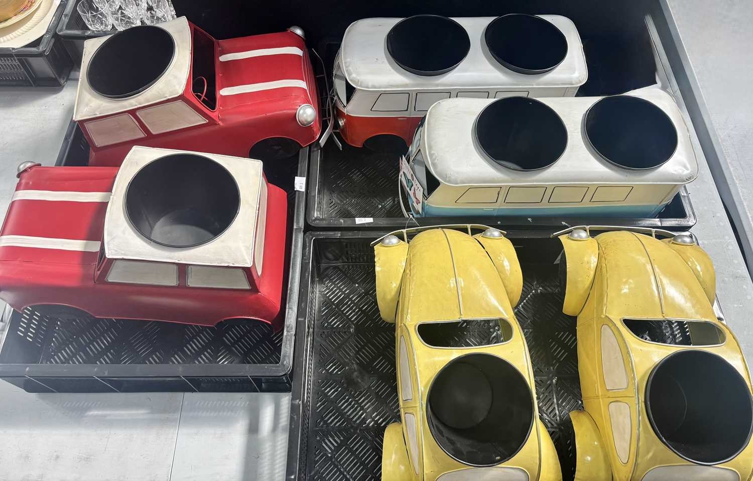A collection of six novelty tinplate planters, two formed as red Mini cars, height 20cm, width 40cm, depth 23cm, two yellow VW Beetles, height 19cm, width 41cm, depth 23cm, and two VW Camper Vans, one red and white the other blue and white, height 21cm, width 43cm, depth 16cm, all with tags and Rega tailed by Olive and Sage (6, 3 trays)