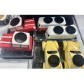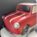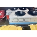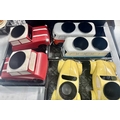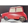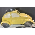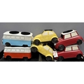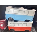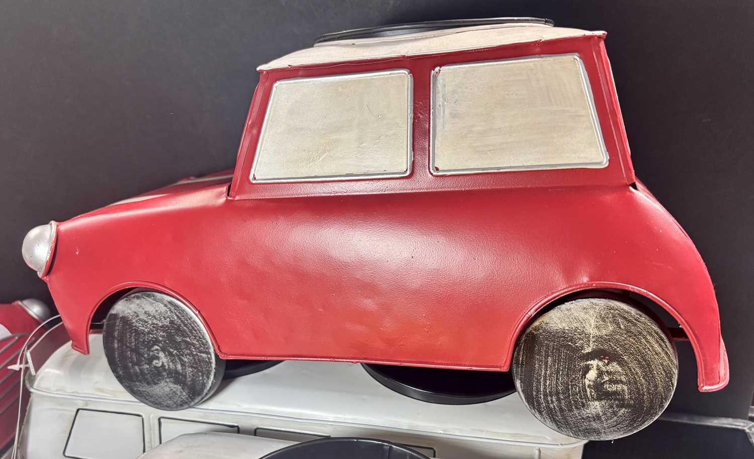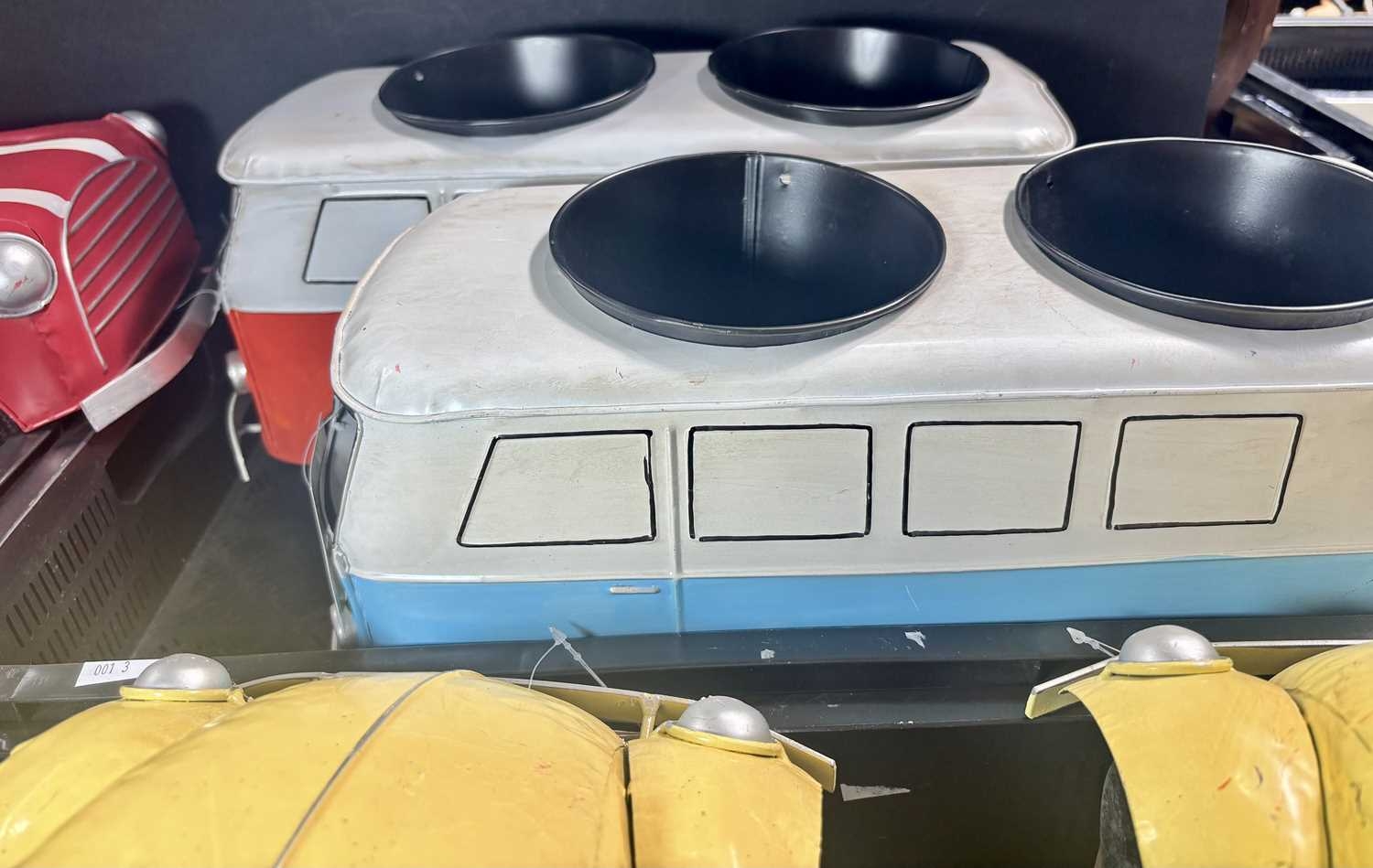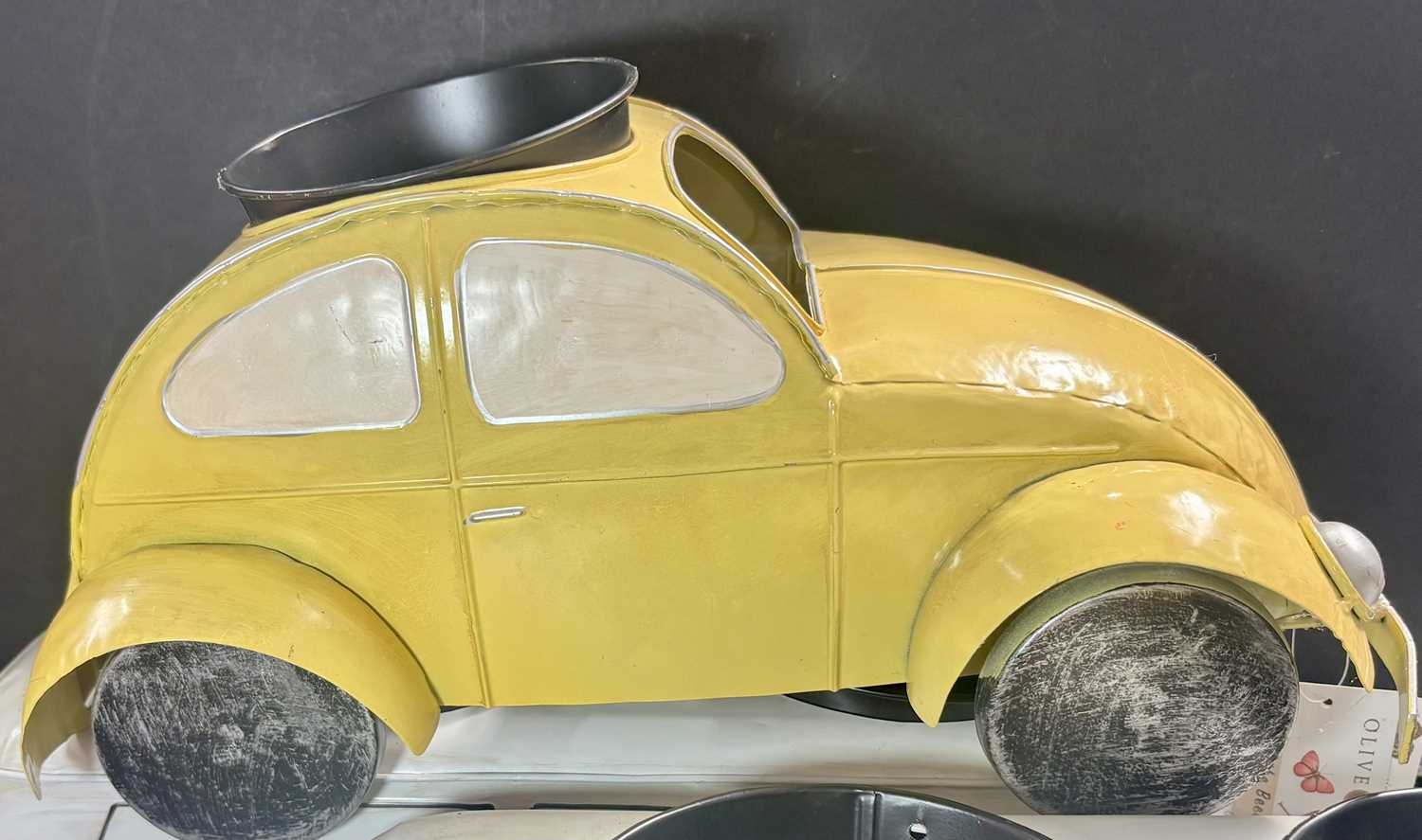 A collection of six novelty tinplate planters, two formed as red Mini cars, height 20cm, width 40cm, depth 23cm, two yellow VW Beetles, height 19cm, width 41cm, depth 23cm, and two VW Camper Vans, one red and white the other blue and white, height 21cm, width 43cm, depth 16cm, all with tags and Rega tailed by Olive and Sage (6, 3 trays)