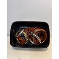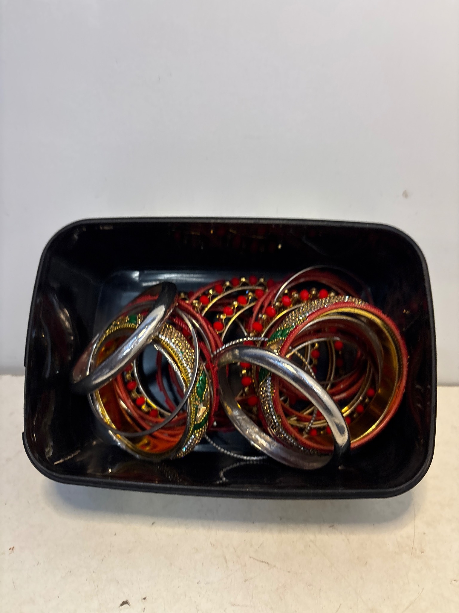 Metal and plastic bangles in a mix of designs and colors, presented within a black container.