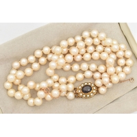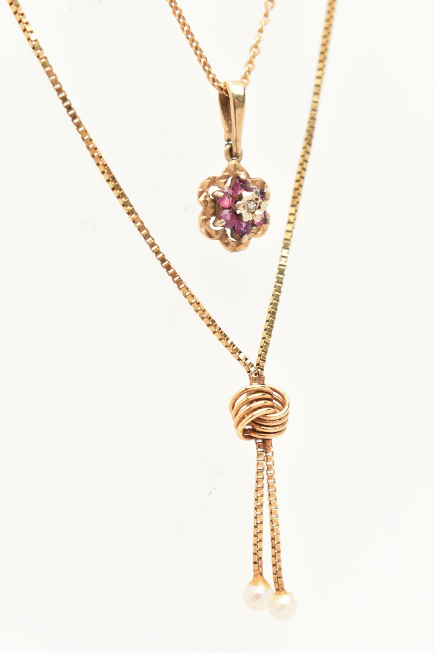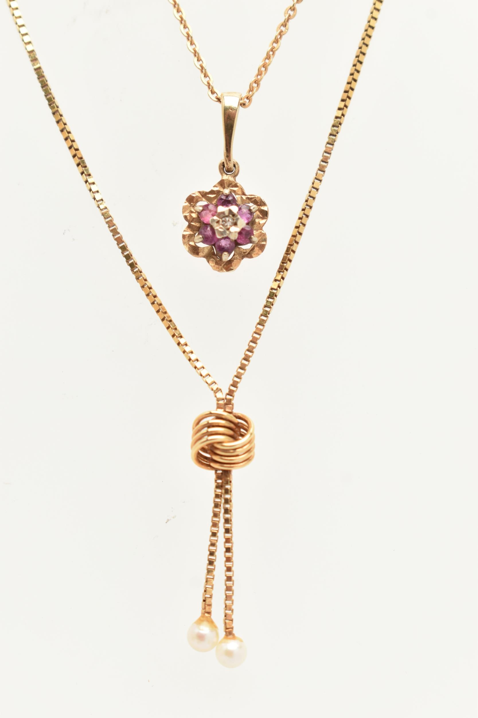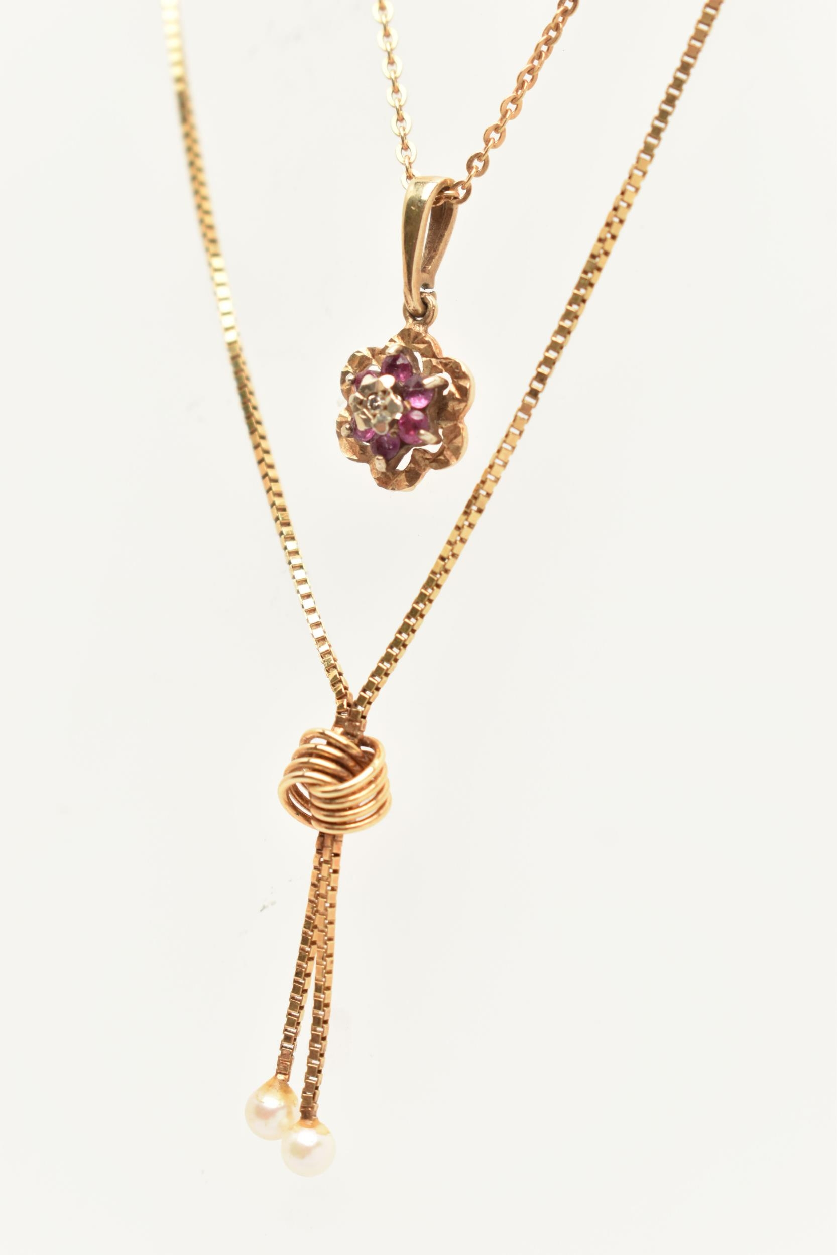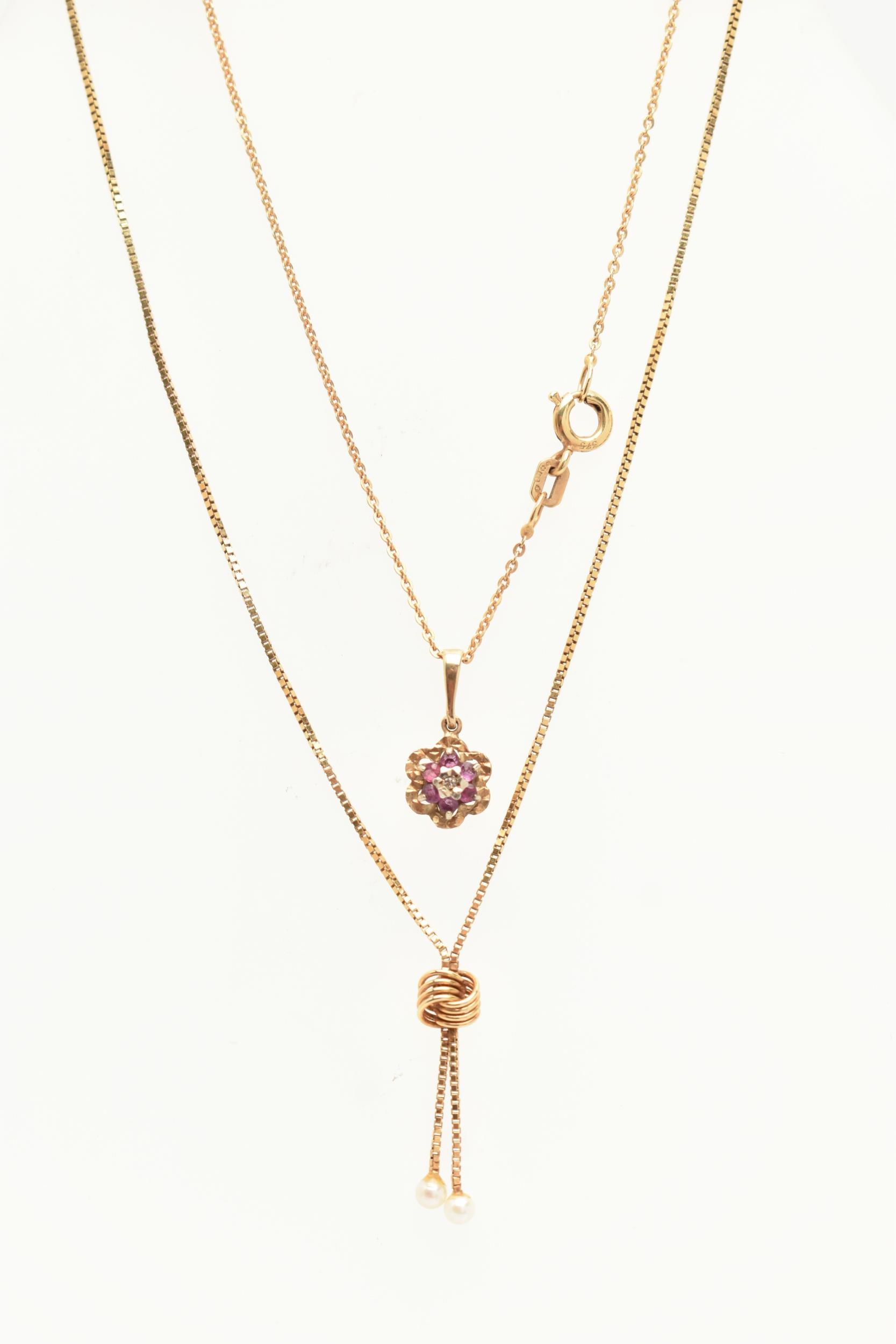 TWO 9CT GOLD PENDANT NECKLACES, the first with a ruby and diamond cluster pendant, fitted with a tapered bail, hallmarked 9ct Birmingham, suspended from a fine trace chain with spring clasp, hallmarked 9ct London import, length 400mm, together with a cultured pearl tassel pendant fixed to a fine box link chain with spring clasp, hallmarked 9ct Sheffield import, length 400mm, approximate gross weight 4.4 grams (condition report: general light wear)