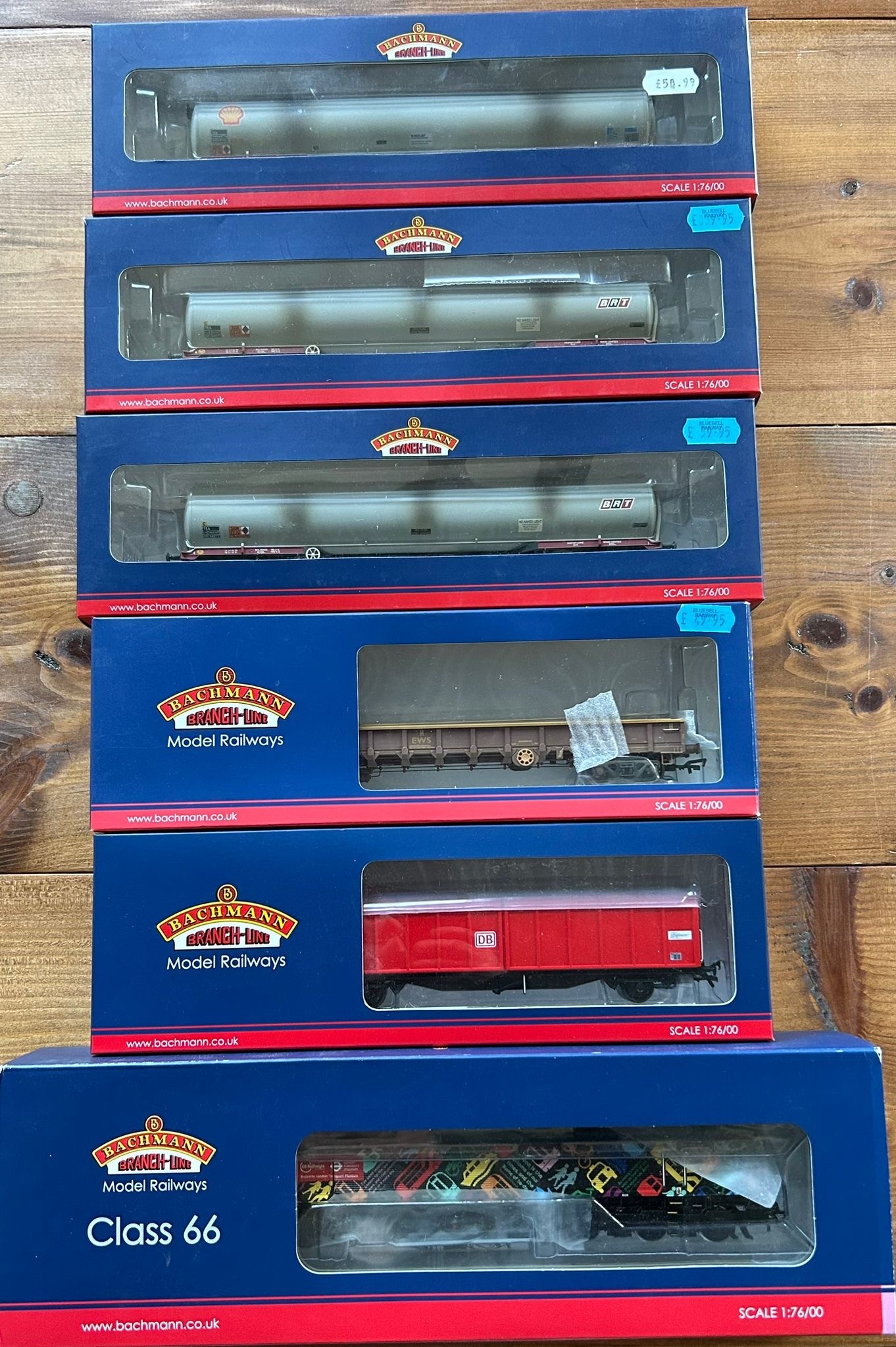 Bachmann Branch-Line OO Railway. A BR Class 66 Diesel Electric Locomotive, 66718 (32-979T). In GBRF London Scenes LTM livery. For Transport For London. Plus 3x 100T Tea Bogie Tank Wagon. An MOA Low sided Bogie Box Wagon, all weathered. Plus an Ex BR RBA Van in DB livery. All boxed. Contents looks to be as new.