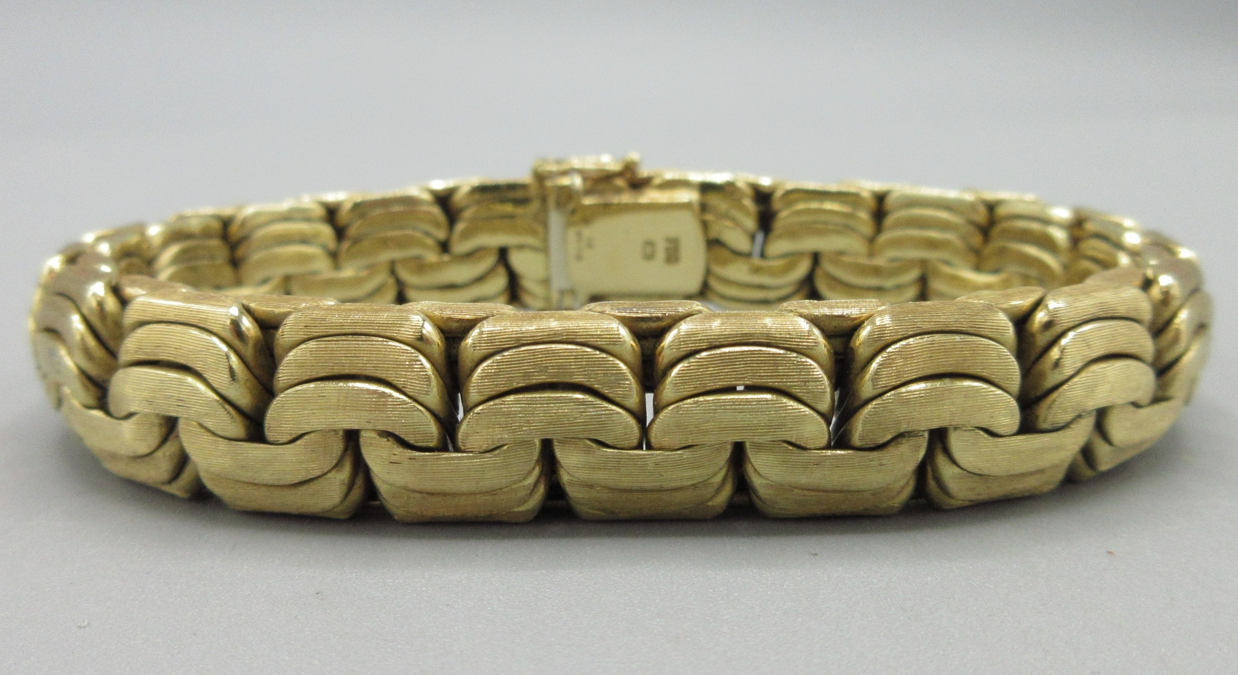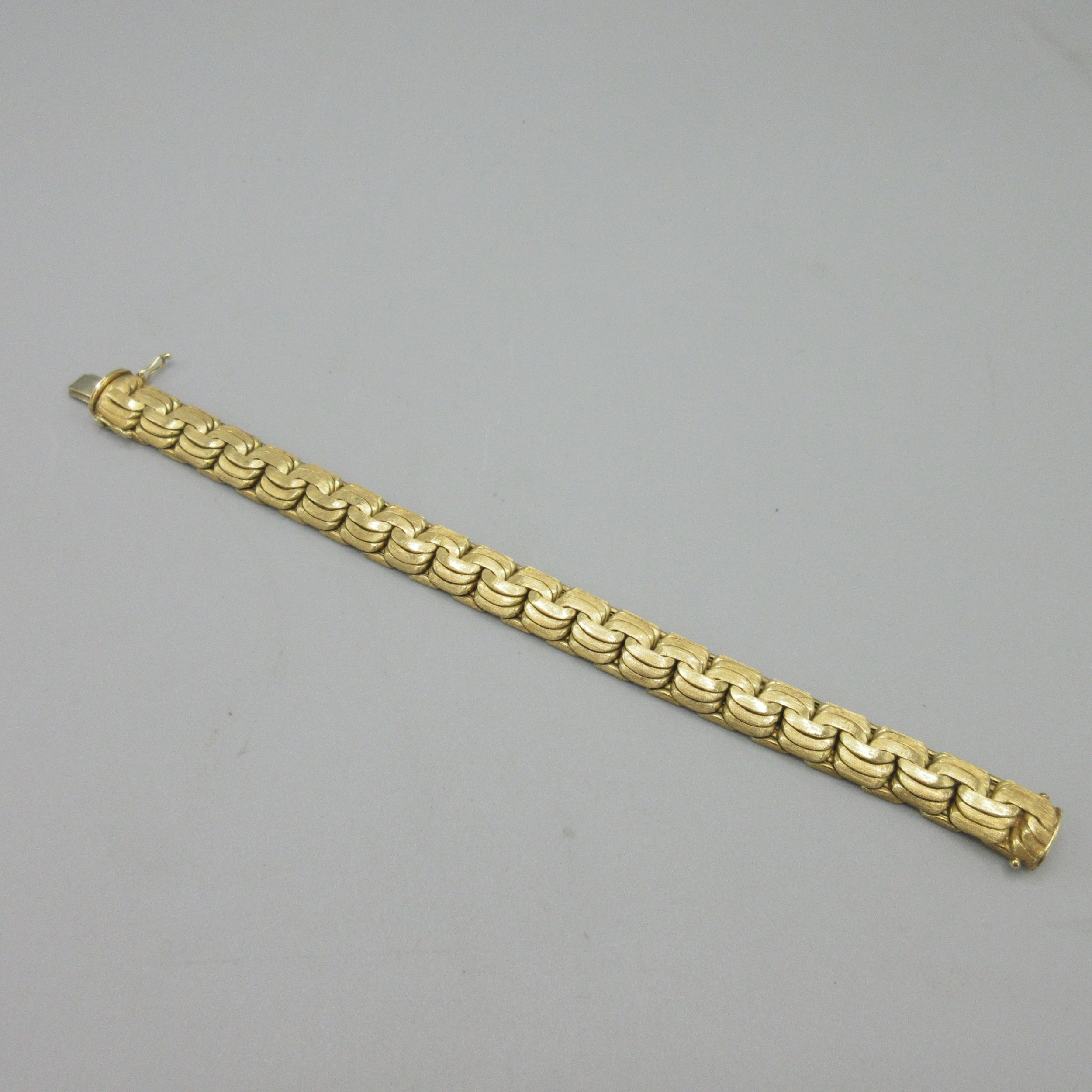 18ct yellow gold woven link bracelet with Florentine finish, stamped 750, L19cm, 51.6g