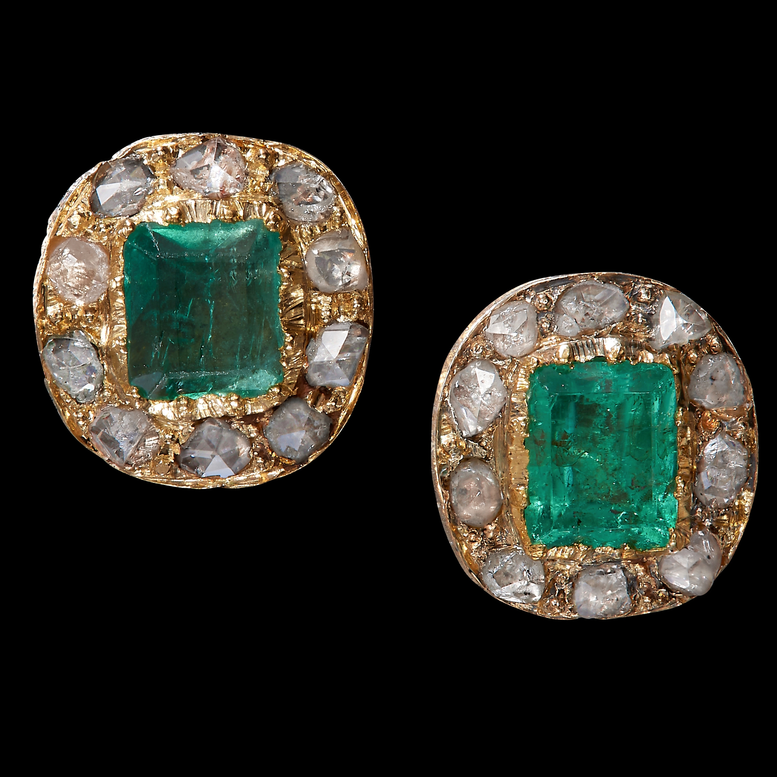 PAIR OF ANTIQUE EMERALD AND DIAMOND CLUSTER EARRINGS, Set with vibrant emerald and lively diamonds. L 1.2 cm. 3.2 gams.