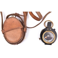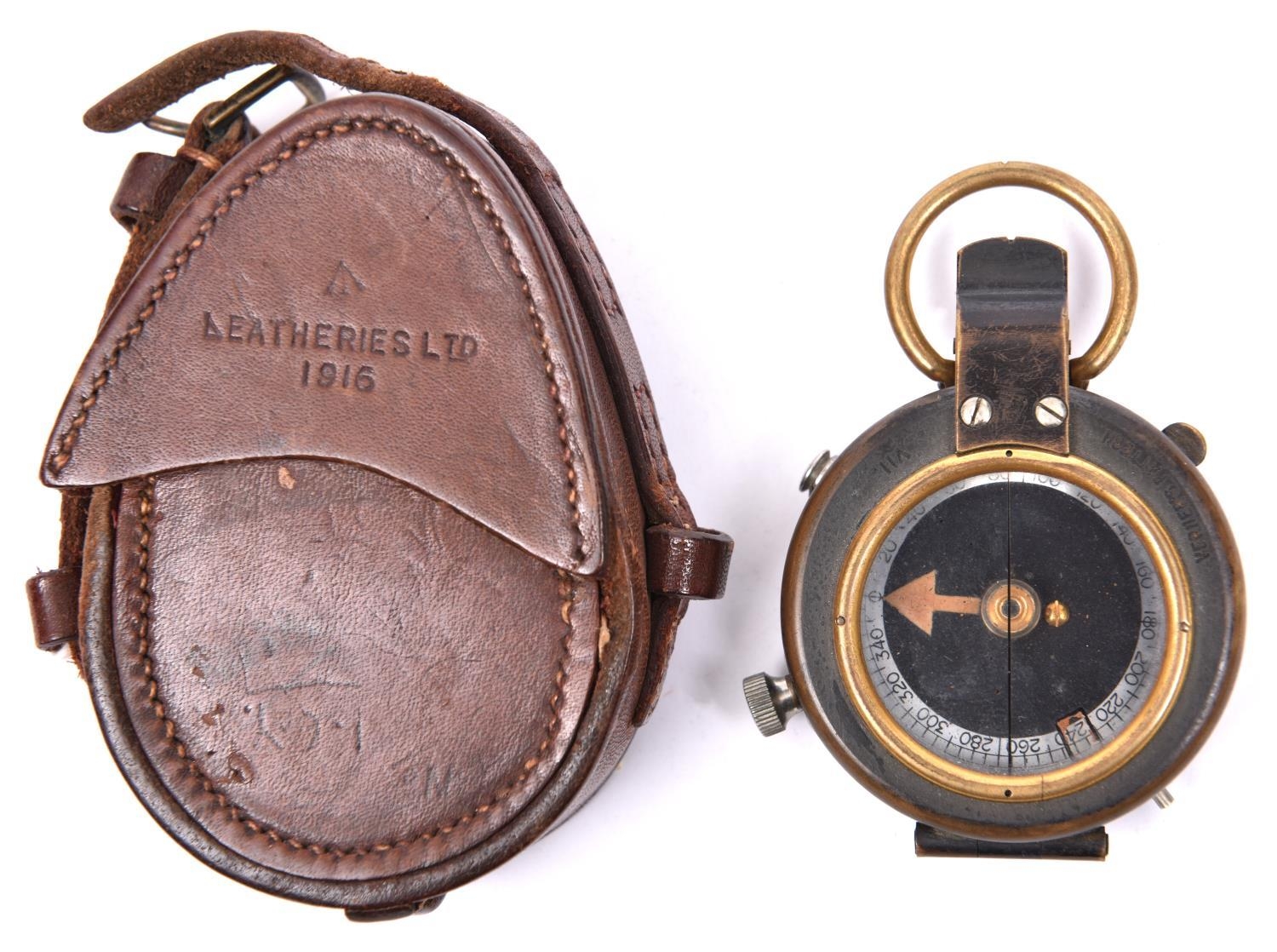A WWI prismatic marching compass by Short & Mason Ltd, London, number 42735, marked with broad arrow between “AE” and dated “1916”, the front marked “Vernier’s Pattern VII”, with MOP dial, in its leather case stamped with broad arrow and “Leatheries Ltd 1916”. GC (leather stitching slightly loose). £60-80