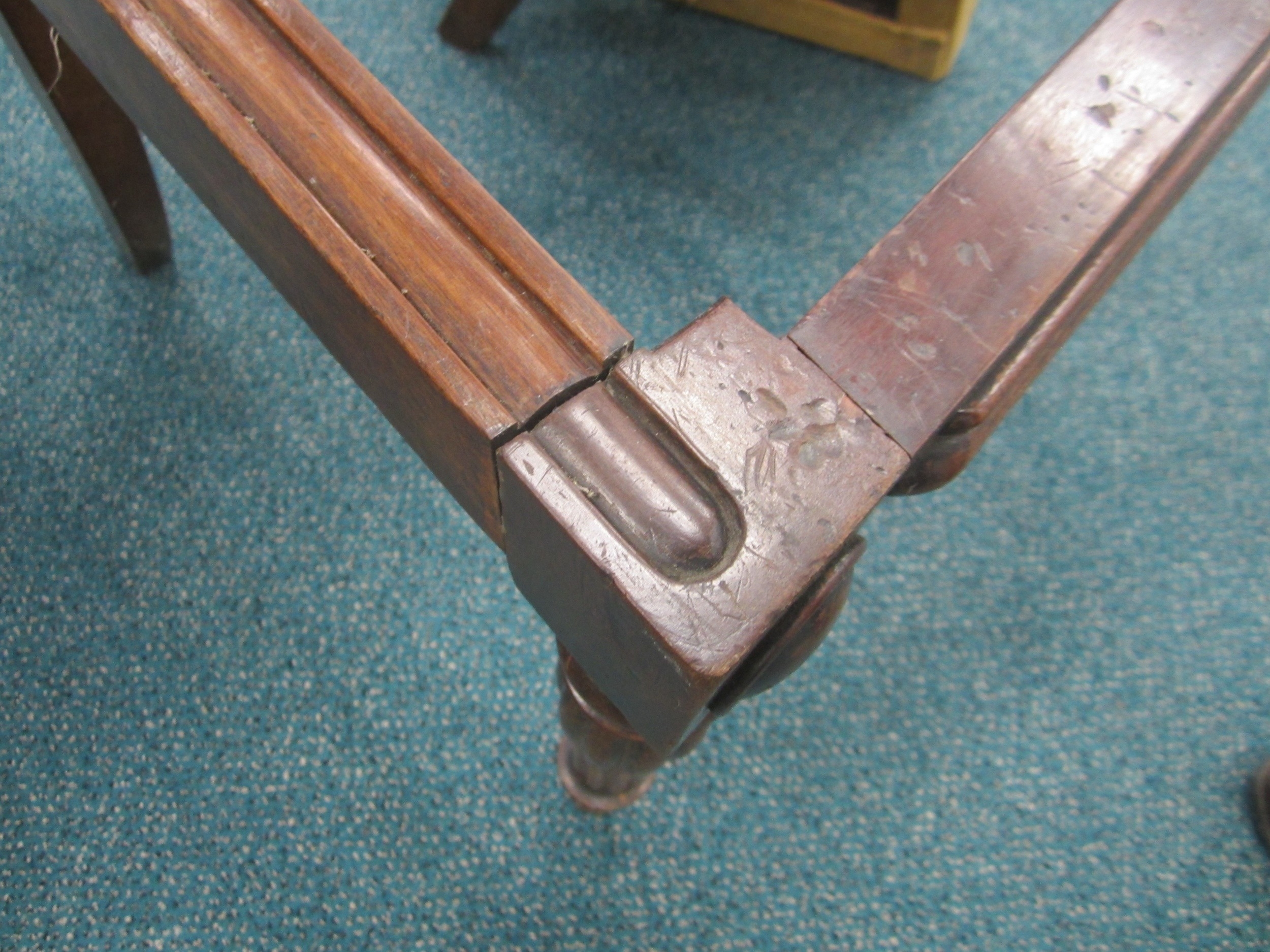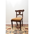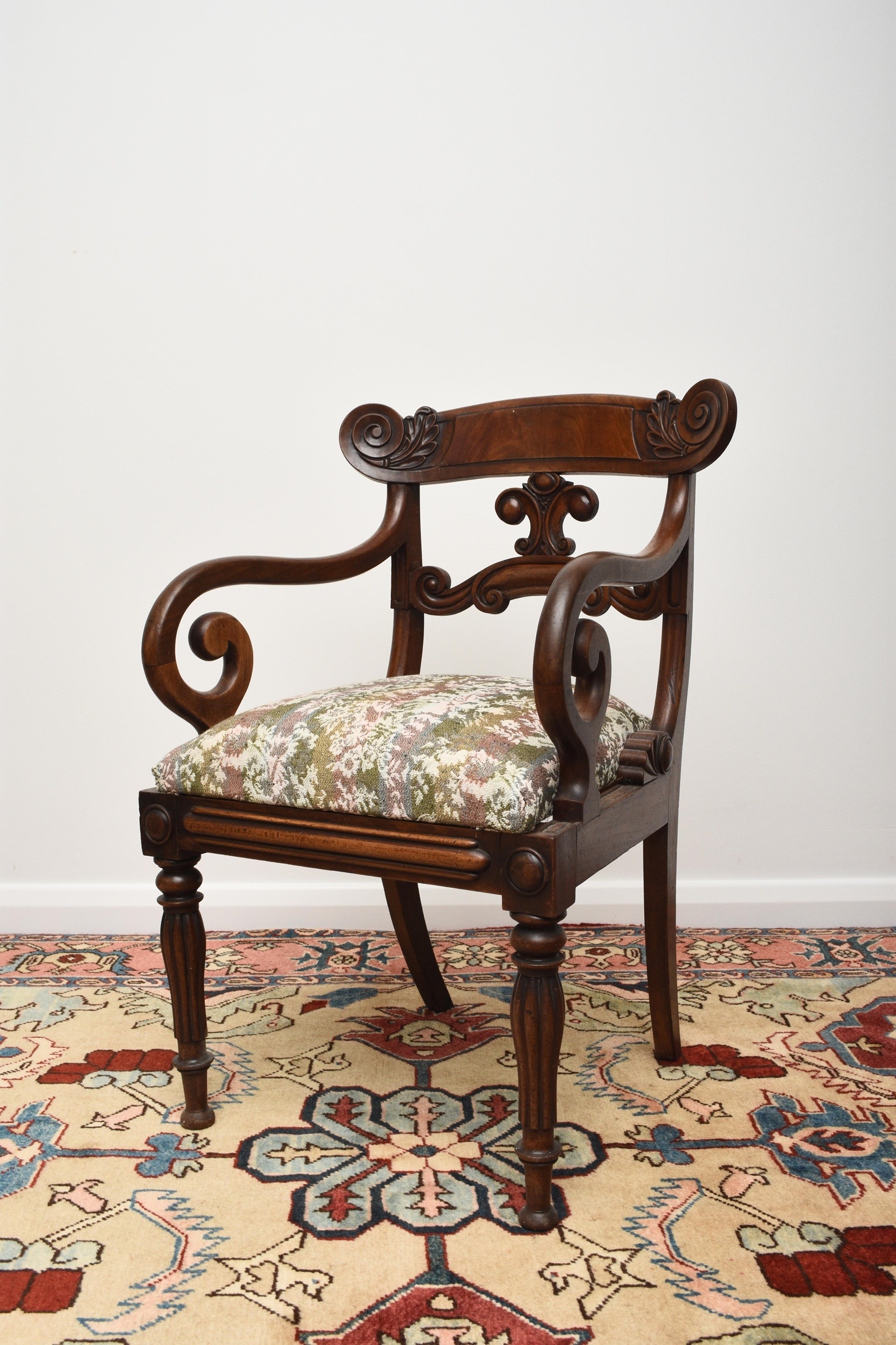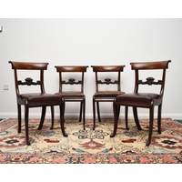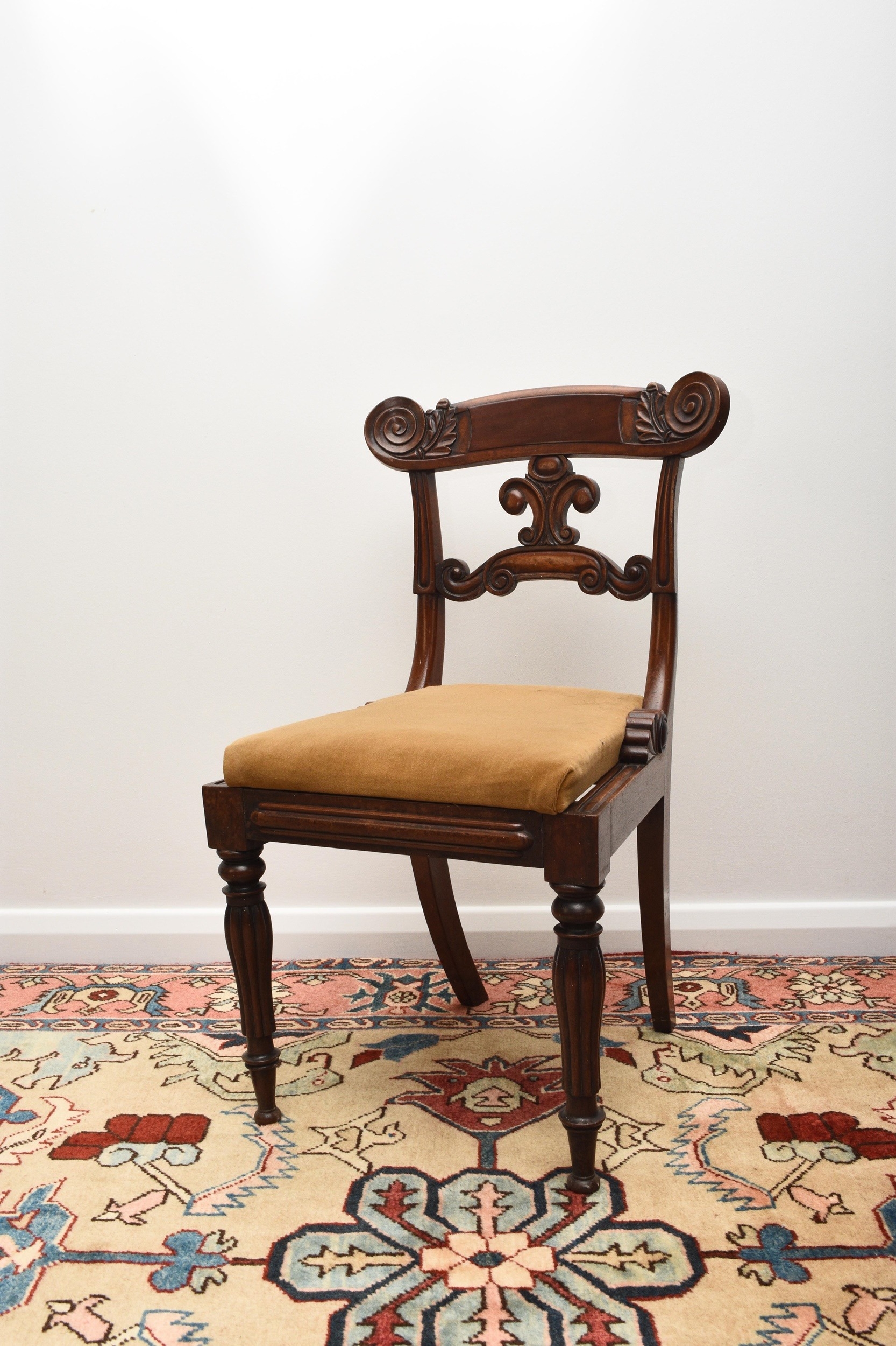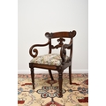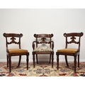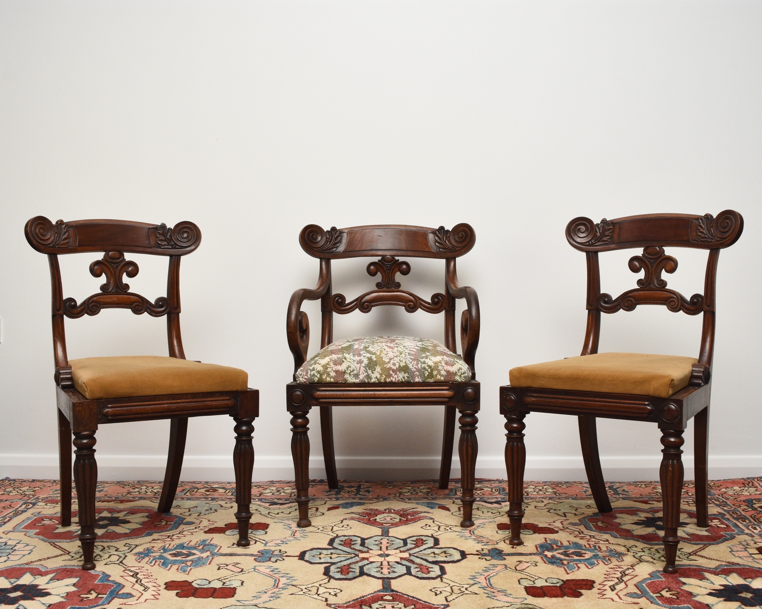 A set of seven (6+1) William IV mahogany dining chairs The top rails with volute ends, over scroll-form splats and drop-in seats, raised on turned, reeded front supports, comprising one carver and six standard chairs. Seat height 48cm (7) Condition:One of the standard chairs has a split to the right back rail running into the back support. Another chair appears to have had the same malady in the past but has been restored/repaired. Some joint shrinkage where the front supports meet the seat side rails. General cosmetic marks and scuffs as well as old patinated scratches and dings consistent with age and use.