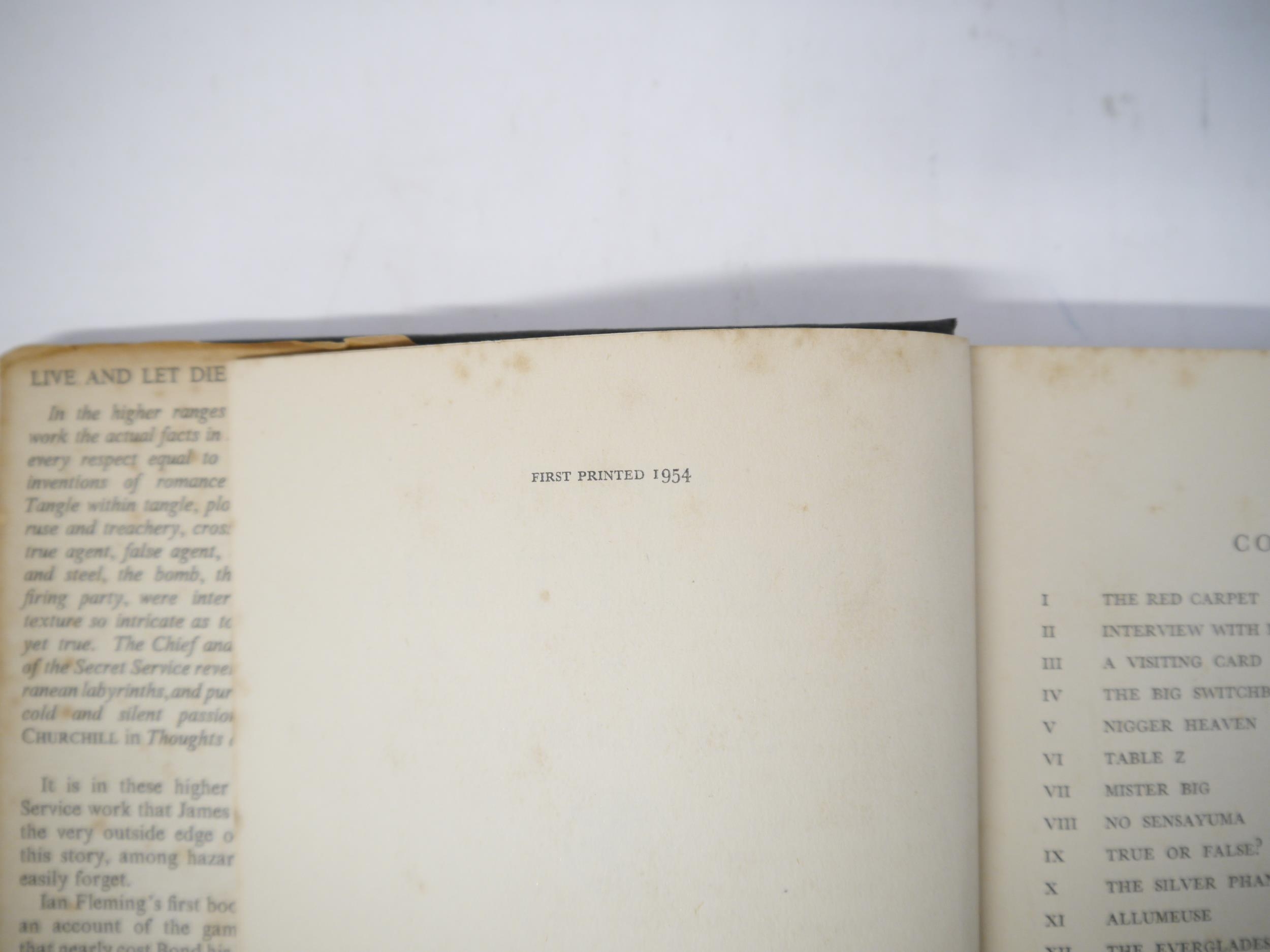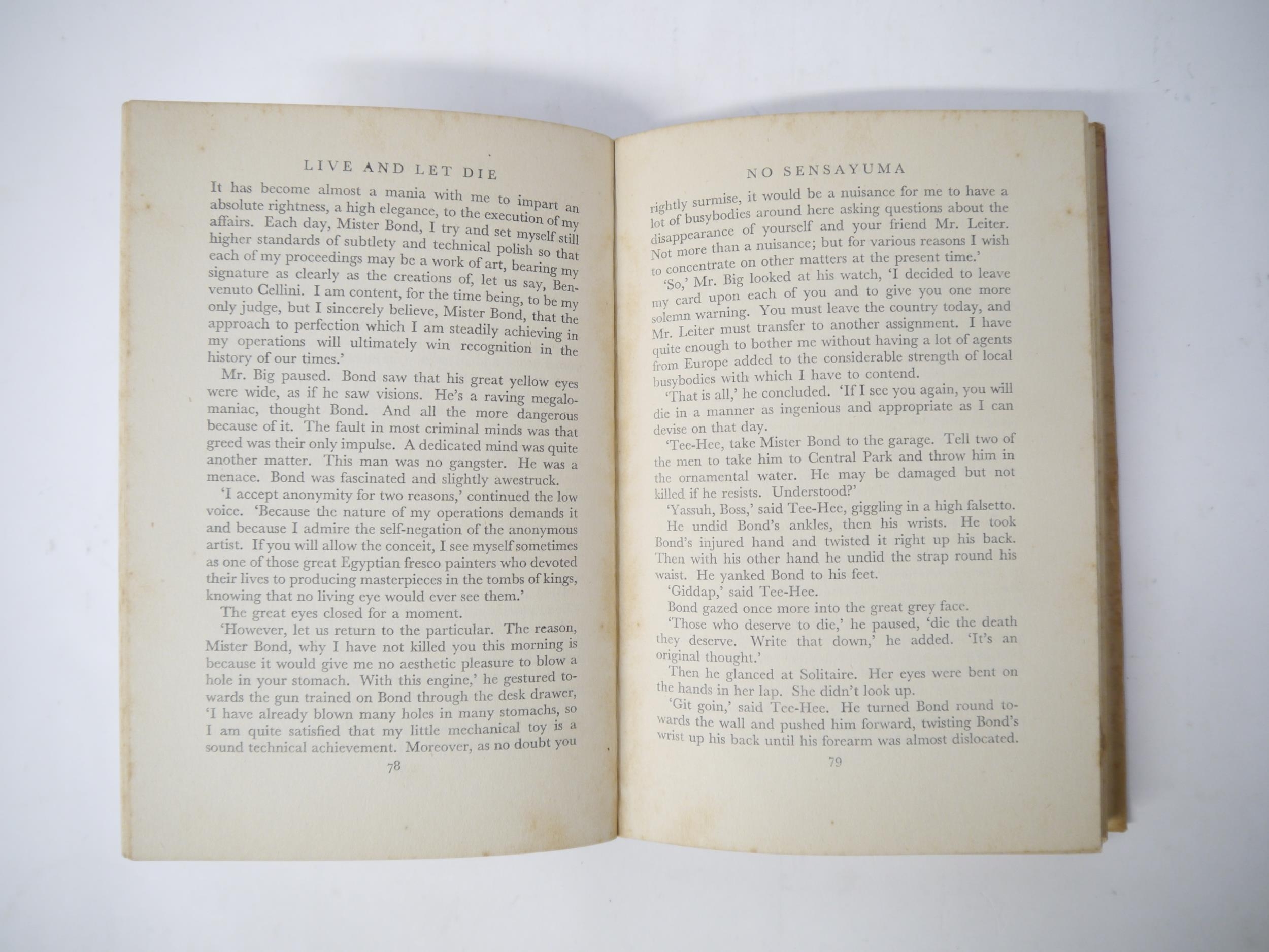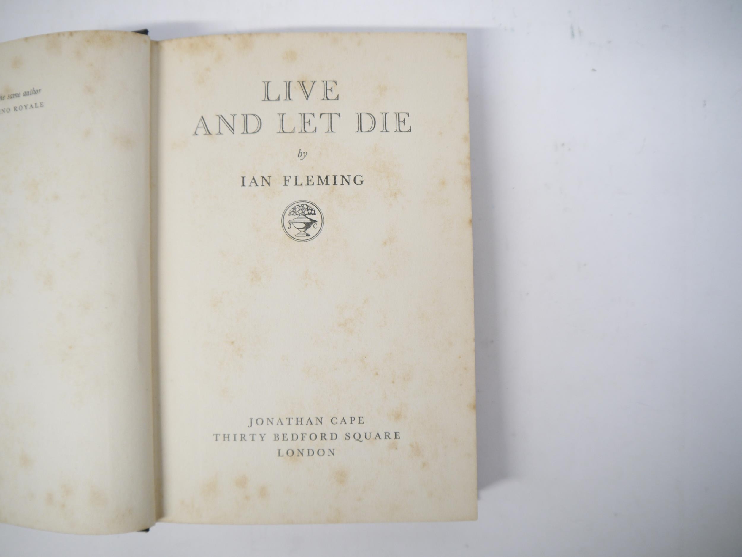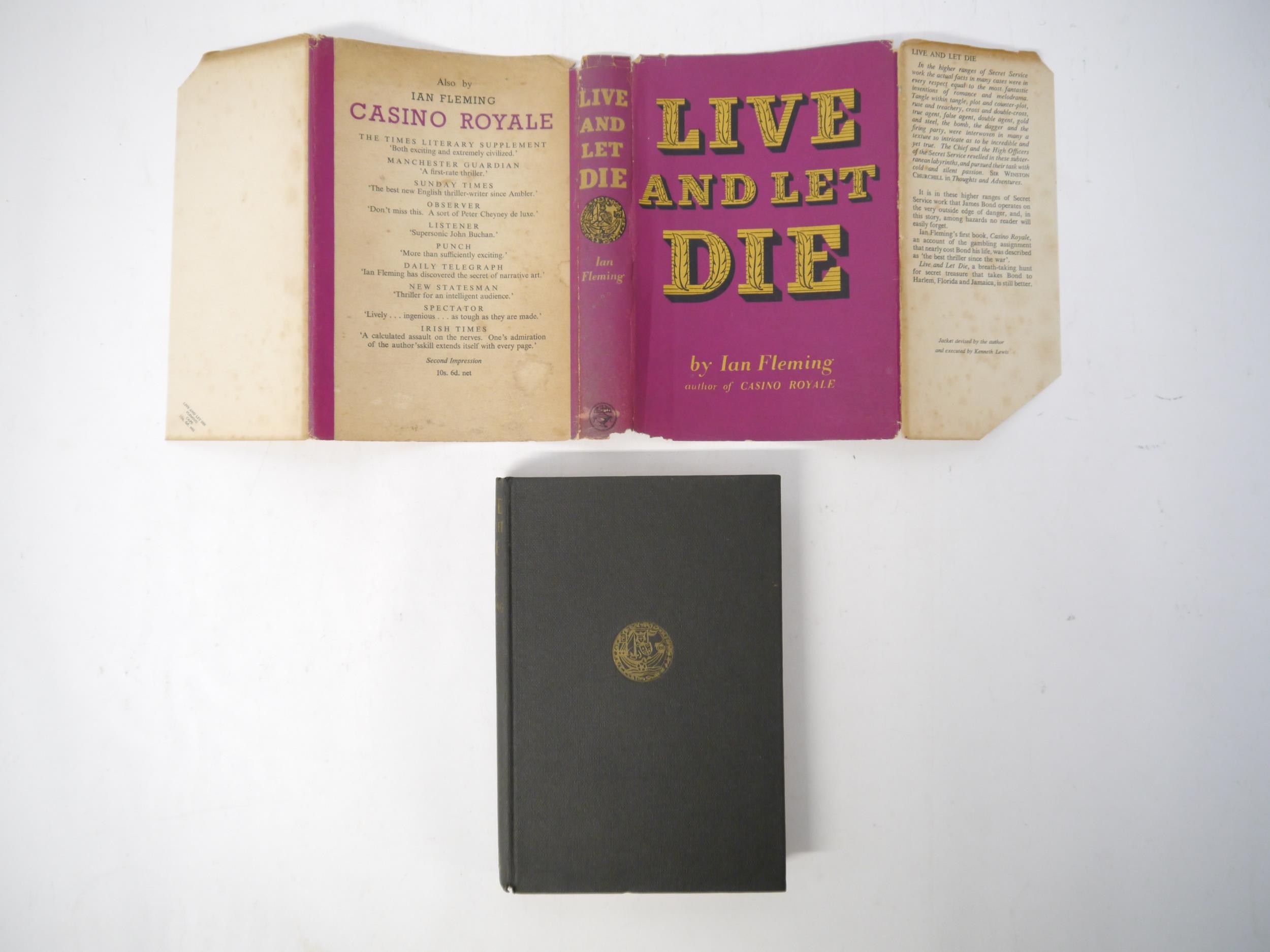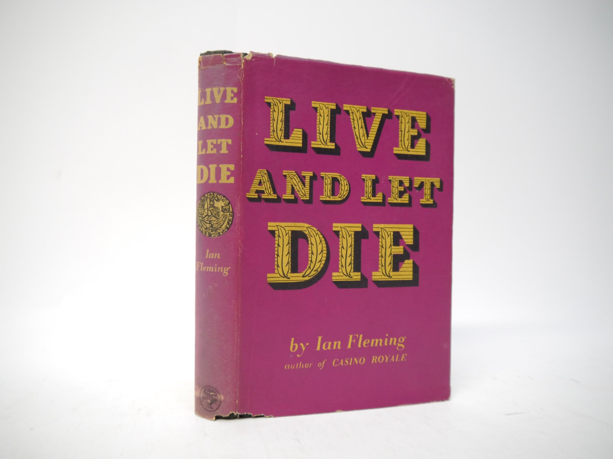 Ian Fleming: 'Live and Let Die', London, Jonathan Cape, 1954, 1st edition, original cloth gilt, dust wrapper by Kenneth Lewis (dust wrapper 1st printing/2nd state, with Kenneth Lewis "floating"credit well below the blurb on inside front flap, neatly price clipped to inside front flap, inside rear flap with 10s. 6d. price intact). A first edition copy of the second of Ian Fleming's Bond novels, following on from Casino Royale. Adapted into the 1973 film starring Roger Moore and Jane Seymour