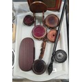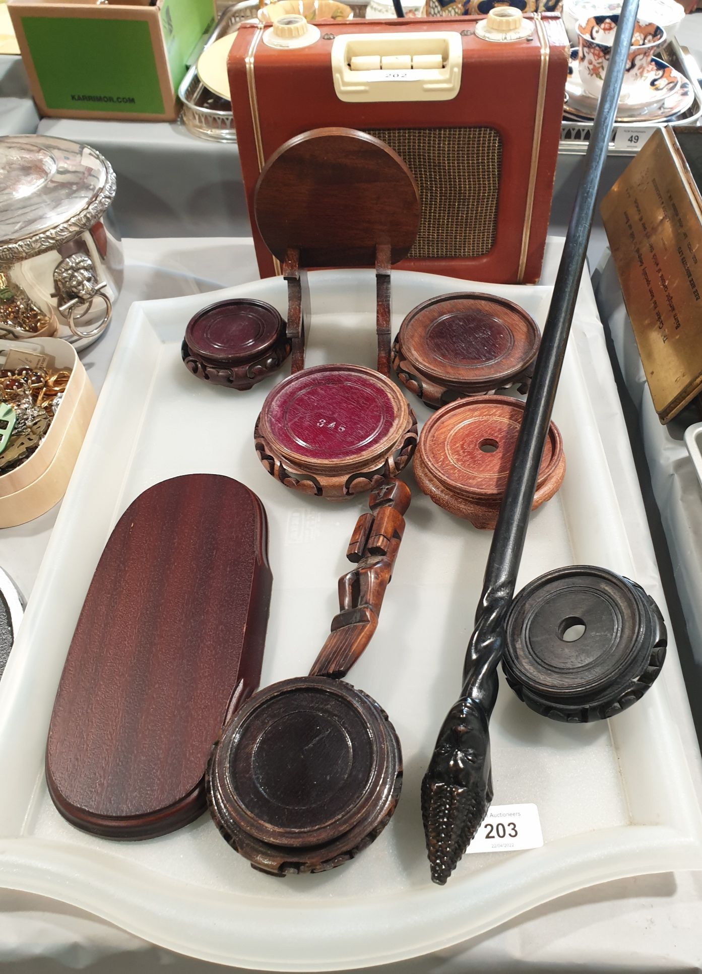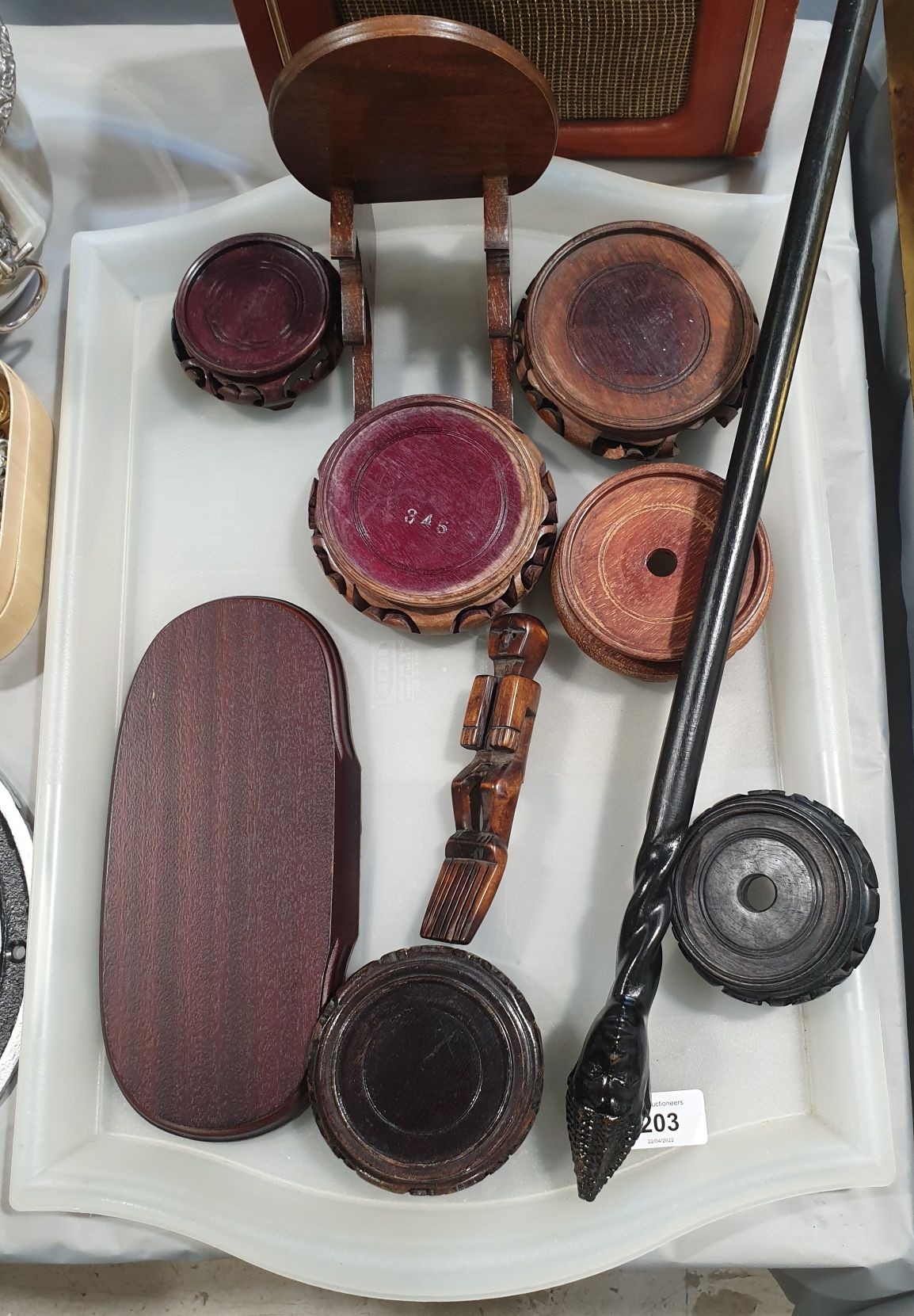 A hard wood stand and a walking stick with a carved tribal head. No shipping. Arrange collection or your own packer and shipper please.