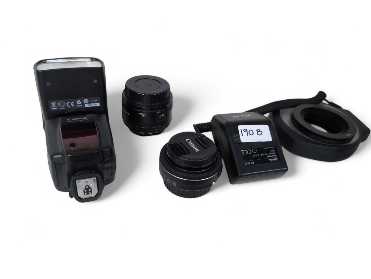 Lot containing Camera Accessories & Lenses including a Canon Speedlite 580ex II plus 2 Canon Lenses & Konig Ring Flash Light