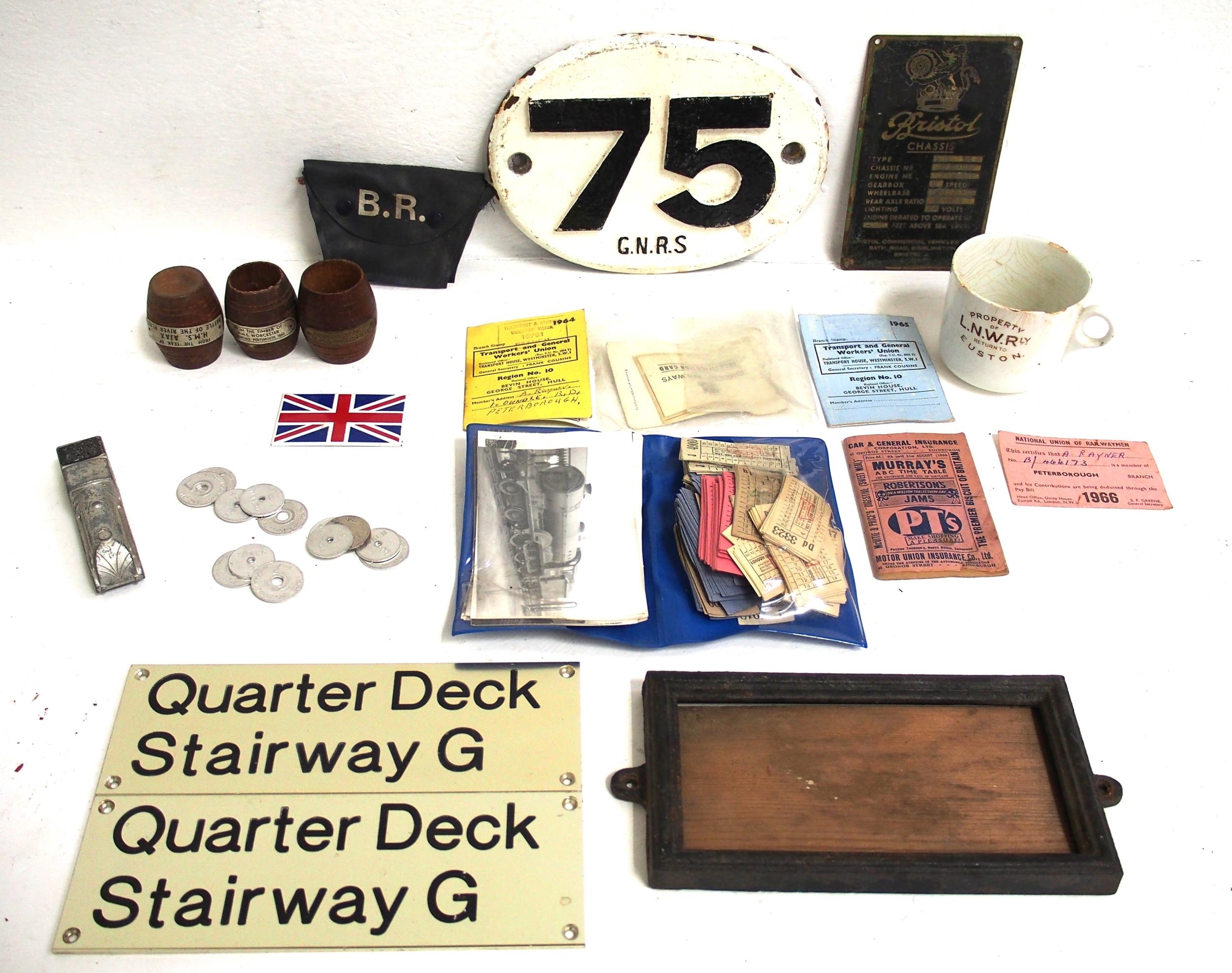 A miscellaneous small item delve including Royal Navel wooden barrel egg cups made from timber reclaimed from HMS Worcester (1860), Warspite, Ajex (Battle of the River Plate fame), LNWR Euston cup, LNER C/I telephone circuit frame, plates etc etc. (D1) (Dispatch by Mailboxes/Collect from Banbury Depot)