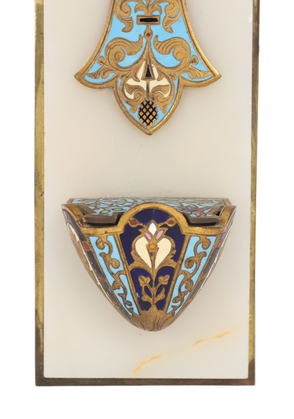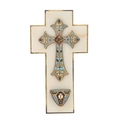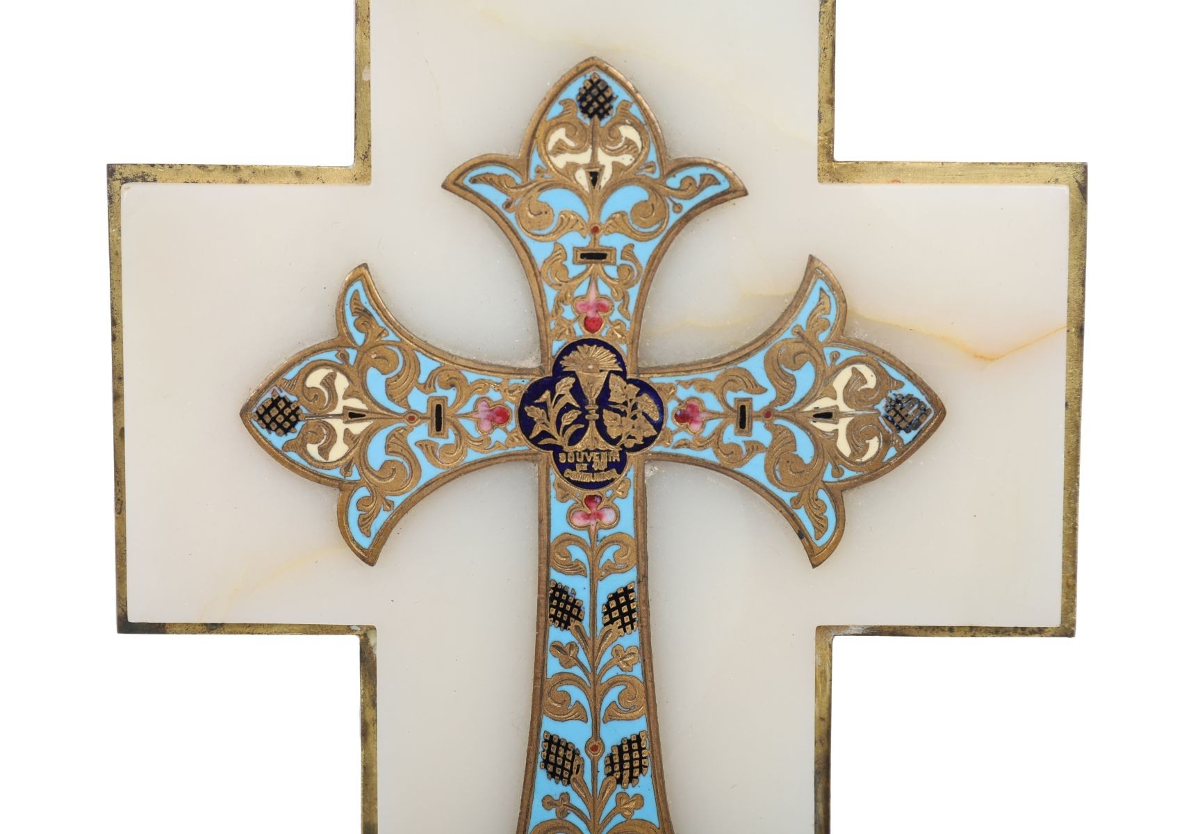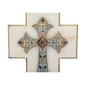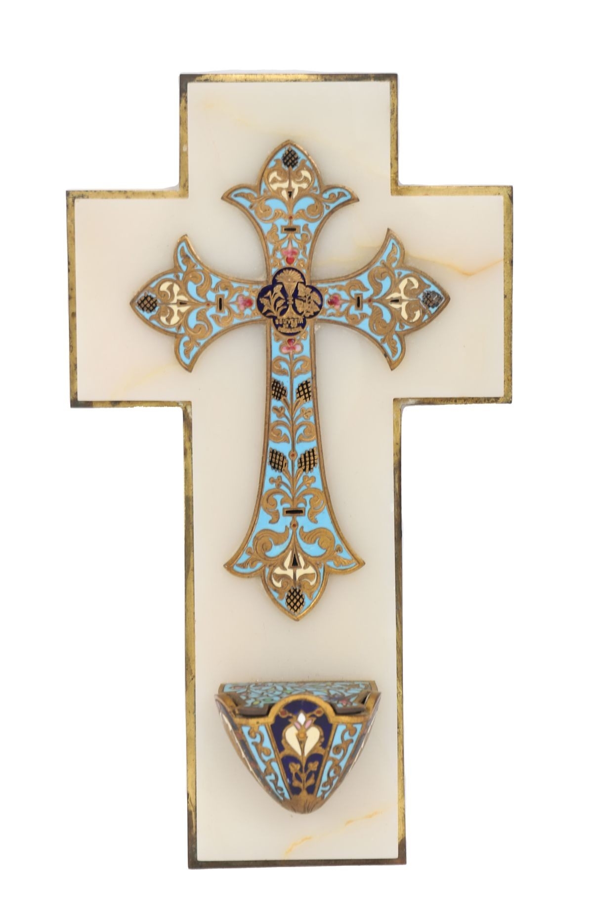 Cross mounted on a stone or alabaster ground, decorated throughout with polychrome champlevé enamel in foliate and floral motifs, with an associated holy water stoup.