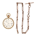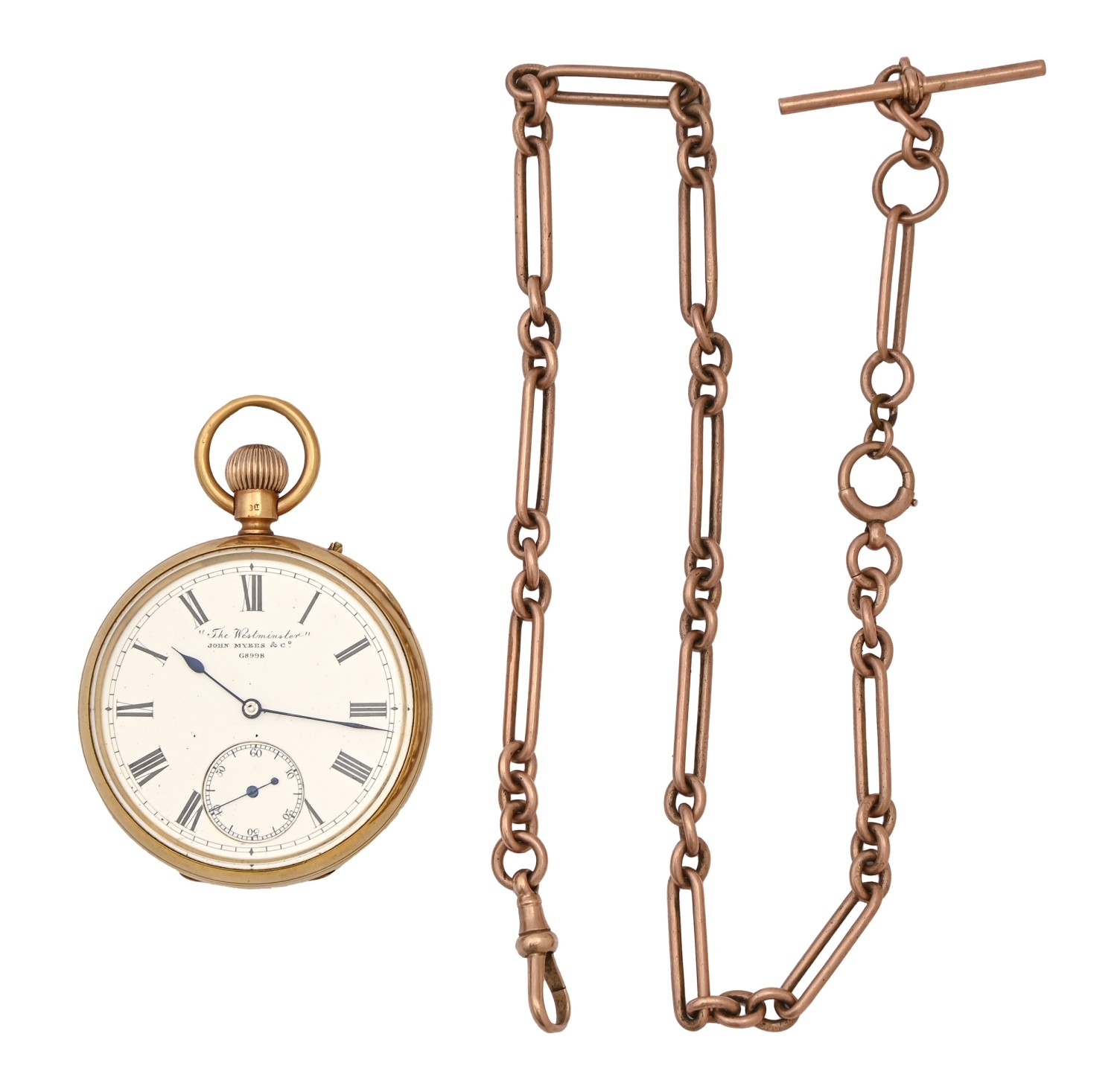 An 18ct gold keyless lever watch, "The Westminster" John Meyers & Co, Westminster Bridge Rd London, No.68998, with three-quarter plate movement, plain case with gold bow and cuvette, inscribed Presented to David Huggett Roust on his retirement 30 Sept 1899 as a token of regard by Maxwell Bros, 49mm diam, London 1894 and a 9ct gold snaffle link albert, watch 101.7g, albert 35.7g (2)