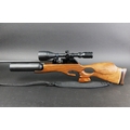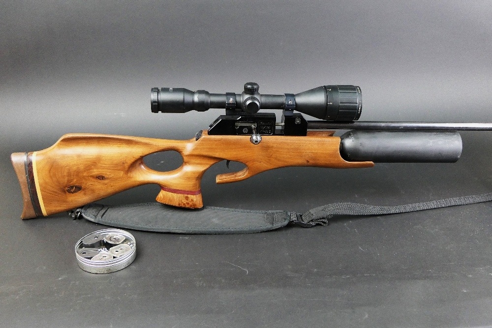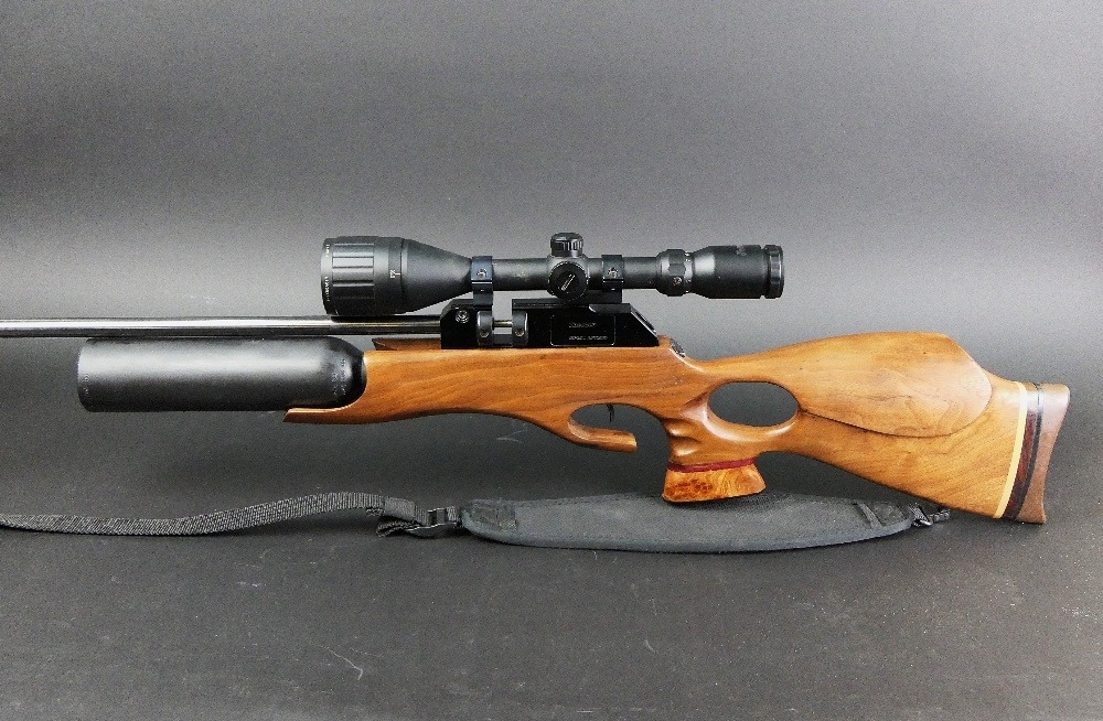 Theoben Rapid 7 Mk I cal 22 pre-charged pneumatic air rifle, fitted with a custom walnut thumbhole stock, Hawke Eclipse 3-9 x 50 AOI scope (telescopic sight) Ridgeline Neoprene sling and five magazines. The Vendor informs us the gun is 30 flb. Serial No. 008410. FIREARMS CERTIFICATE REQUIRED.