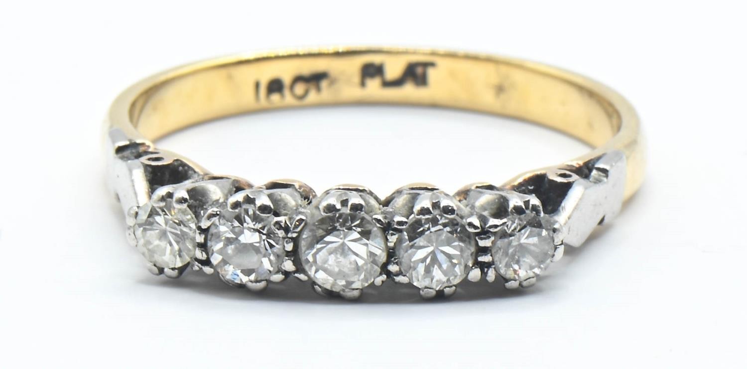 18ct gold, platinum and five stone diamond ring, size M, gross weight 2.2 grams