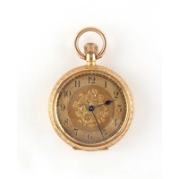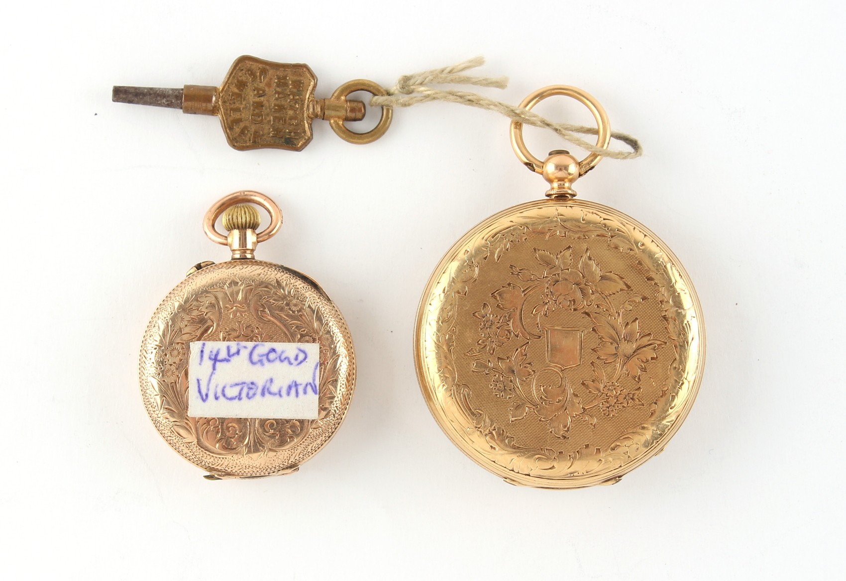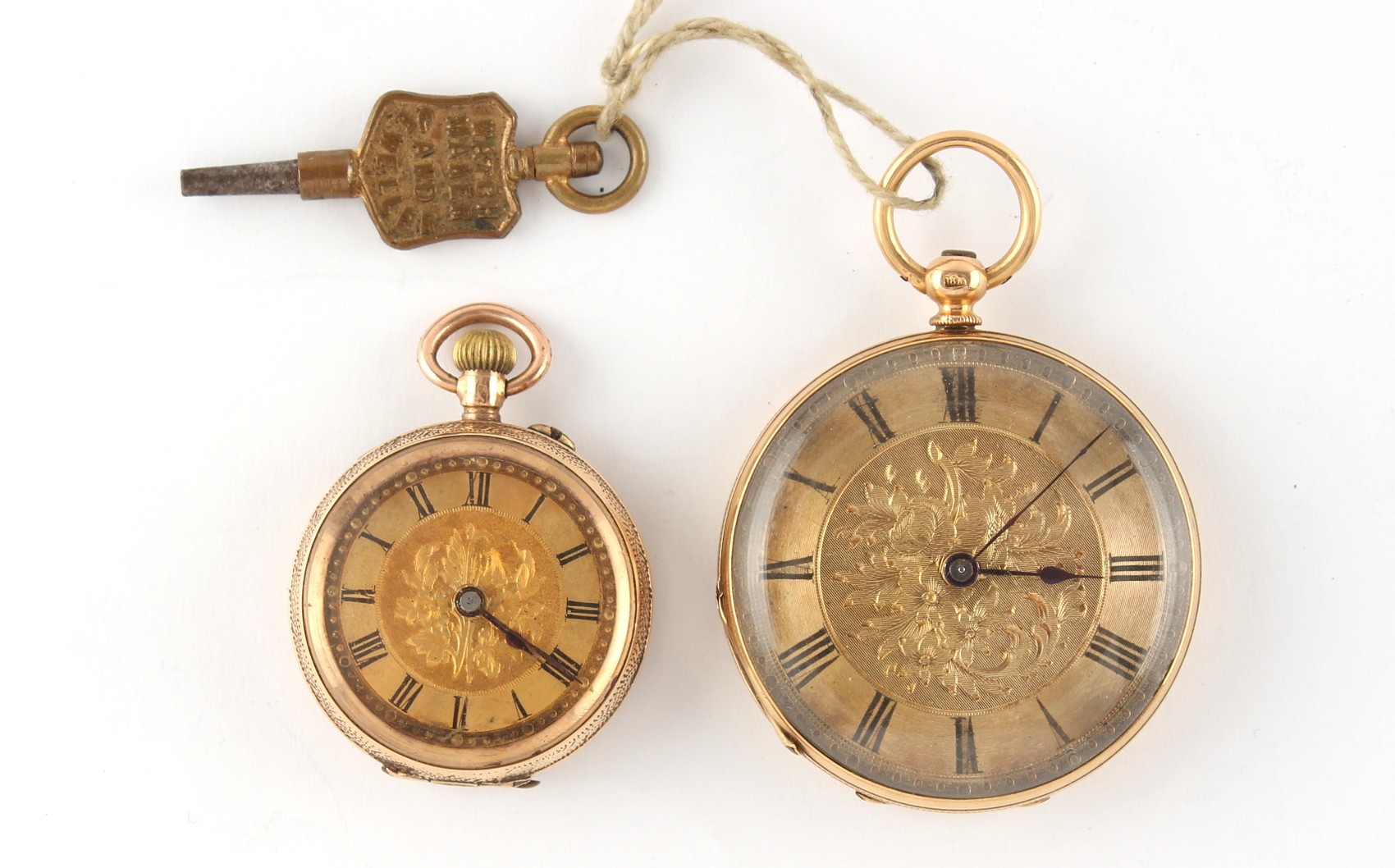Property of a deceased estate, a private collection of watches - an early 20th century 18ct gold fob watch, the suspension ring also 9ct gold, the dust cover base metal, approximately 37.6 grams, 36mm diameter, appears to be working but no guarantees are given; together with a smaller early 20th century 14ct gold fob watch, the dust cover base metal, approximately 17.9 grams, 27mm diameter, appears to be working but no guarantees are given (2).