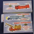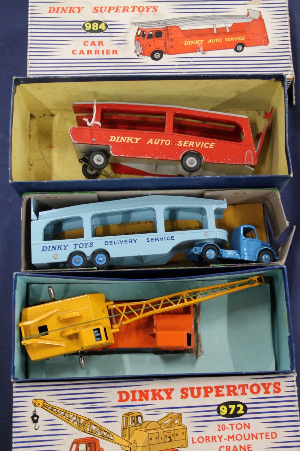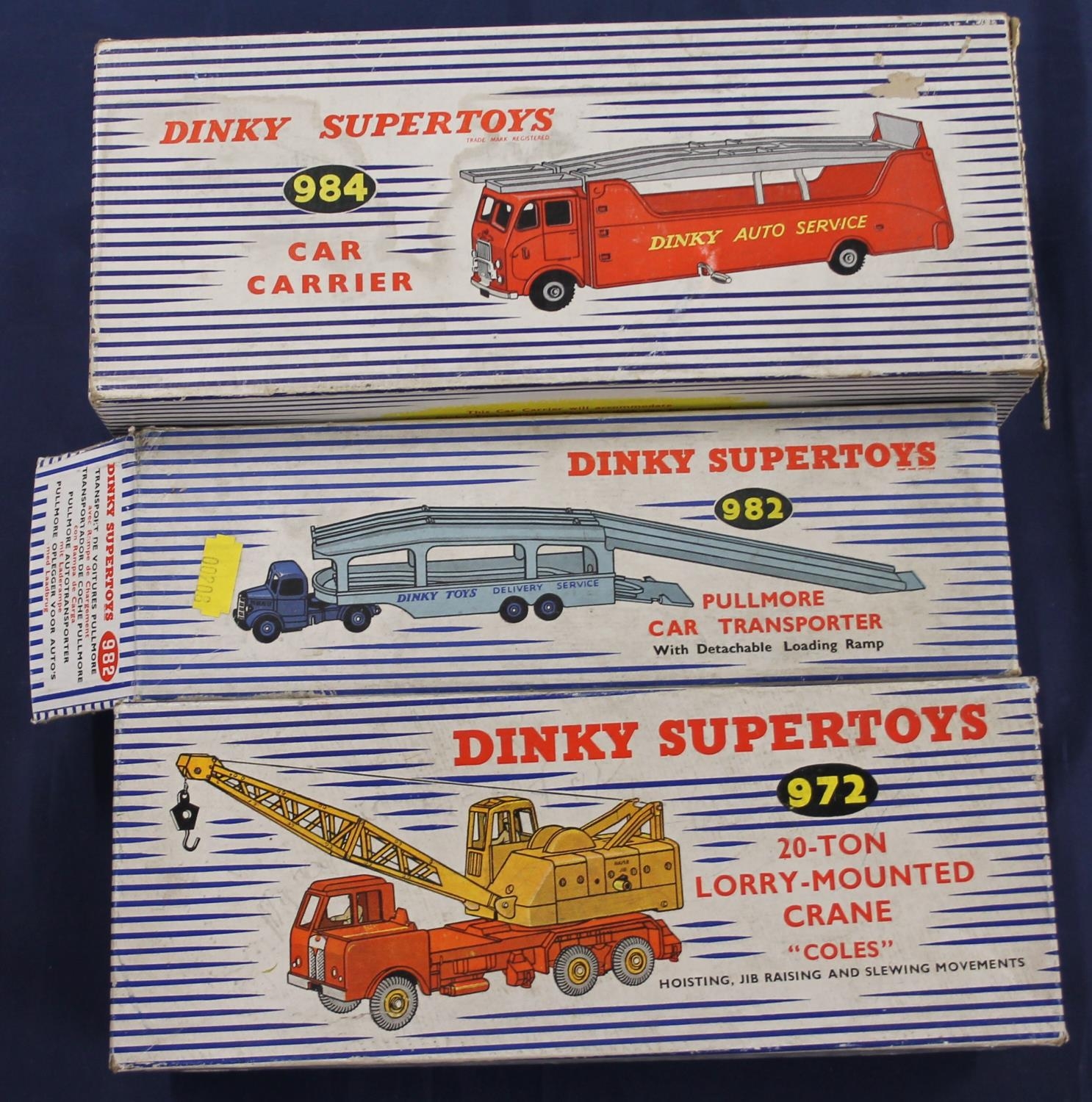 Dinky Supertoys 982 Pullmore Car Transporter with loading ramp and 972 20-ton lorry mounted Coles crane, both boxed and Dinky Auto Service car transporter trailer in 984 box. (3)