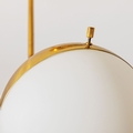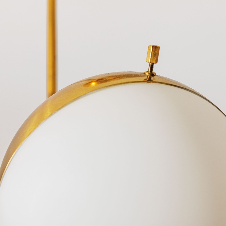 Lampada a sospensione mod. 1129. Ottone, metallo smaltato, vetro opalino. Italia, 1960 circa. Decalcomania del produttore.