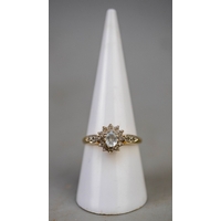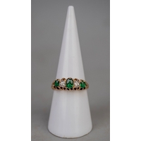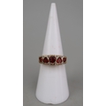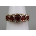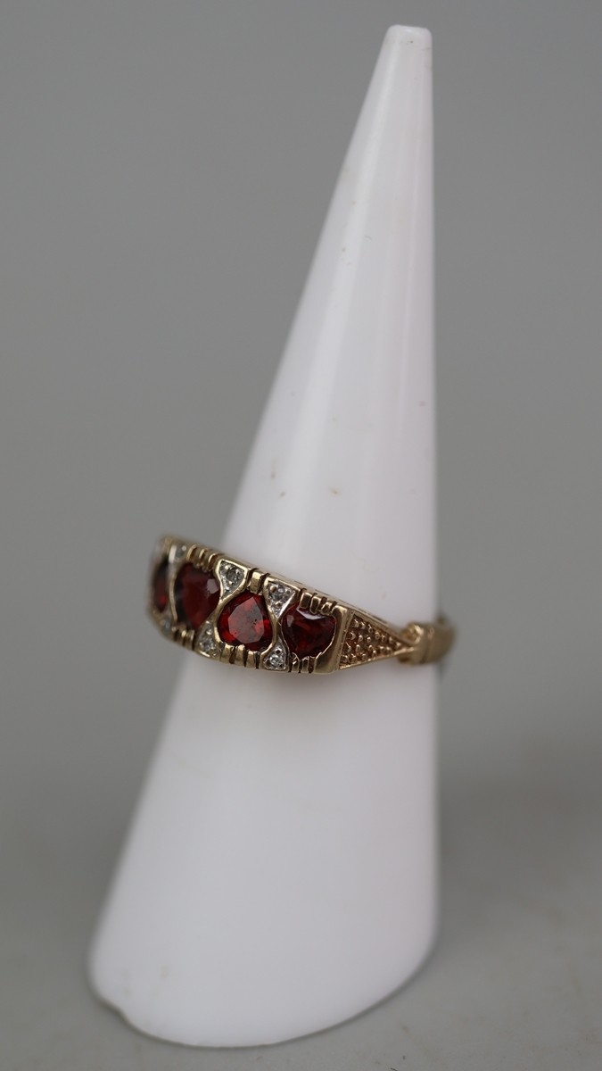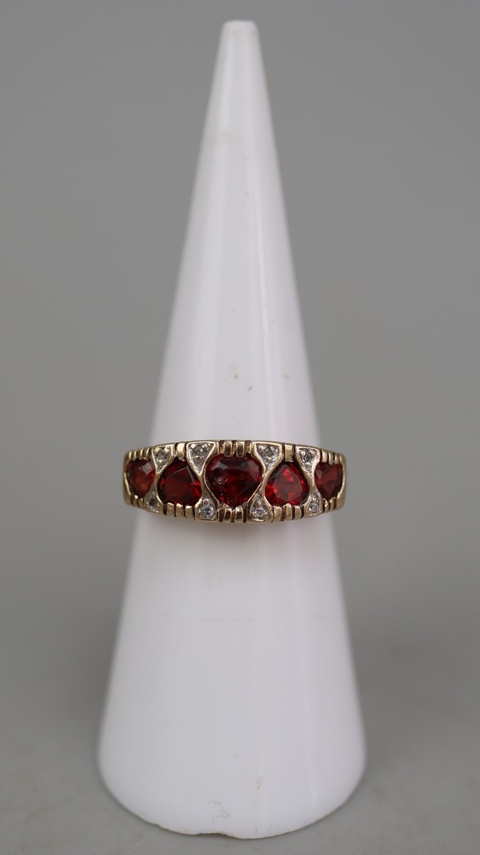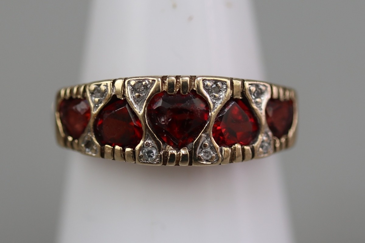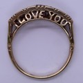 9ct gold 5 heart shaped garnet set ring, plus small white (diamond like) stones surrounding, and beneath setting is the lettering 'I Love You'. Approx 2.4gm - Size L