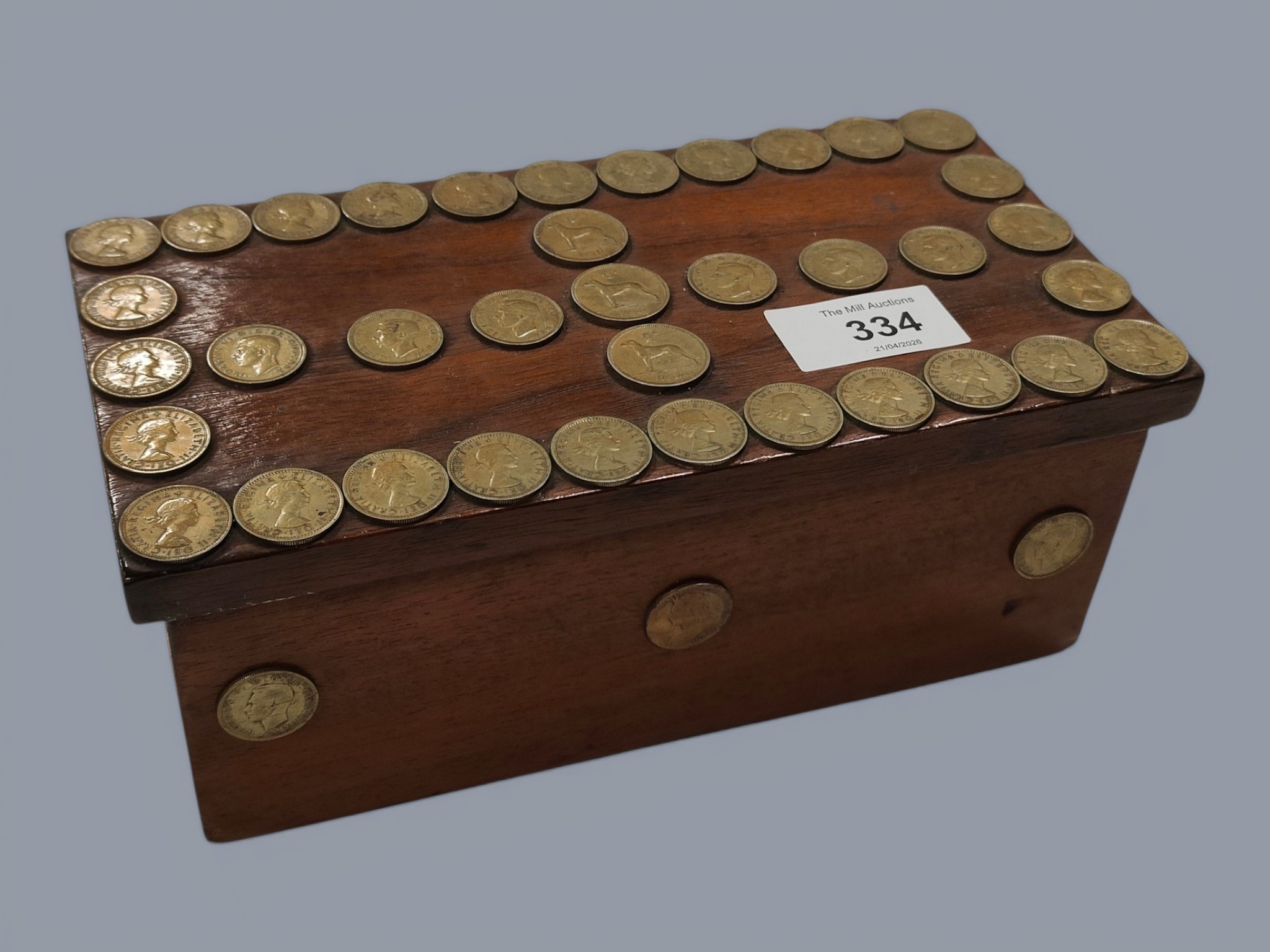 ANTIQUE CIGAR BOX DECORATED WITH OLD COINS