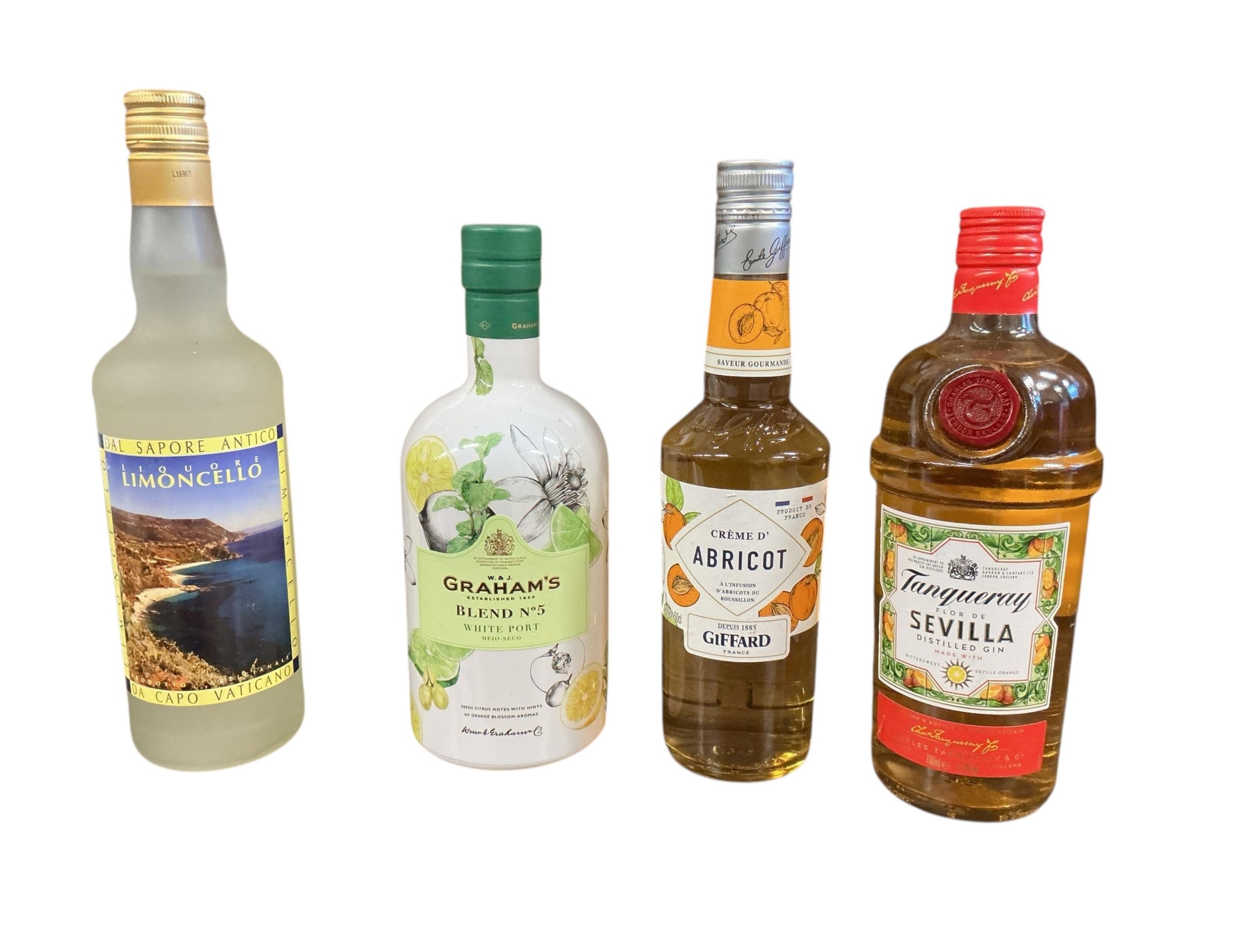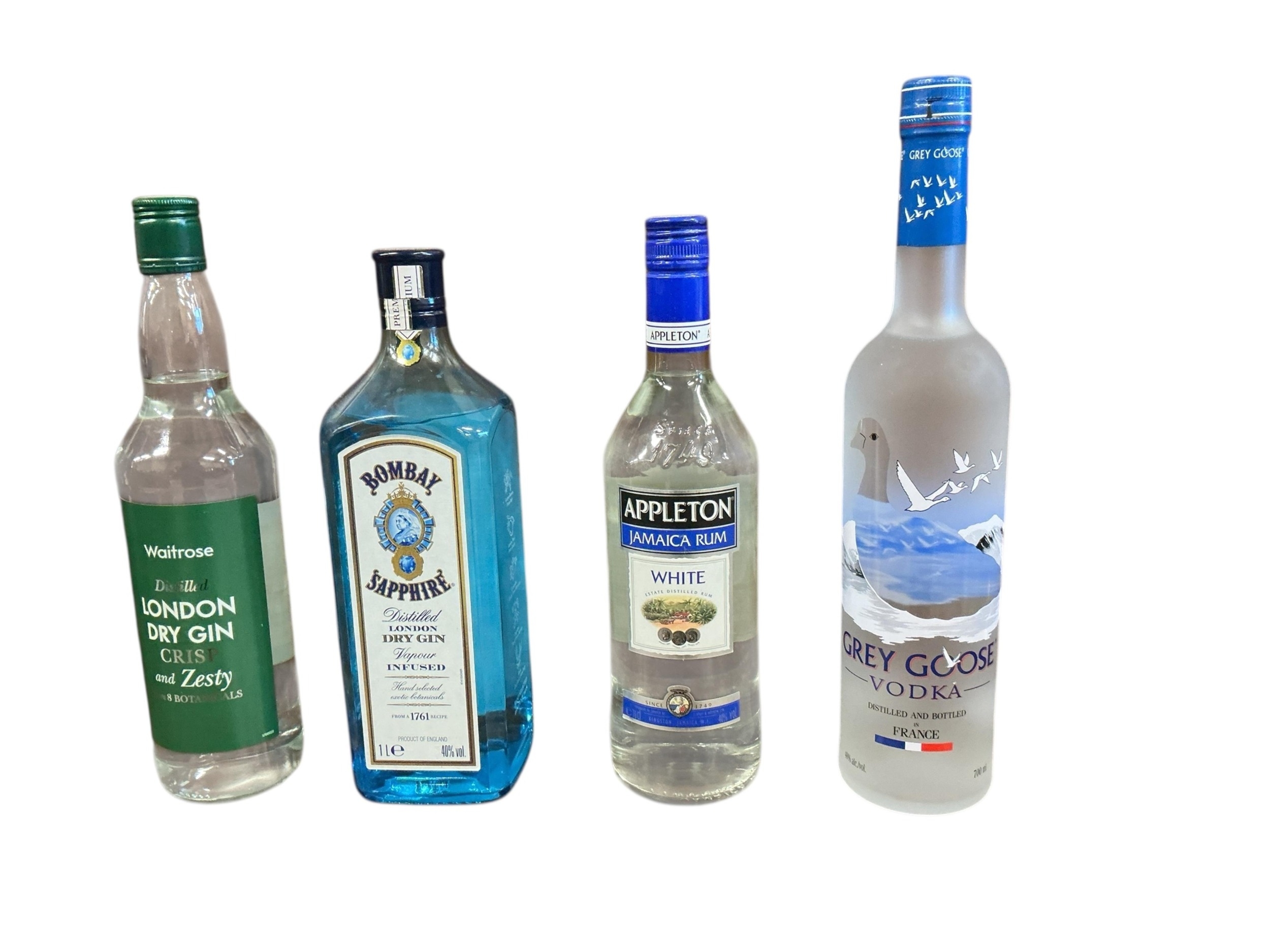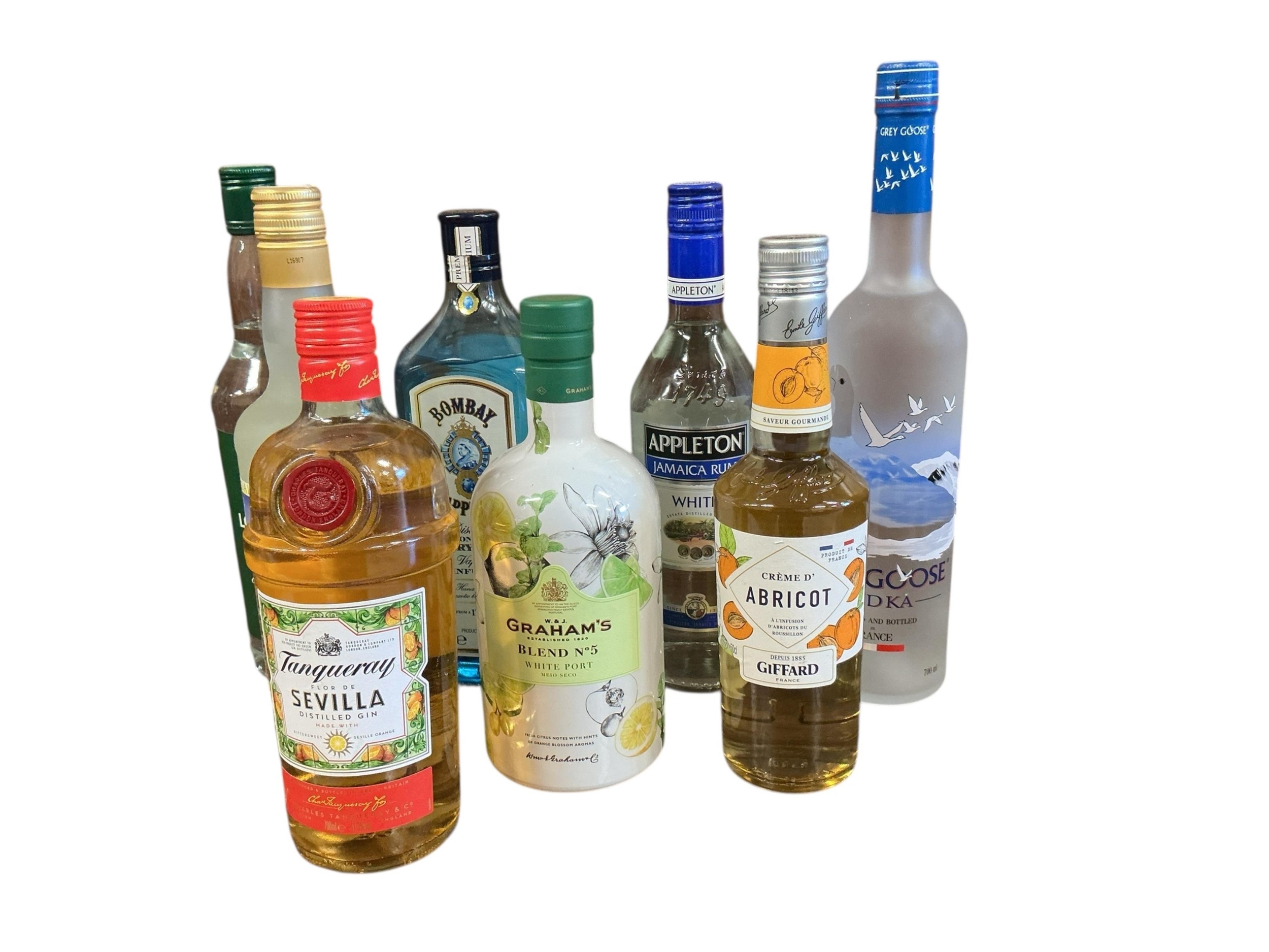 Eight bottles of assorted spirits and liqueur to include Greygoose Vodka, Graham's Blend No.5 White Port, Bombay Sapphire, etc.