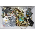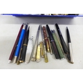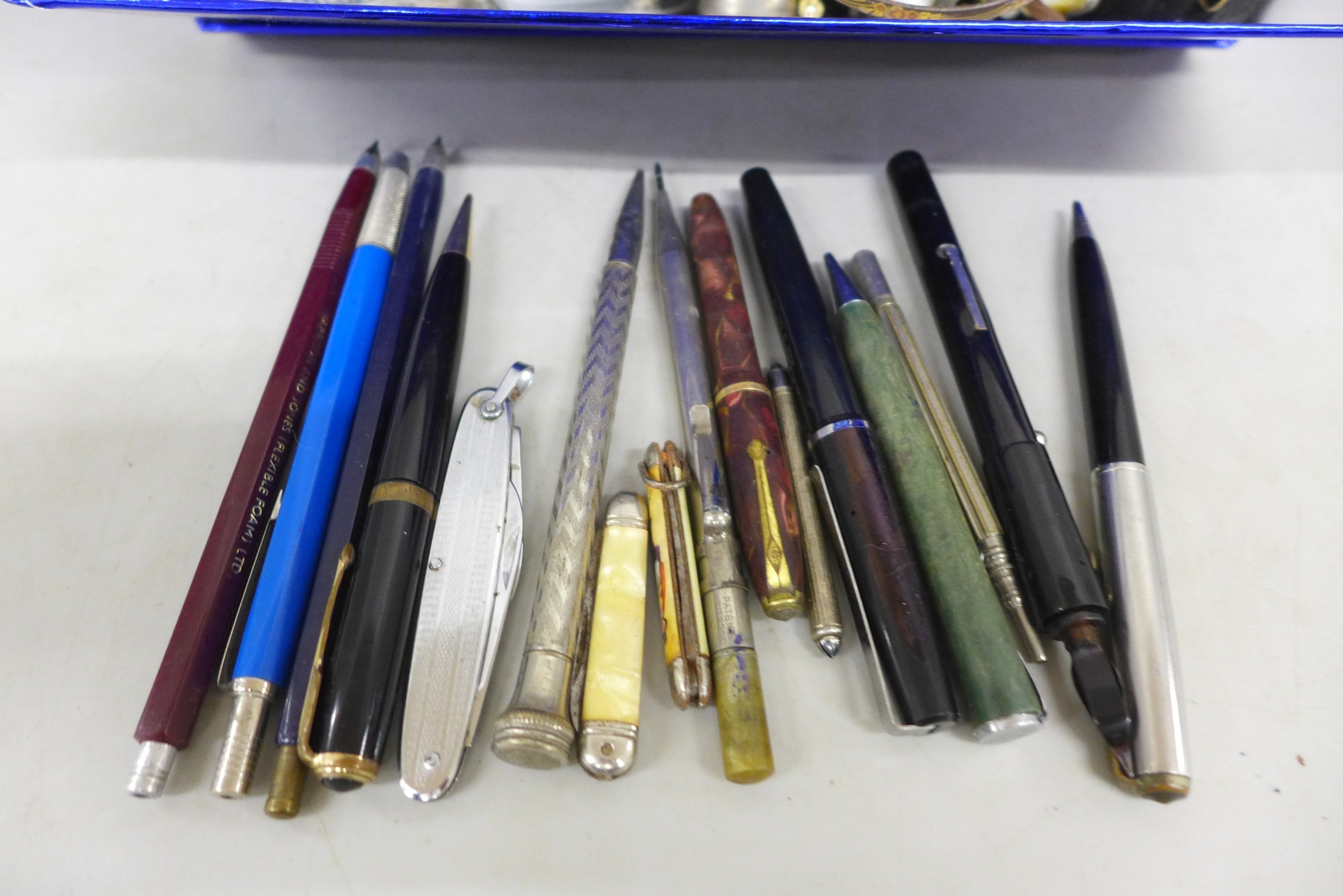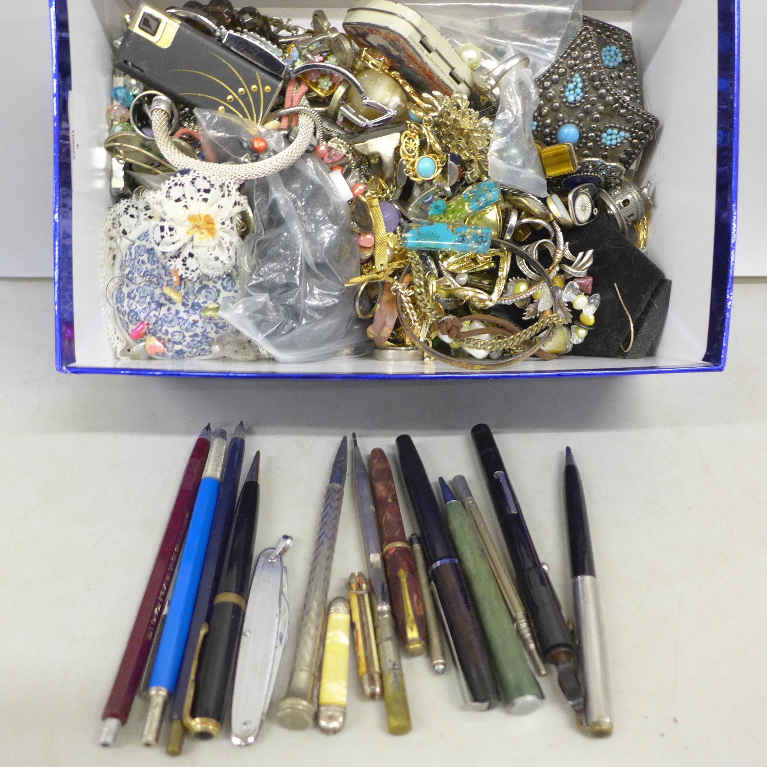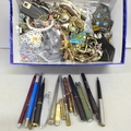 A box of costume jewellery, pens including Conway Stewart, etc.