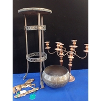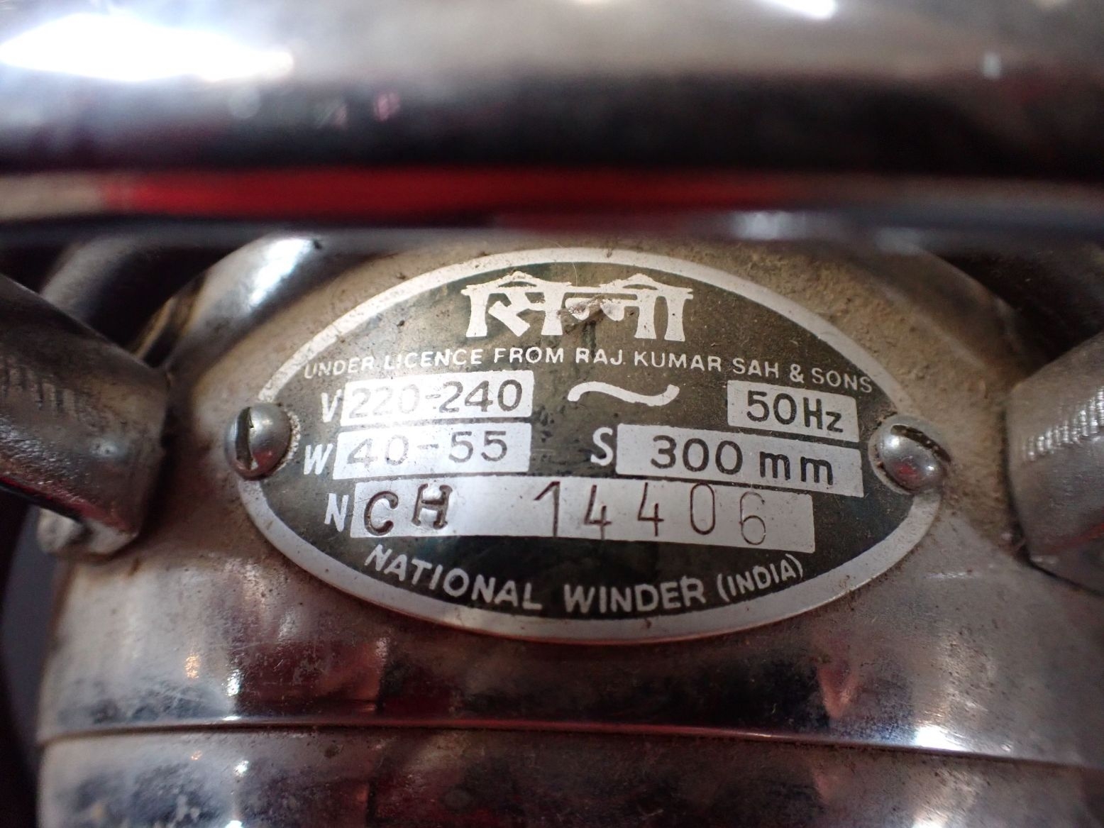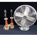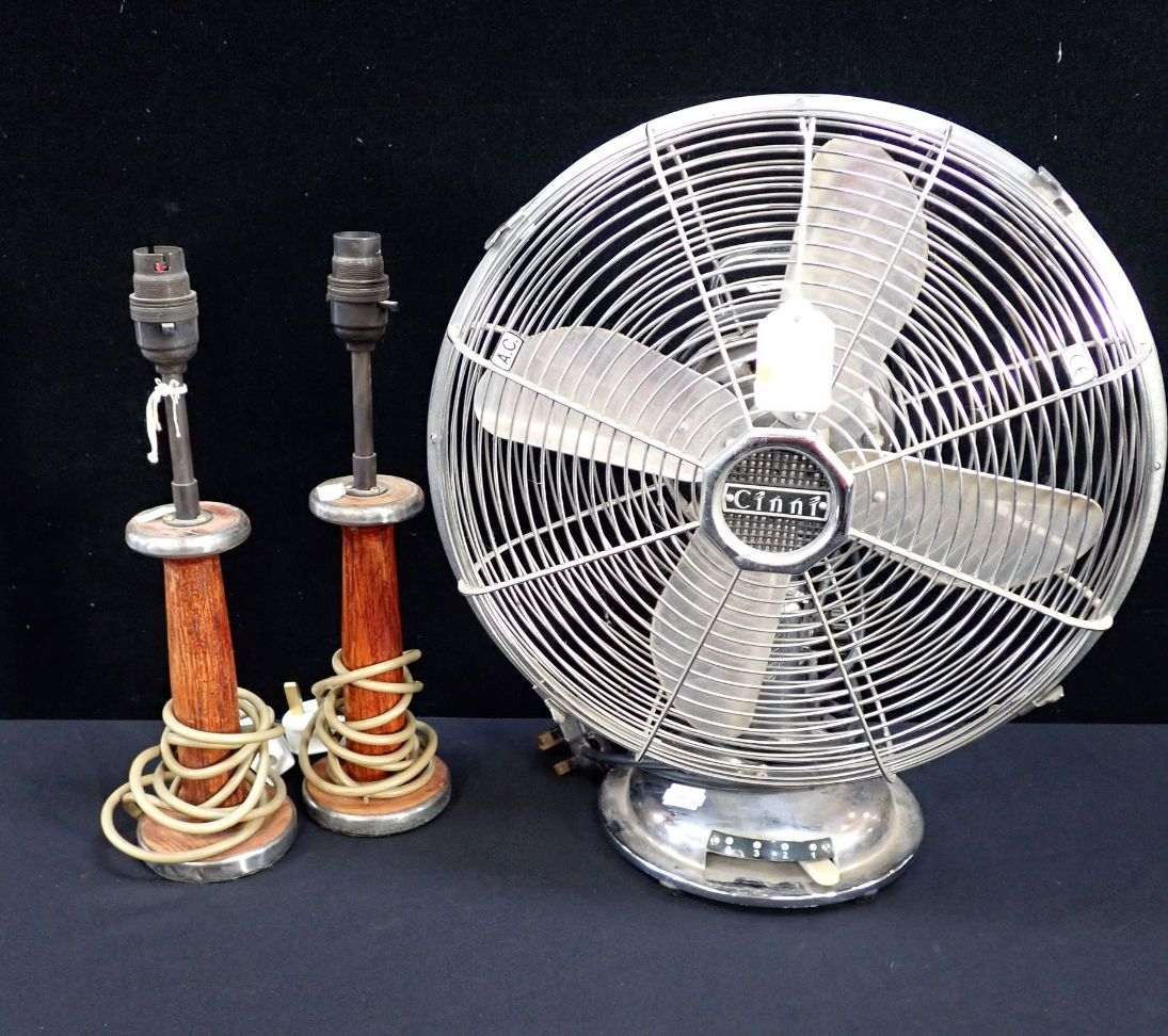 A VINTAGE 'CINNI' CHROME-PLATED TABLE FAN (not tested) and a pair of lamps made from old spools. Provenance: The Richard Pratley Collection of English Furniture, Naive and Folk Art.