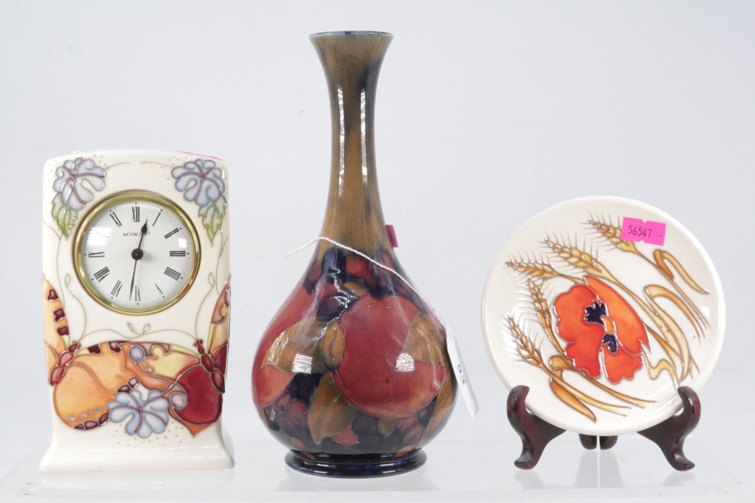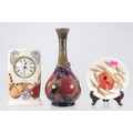 Moorcroft "Harvest Poppy" small dish together with Moorcroft "Butterfly" clock (heavily crazed) and a Moorcroft "Pomygranite" vase with noted repair to top rim