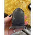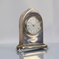 An Edwardian silver mounted desk time piece, Wagner & Gerstley Ltd, Birmingham 1905, of arched form encompassing a white enamel dial with Arabic numerals, upon stepped base and four compressed ball feet, gross weight 104gms (weighted) (at fault)