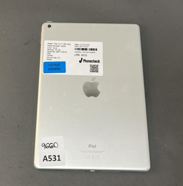 APPLE IPAD 10.2"(9TH GEN)/ A2602/ SILVER/ 64GB/ I-CLOUD LOCKED/ IMEI: QKF7T7DCXT
