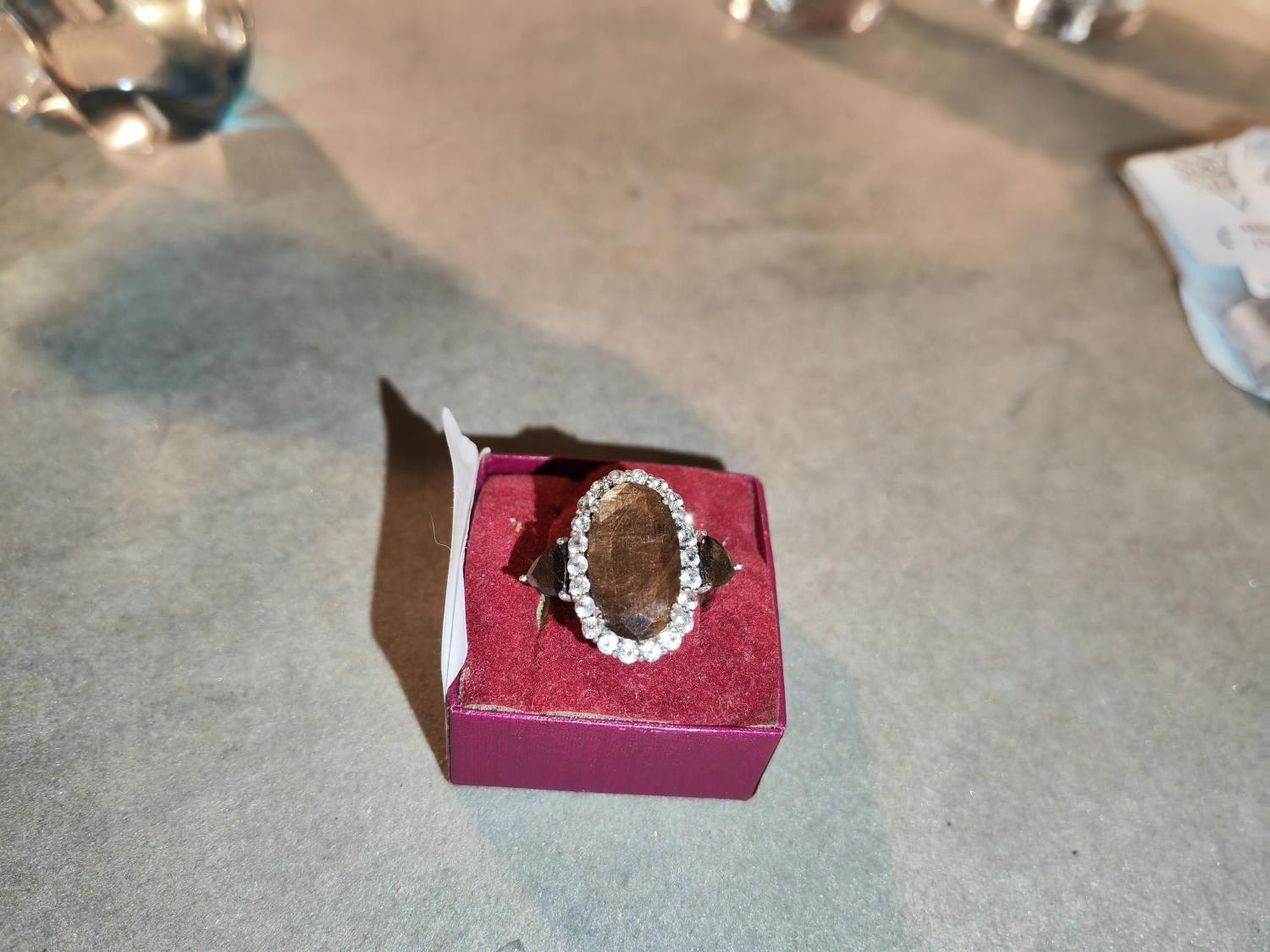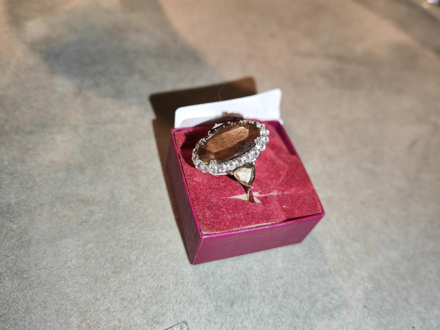 Large Silver Ring Brown And Clear Stones Size R