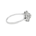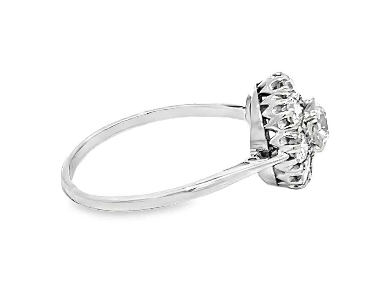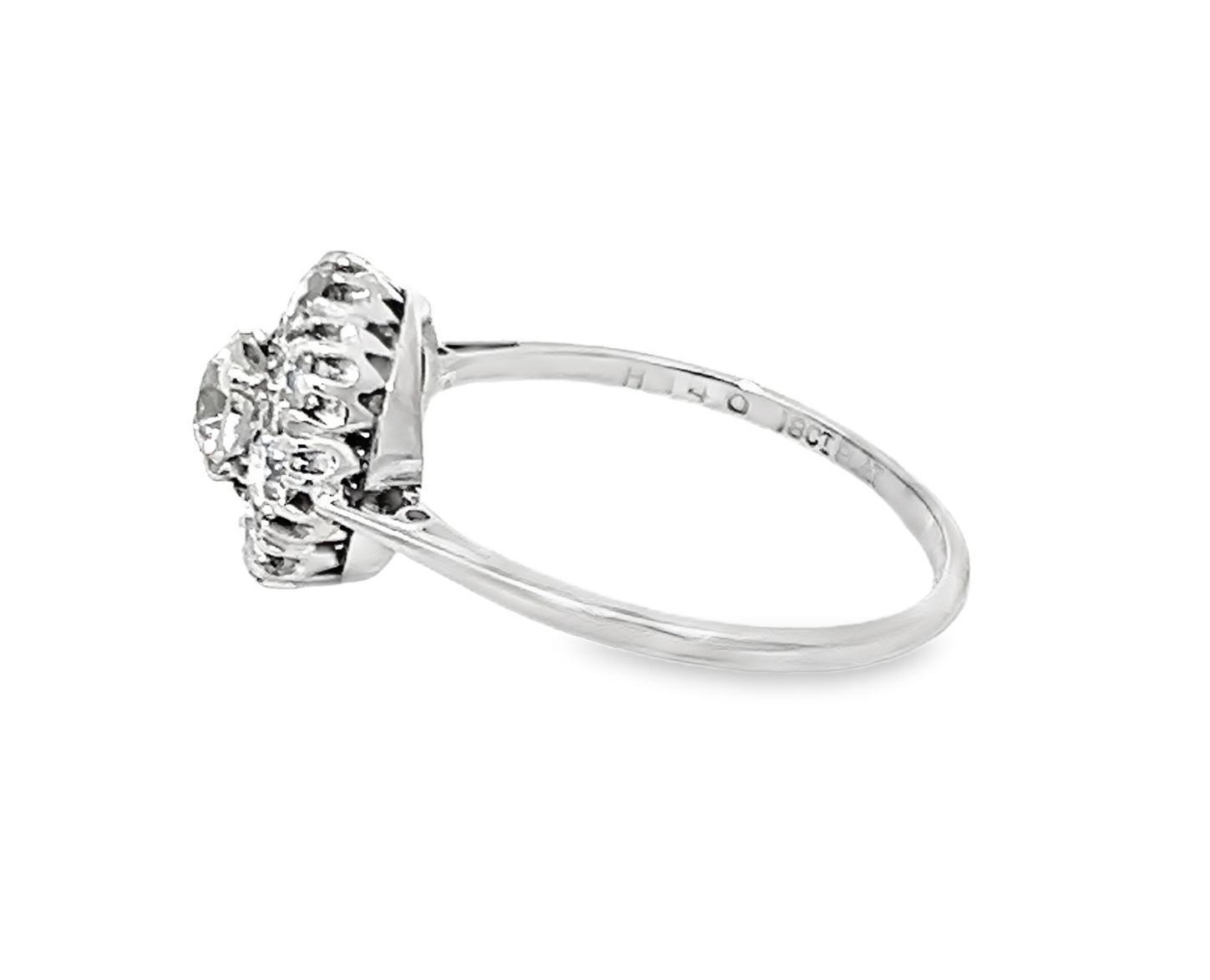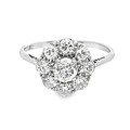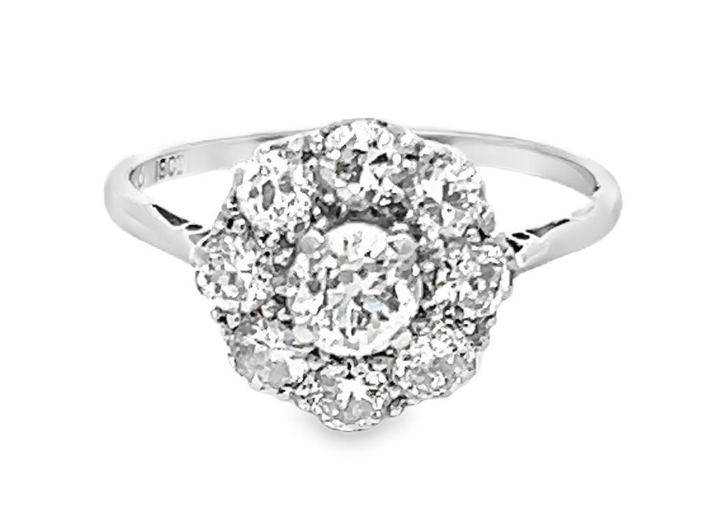 A nine stone diamond cluster ring in a white metal mount stamped 18ct and plat, size R. Central old cut diamond of approx 0.55ct surrounded by eight diamonds of approx 0.1ct each. Total estimate 1.35ct. Clarity grades SI/2. 3.15g.