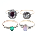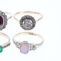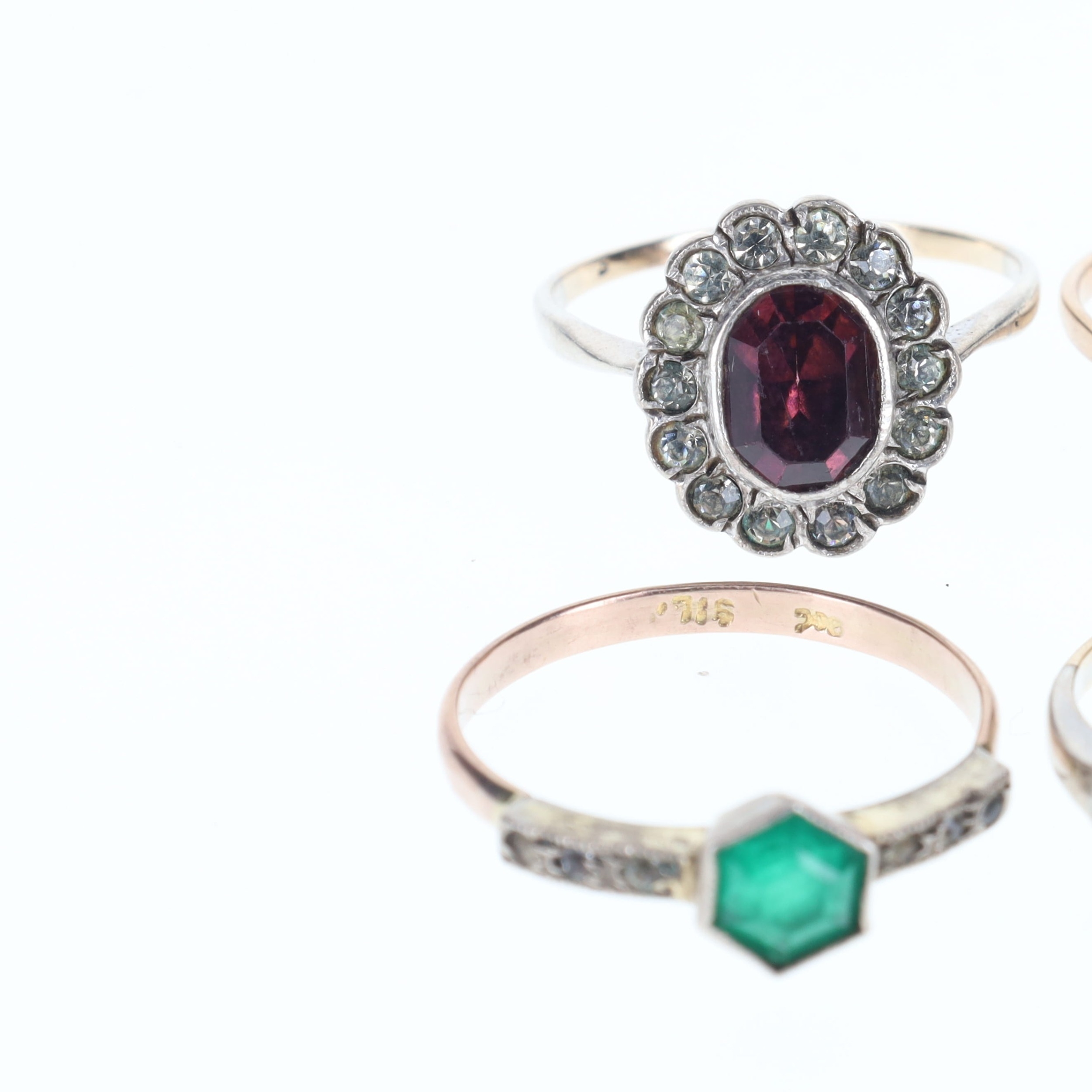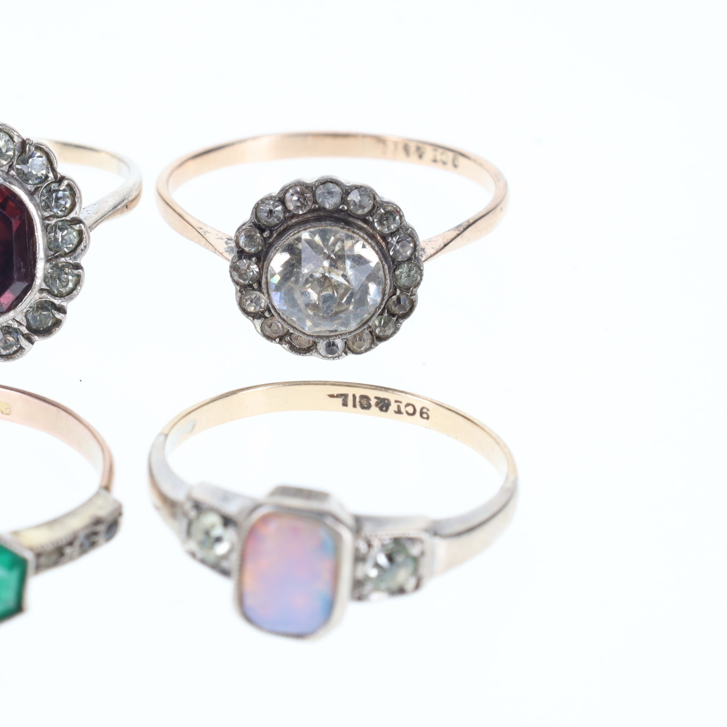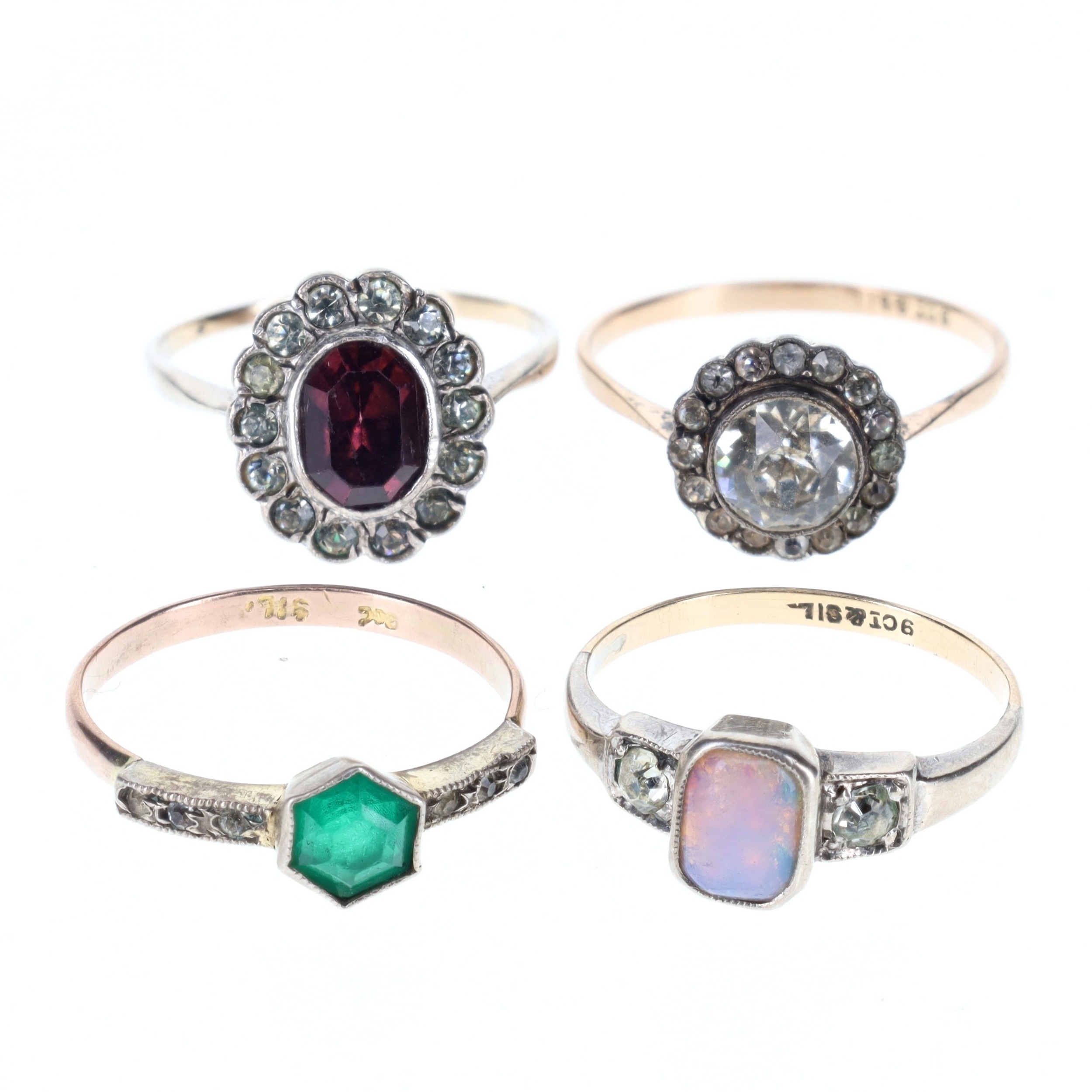 9ct Gold and Silver Paste Dress Ring Collection. 9ct gold shanks and silver settings. There are a variety of sizes. Each ring is stamped on the inside of the band. All stones are intact, some wear to facet edges. Weighs in total 7.28g.