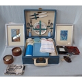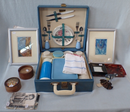 A TWO-PERSON BREXTON PICNIC BOX AND SUNDRIES including a light blue two-person picnic box, two framed paintings by Josephine de Beauchamp, post cards and other sundries