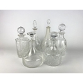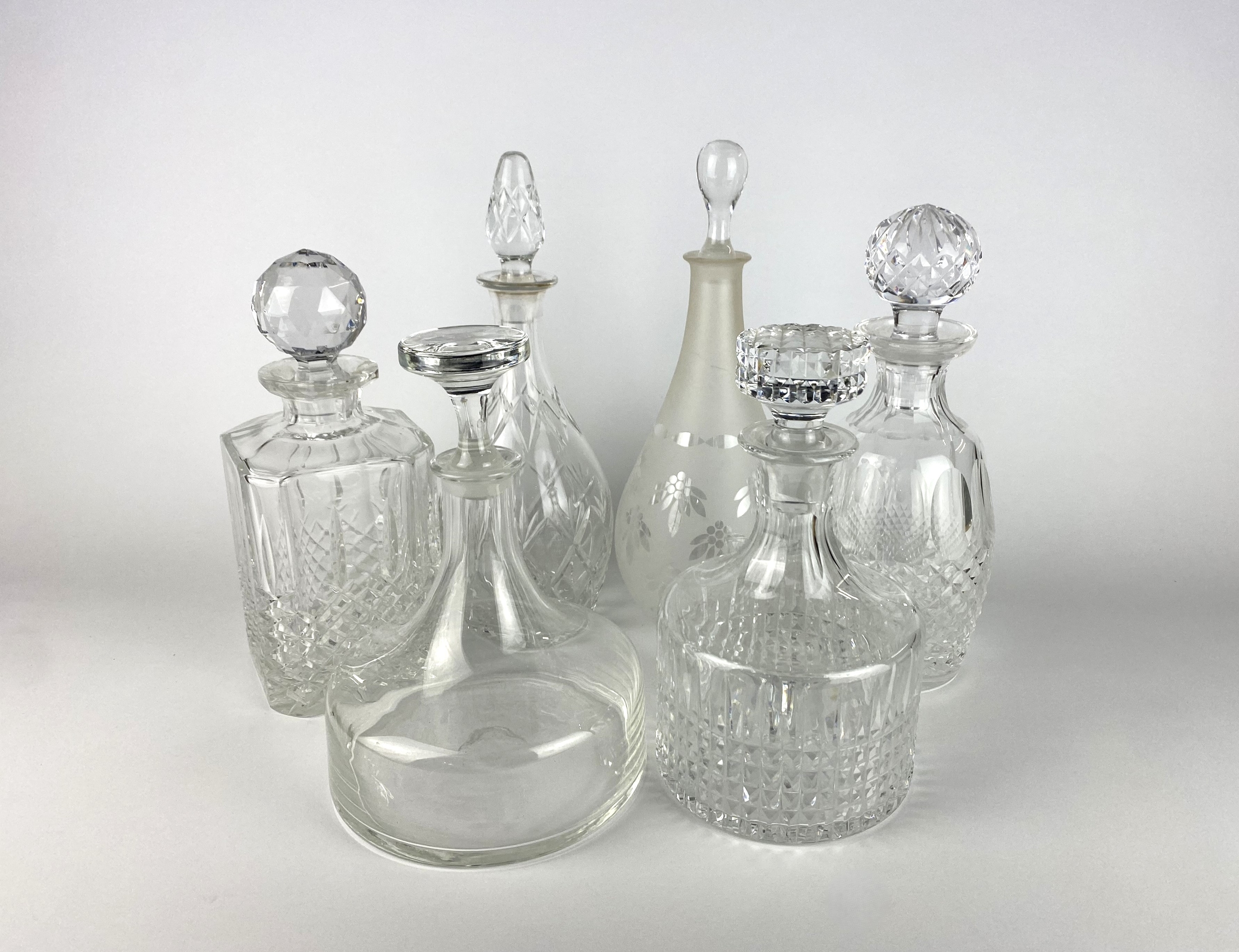 A cut glass decanter, 20th century, of square form, together with three further cut glass decanters, a modern clear glass ships decanter and a frosted decanter, the tallest 30.5cm (6)