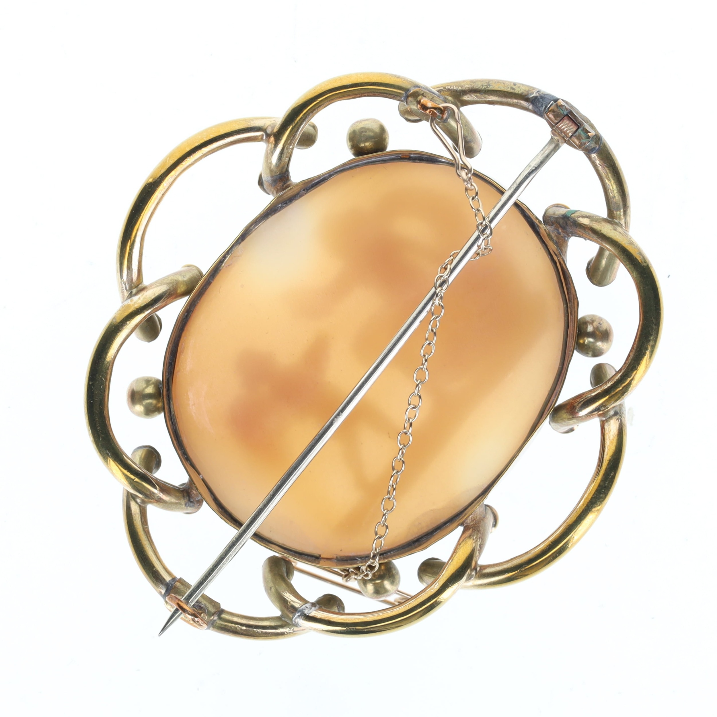 Antique Shell Cameo Cupid Brooch. The safety chain has been tested as 9ct gold. This brooch is in excellent condition. Measures approx. 7 x 5.8cm. Weighs in total 22.5g.