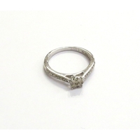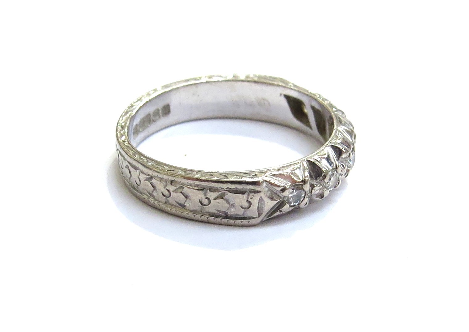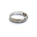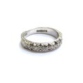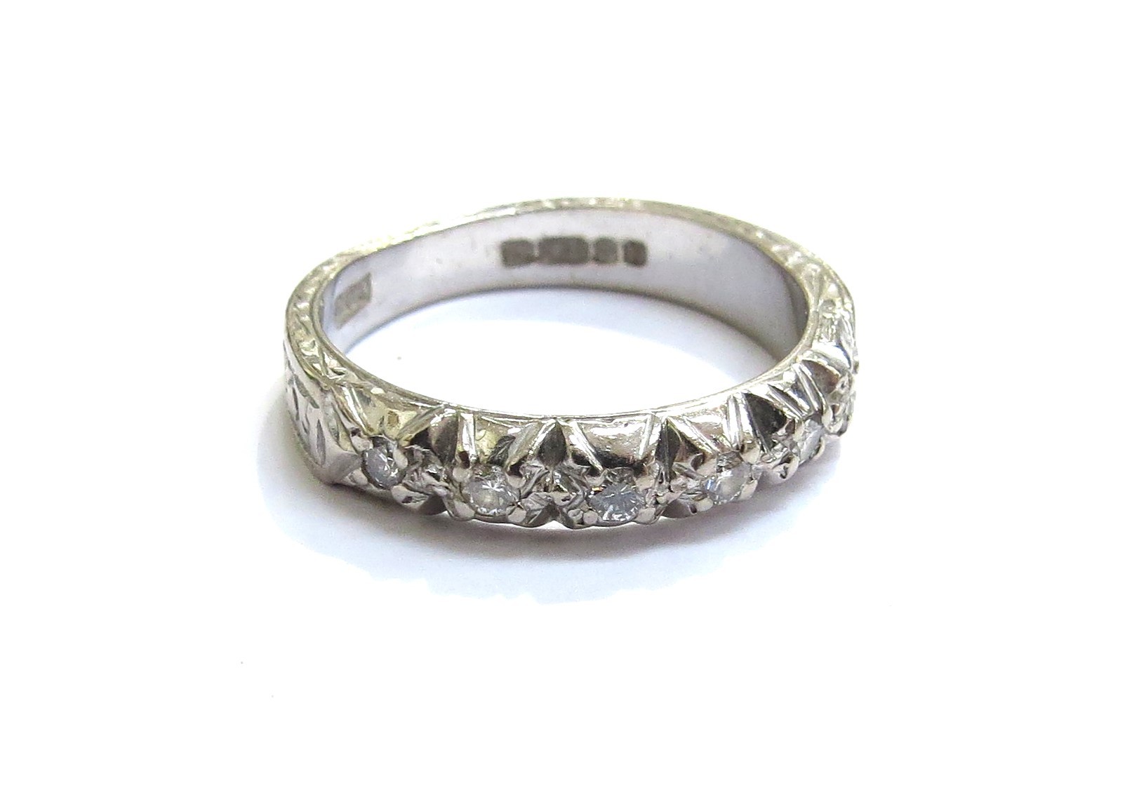 An 18ct white gold half hoop diamond ring, with carved patterned shank. Size J, 3.5g