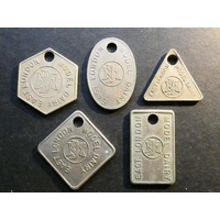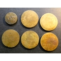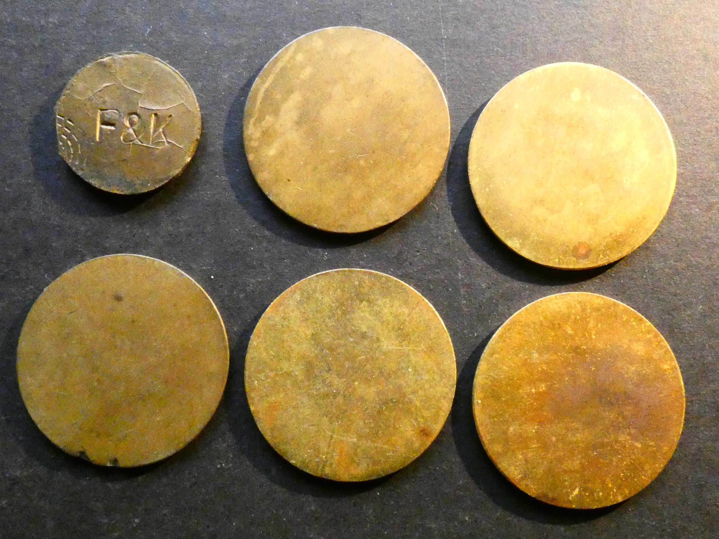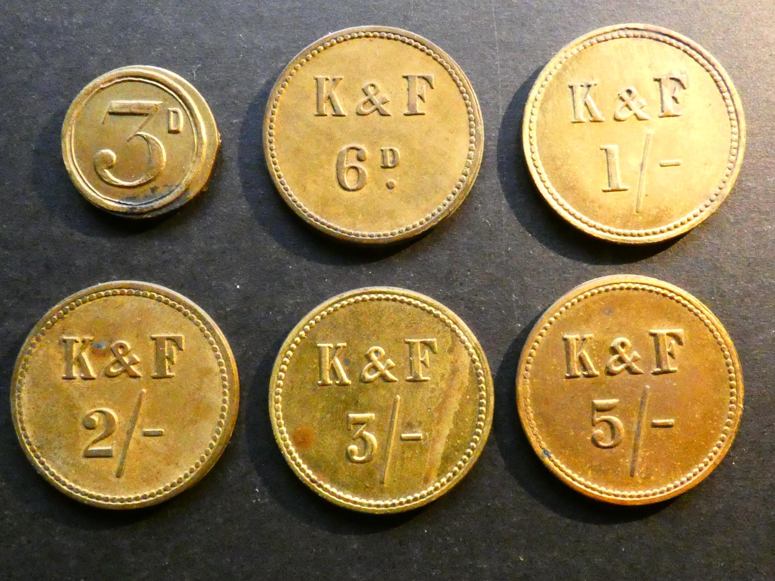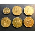 TOKENS - SOUTH AFRICA. Natal, Dannhauser, set of Kleinman & Finchen mine tokens, circa 1930, Hern-314, obverse; K & F above various denominations (6d, 1/-, 2/-, 3/- & 5/-) within beaded border, reverse blank, 29mm, brass, plus 3d, reverse stamped F & K, 20mm brass, VF to EF+ (6)