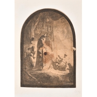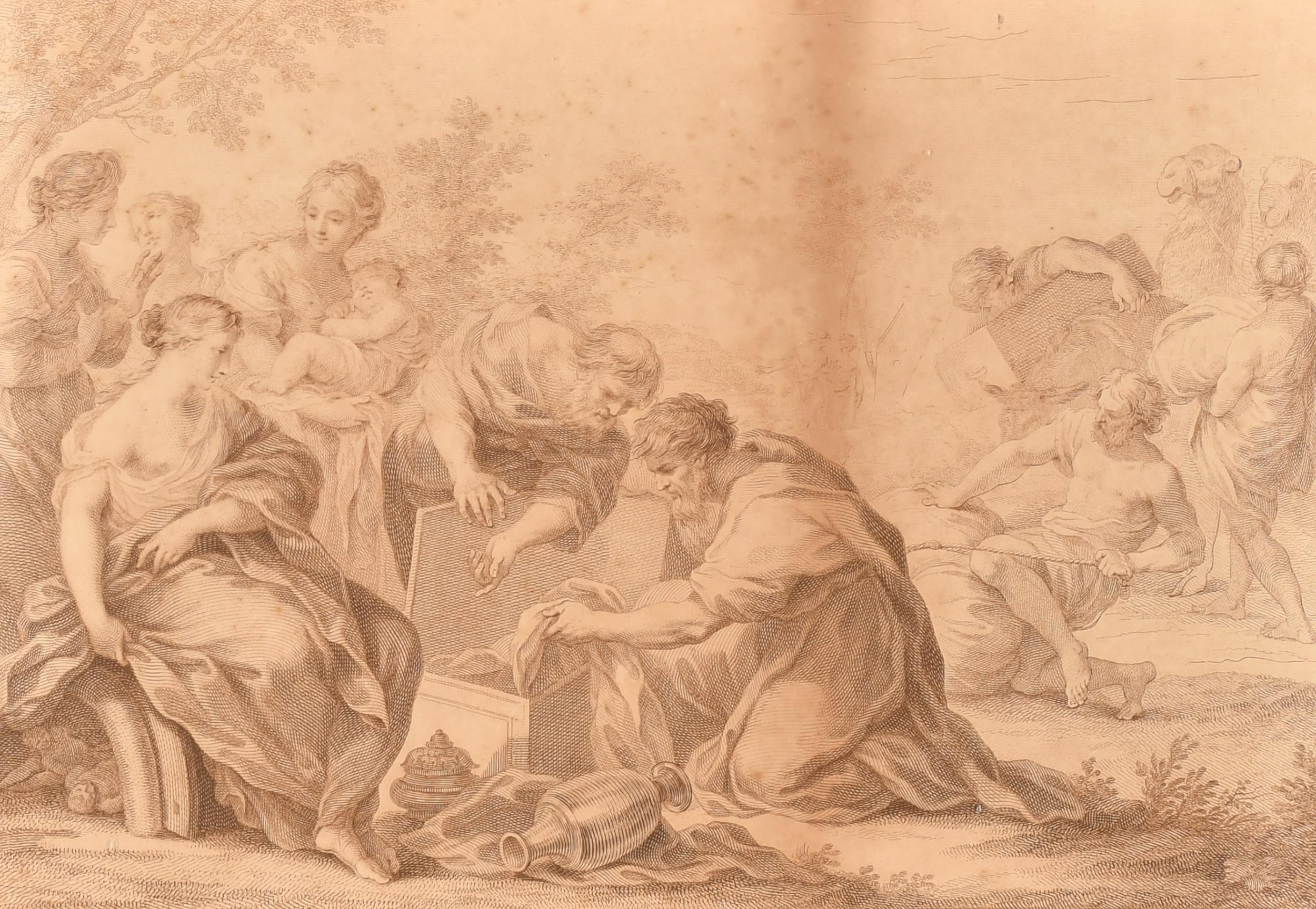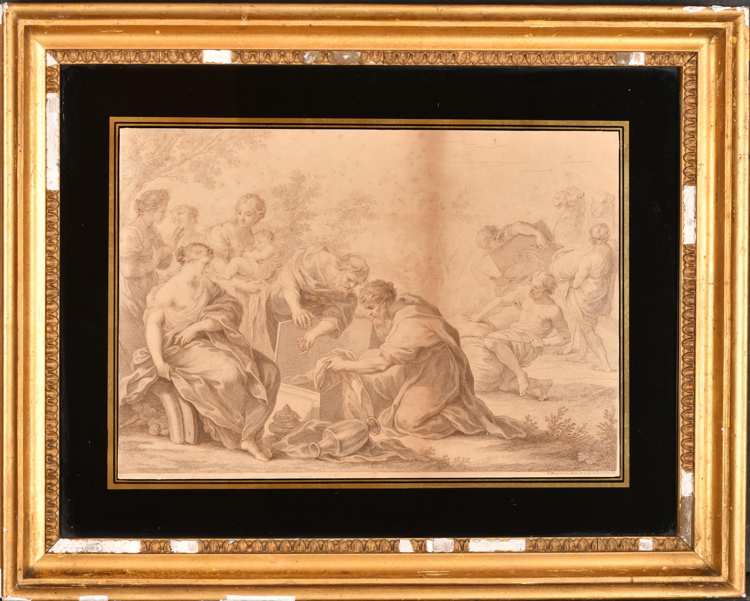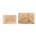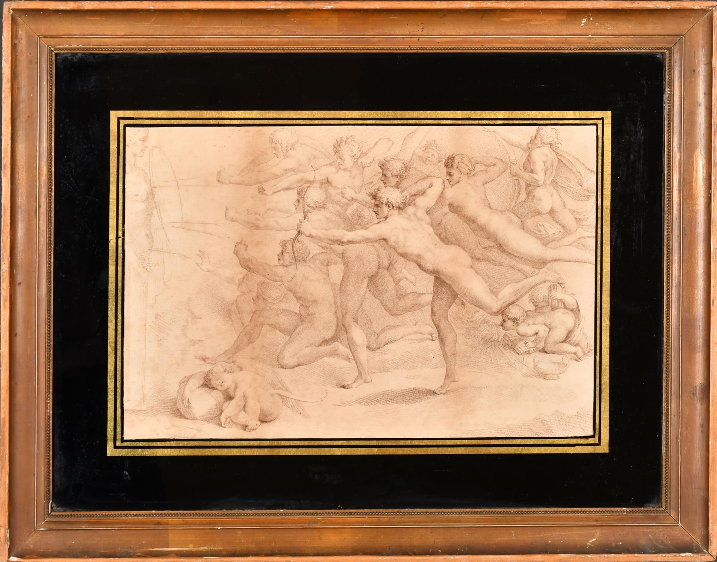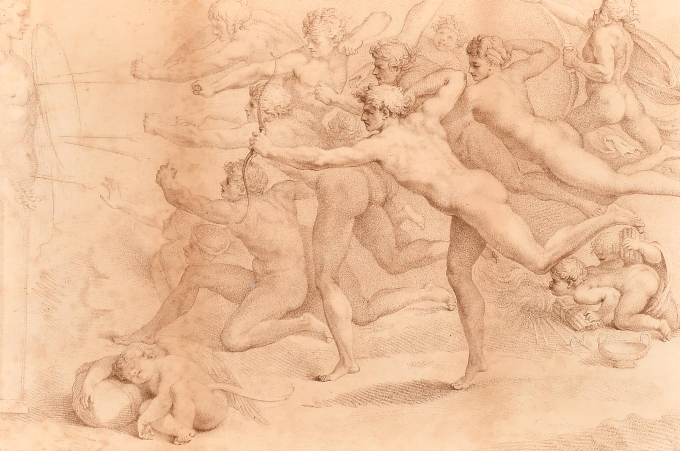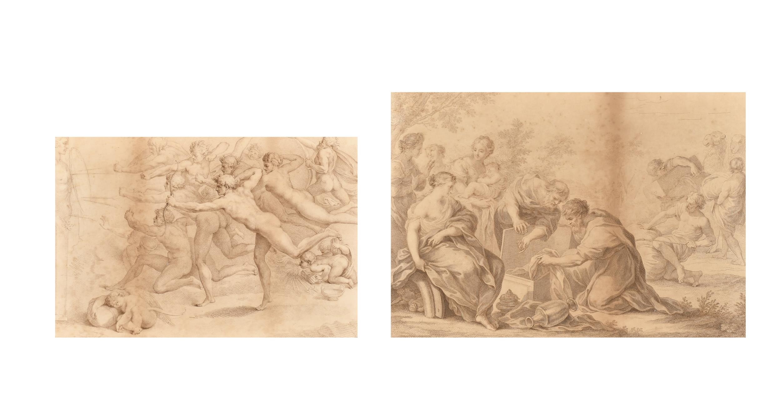 After Michelangelo di Lodovico Buonarroti Simoni (1475-1564) Italian. "Archers Shooting at a Herm", Engraved by Bartolozzi, In a gilt frame with eglomise glass, 8.25" x 12.5" (20.8 x 31.7cm) and another by the same hand, 10.25" x 14.75" (26 x 37.4cm) (2)