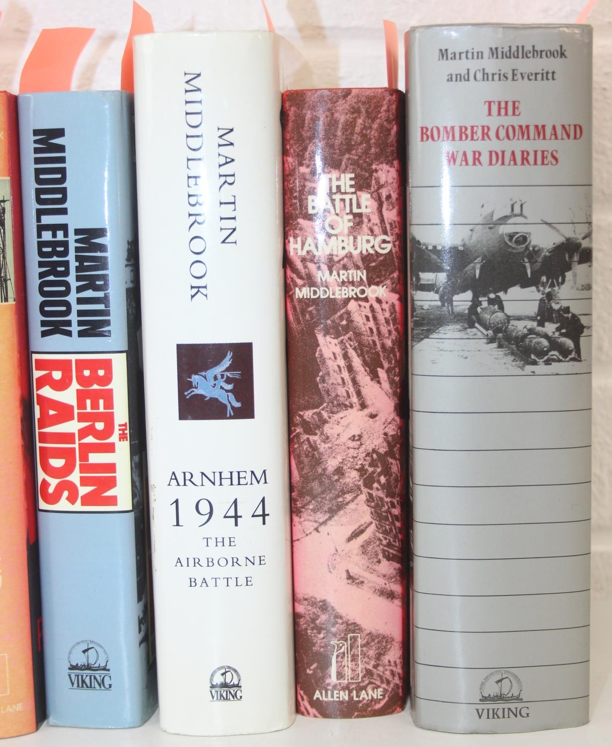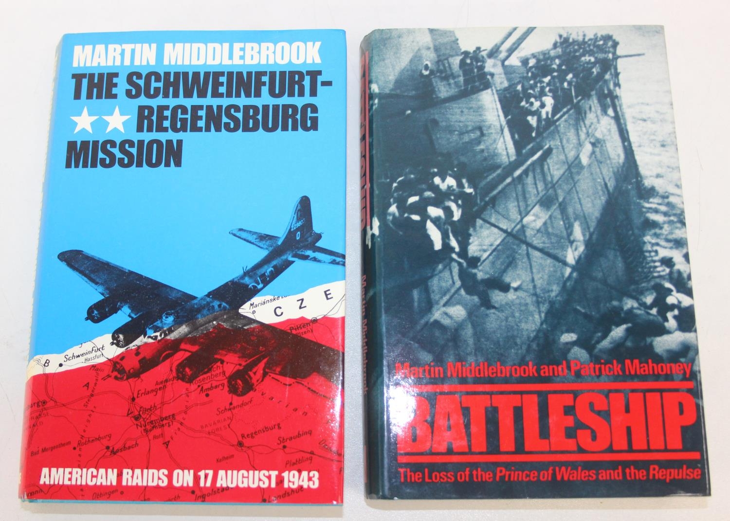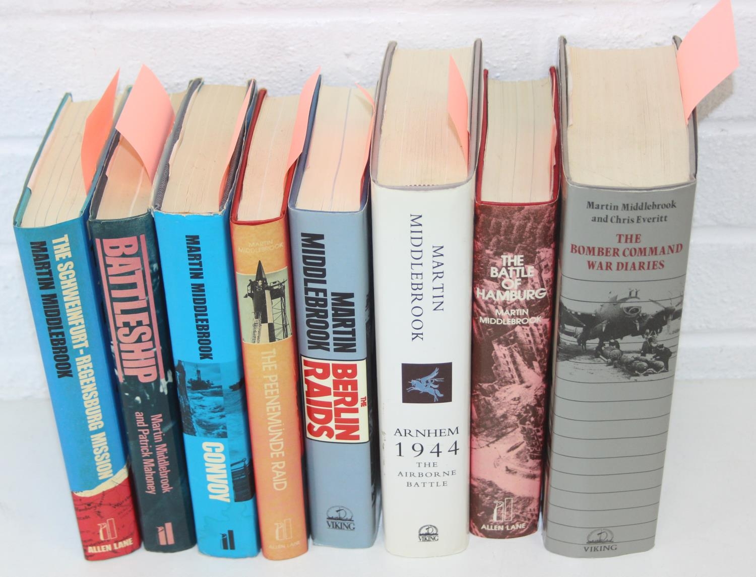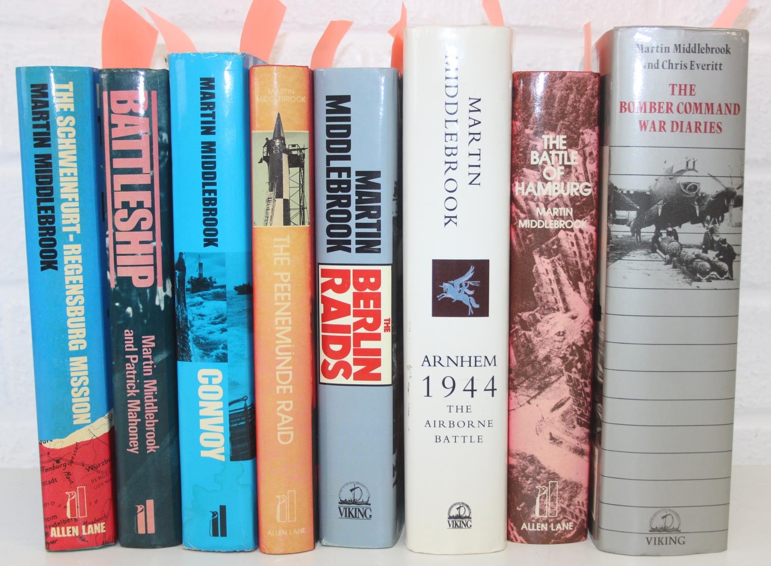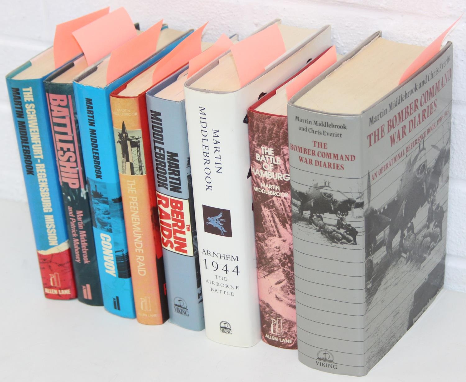 Eight WW2 interest books by renowned military historian Martin Middlebrook, all signed by the author, most with dedications, titles include 'The Schweinfurt-Regensburg Mission', 'The Berlin Raids', 'The Peenemunde Raid', 'Convoy', 'The Battle of Hamburg', Arnhem 1944', 'The Bomber Command War Diaries' and 'Battleship' which is also signed by co-author Patrick Mahoney [8]